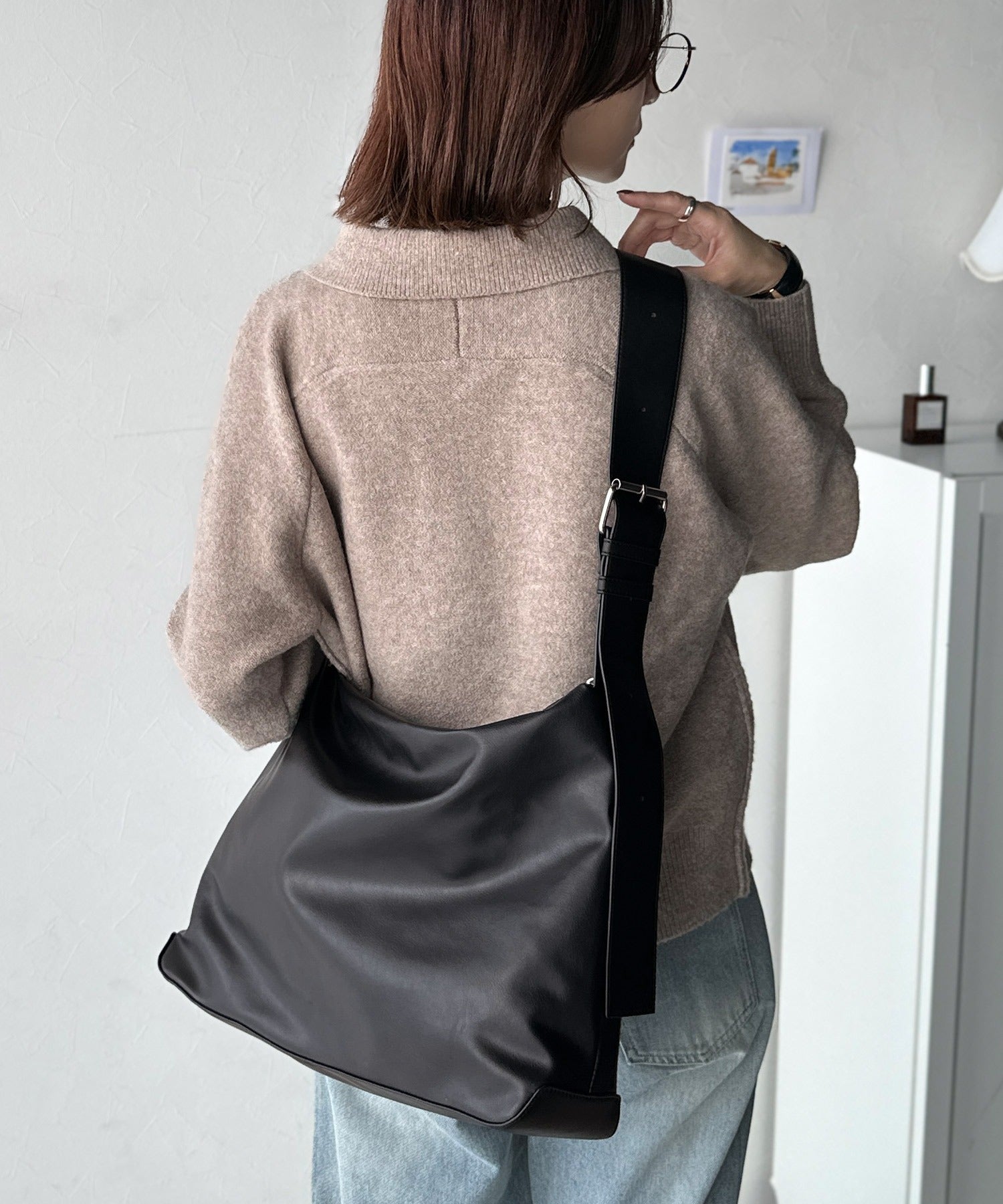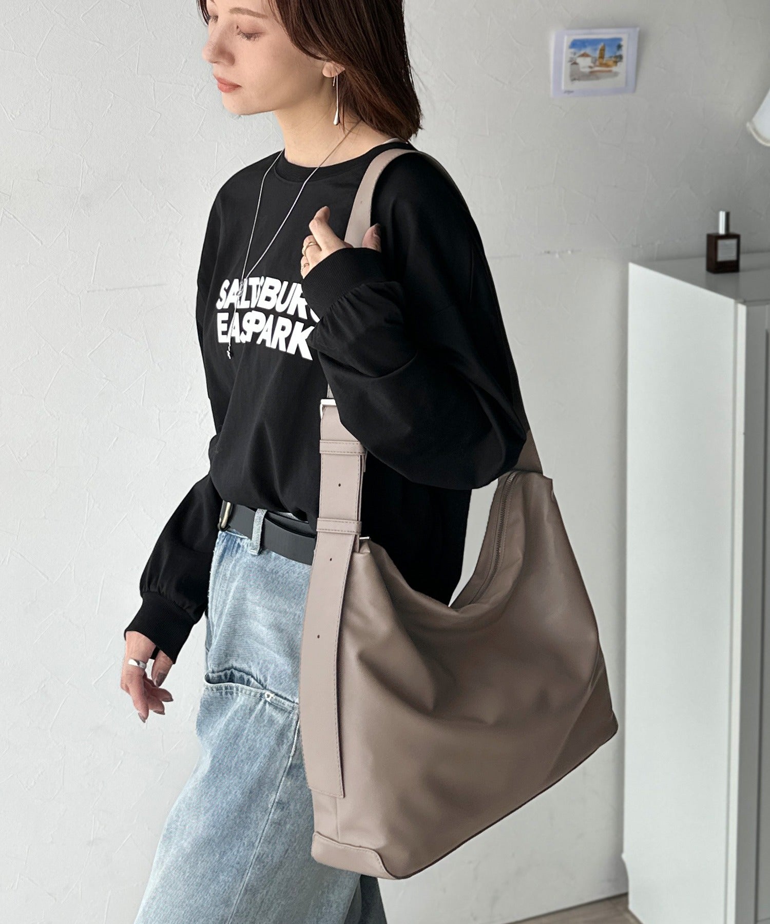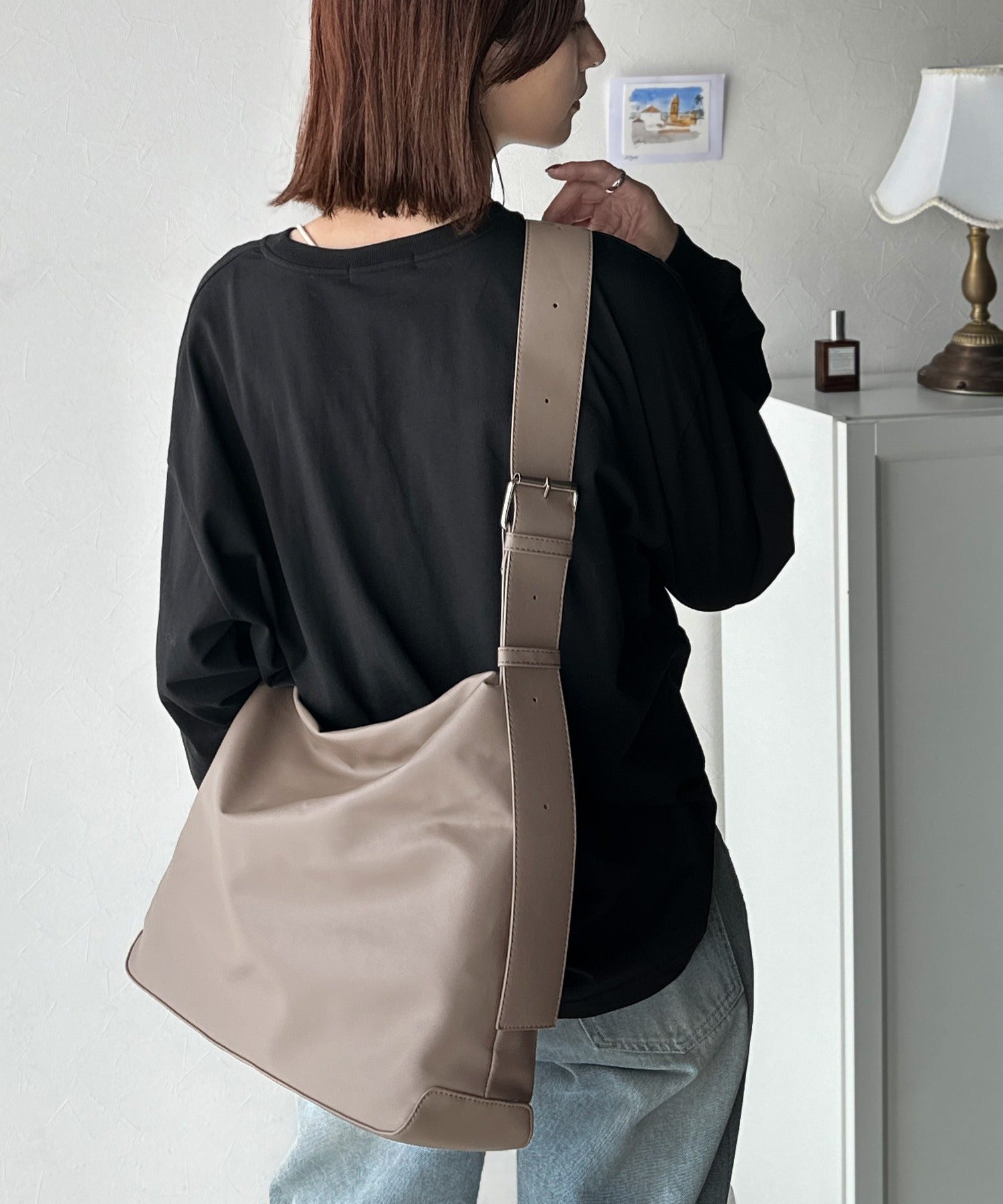 ワイドストラップがアクセントになり、荷物が多い日でも肩への負担を軽減。