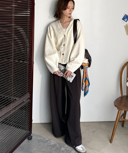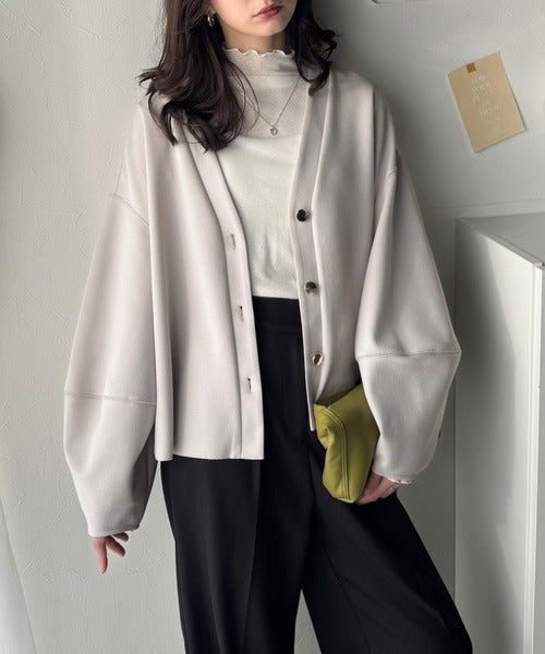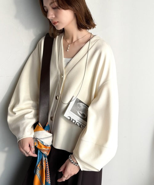 今季のトレンド、ランタンスリーブが特徴のVネックカーディガン。
