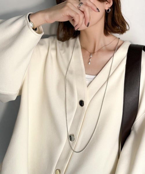 金属ボタンが大人の品を添えます。ヒップにかかる着丈で