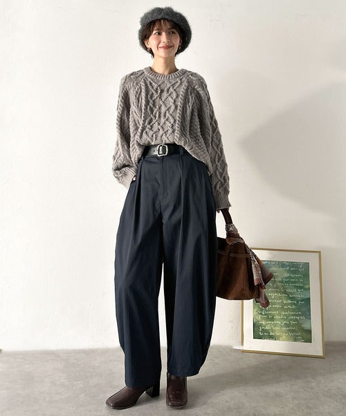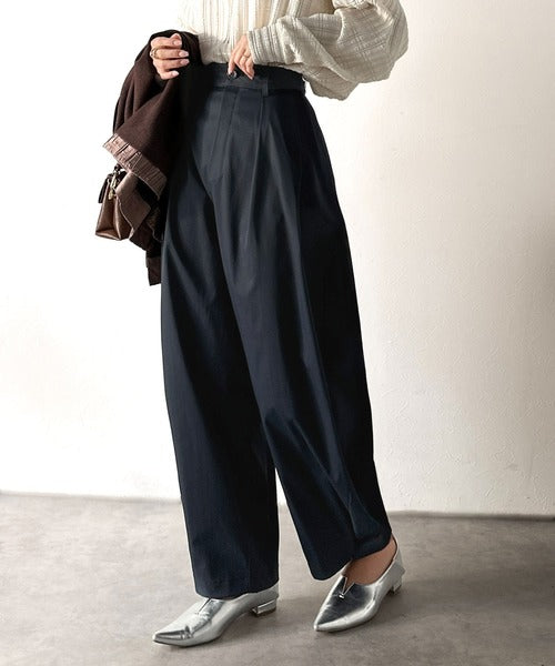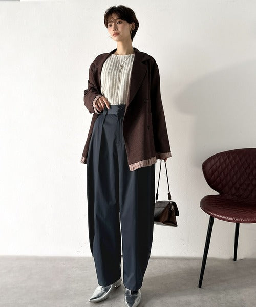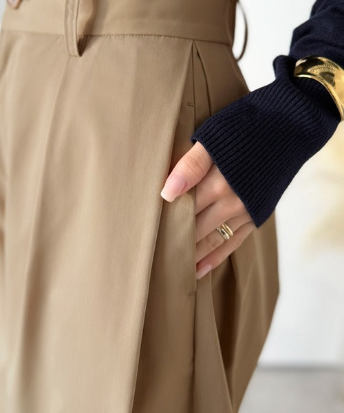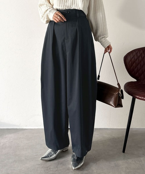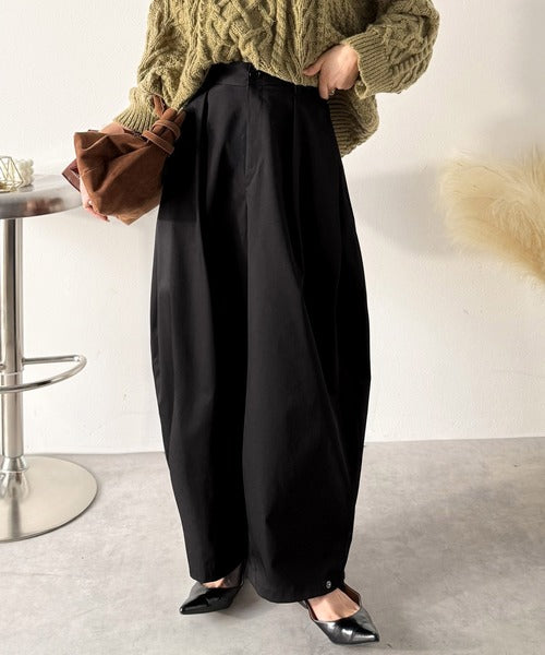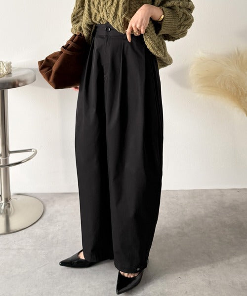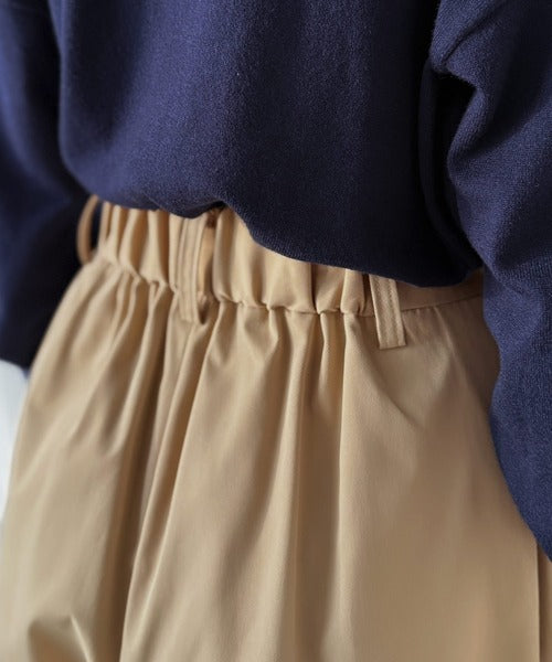 サイドの深いタックが縦の陰影をつくり、腰まわりはすっきり全体はたっぷりとしたシルエットで体形カバーを叶えます。