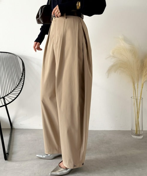 裾の外側に小さなスナップ付きで、留めればふくらみが寄ってテーパードに、外せばワイドに。