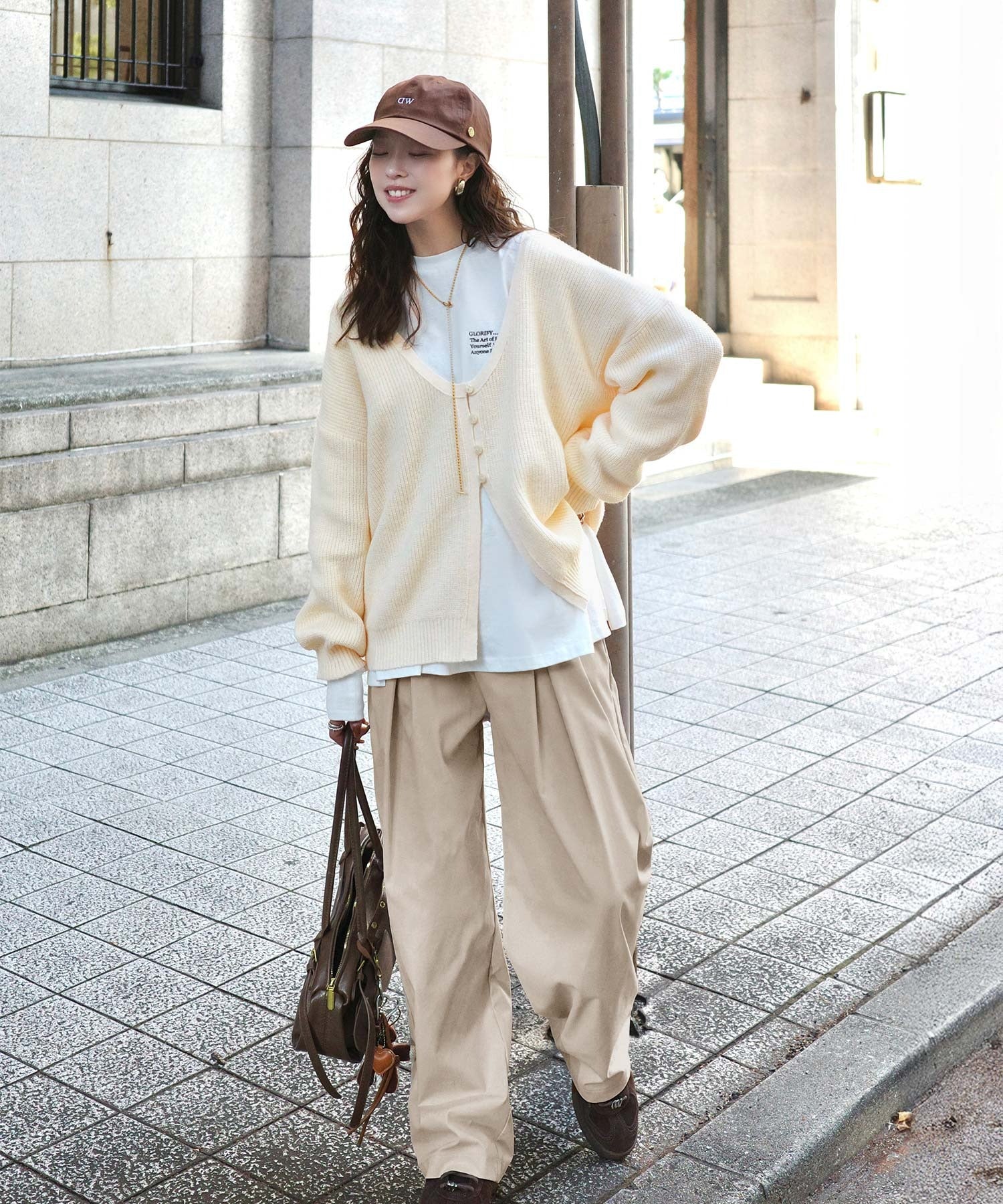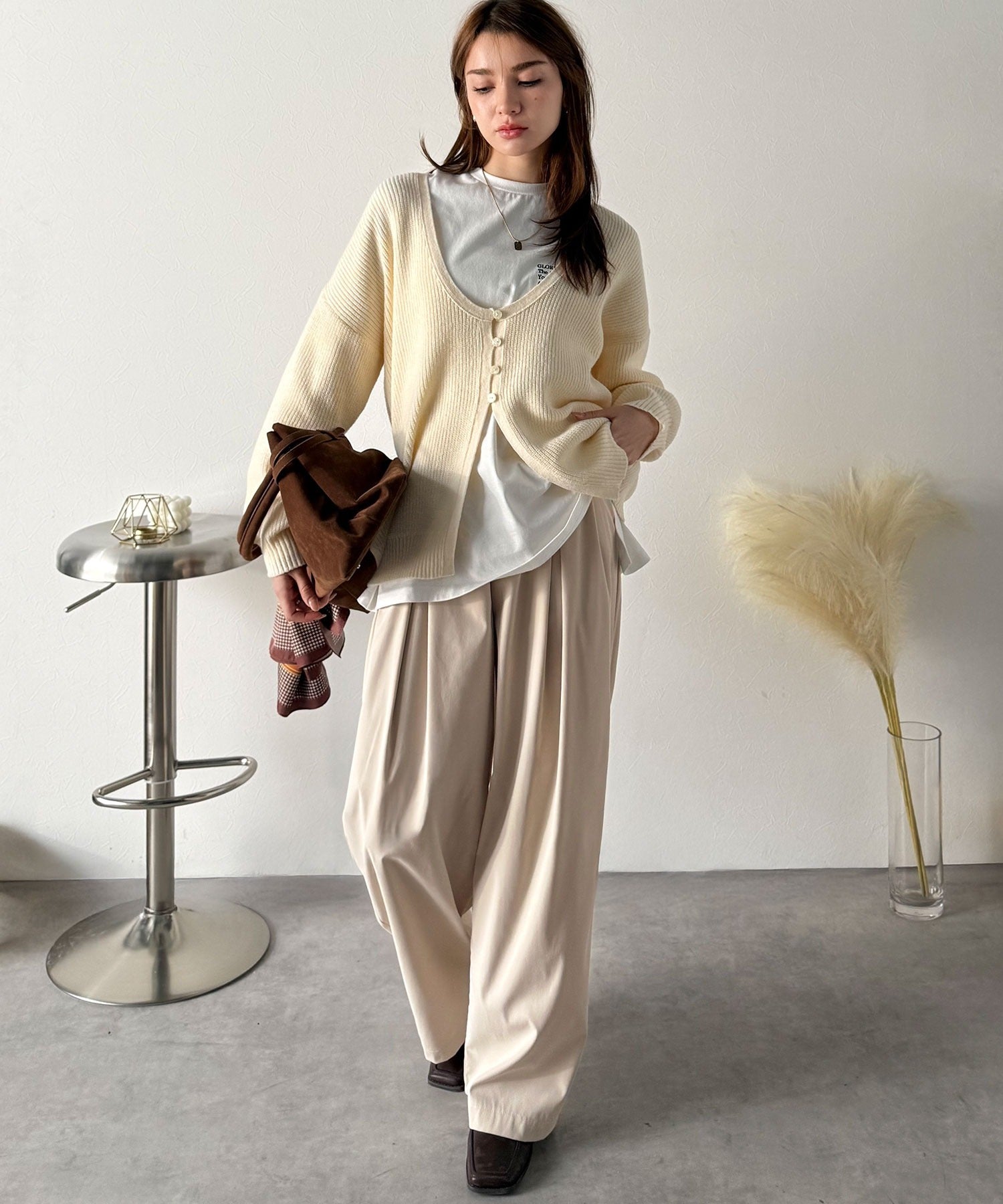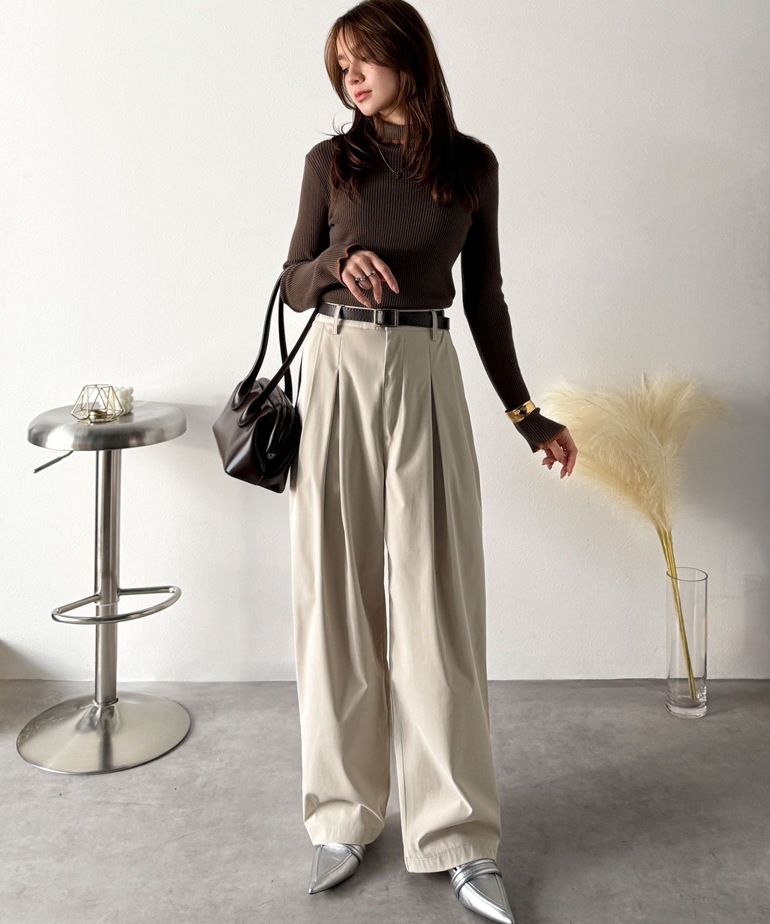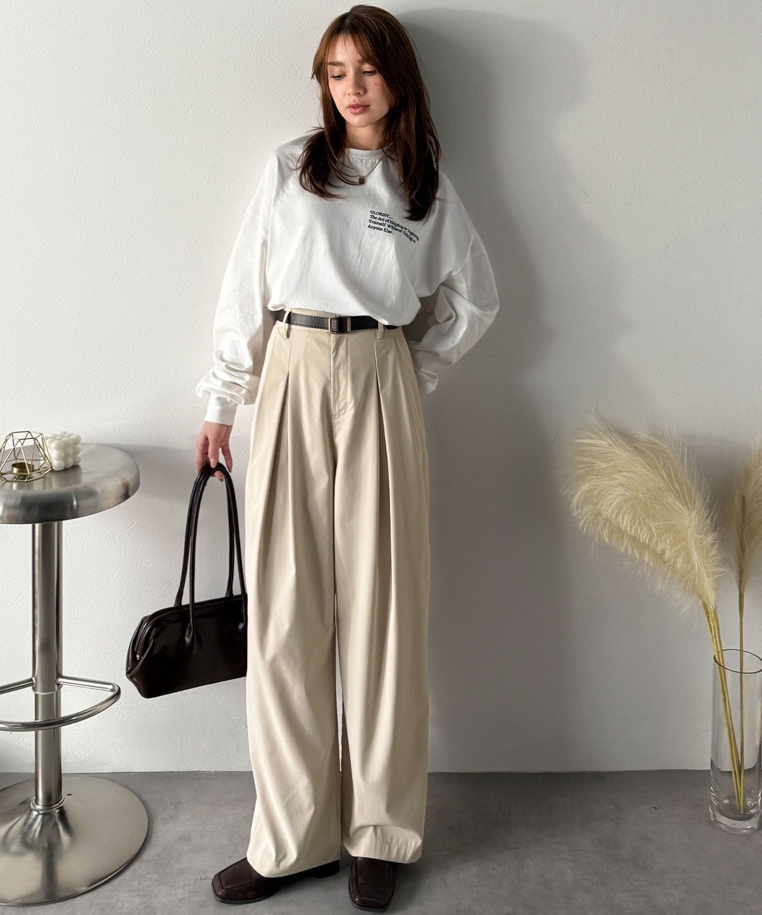 シンプルなトップスを合わせるだけで、洗練されたスタイリングが完成。