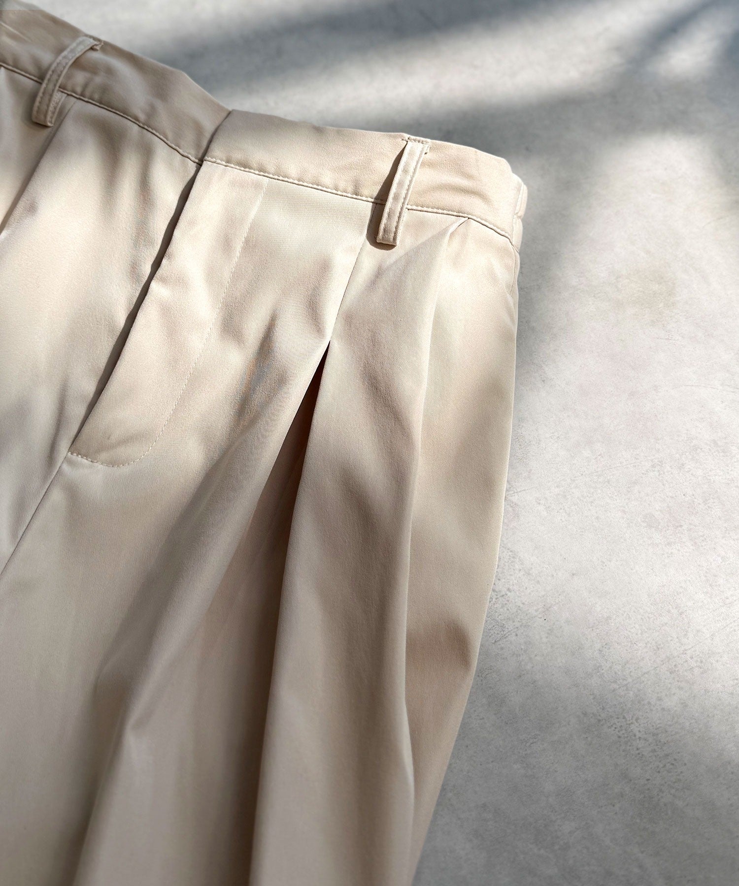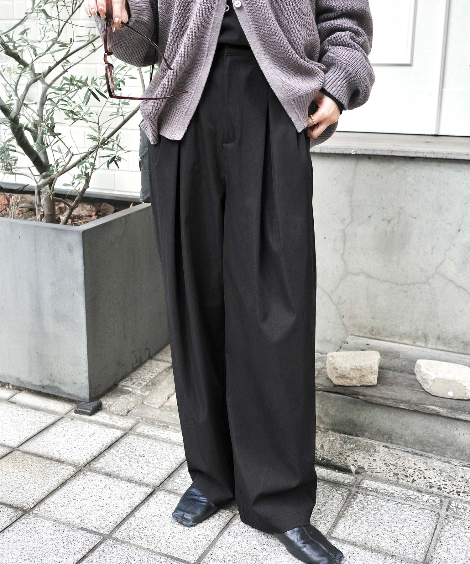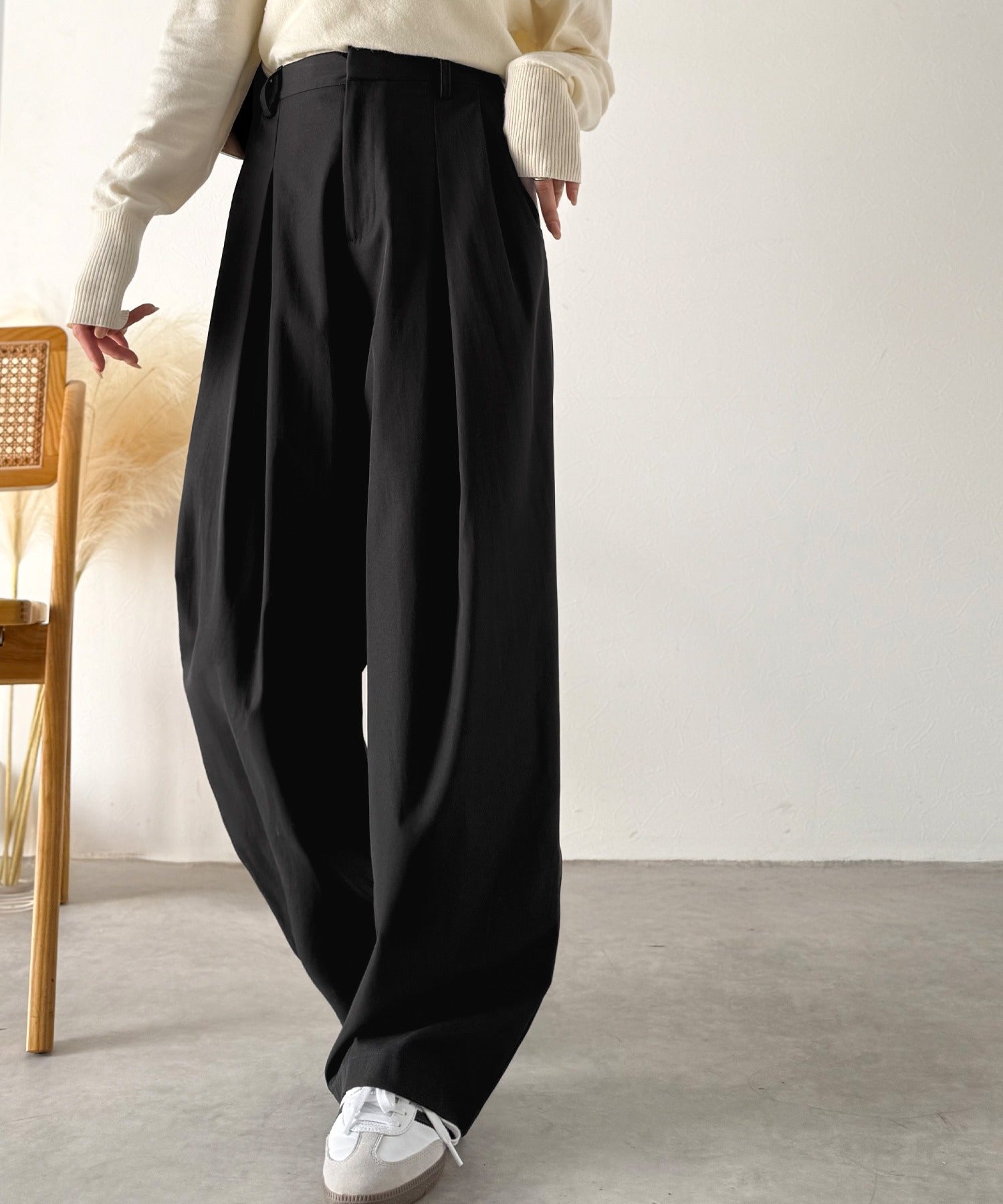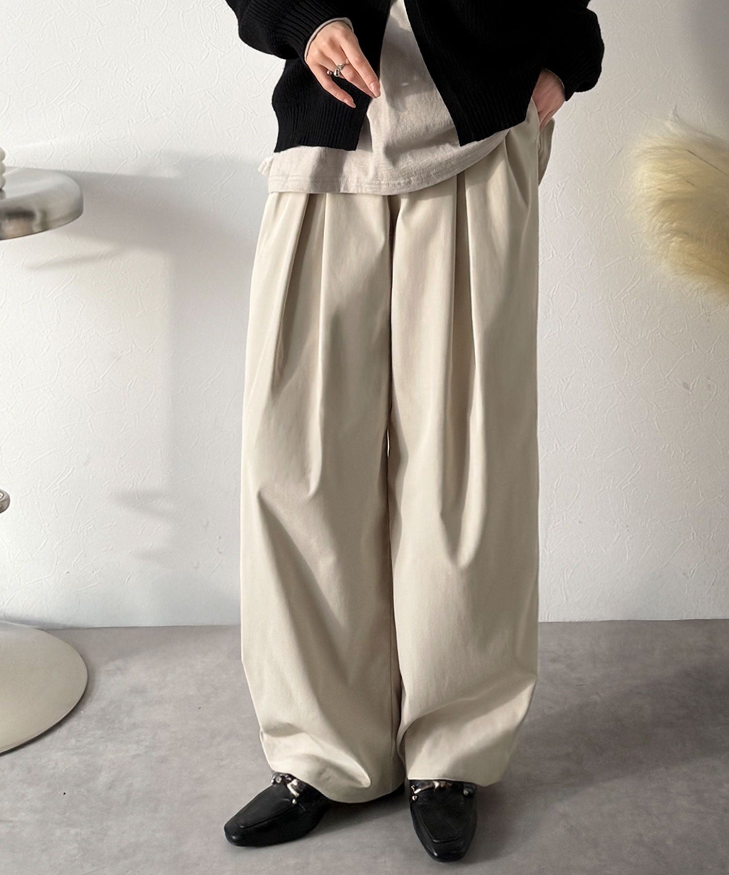 長時間の着用でも快適なリラックス感のあるタックパンツ。