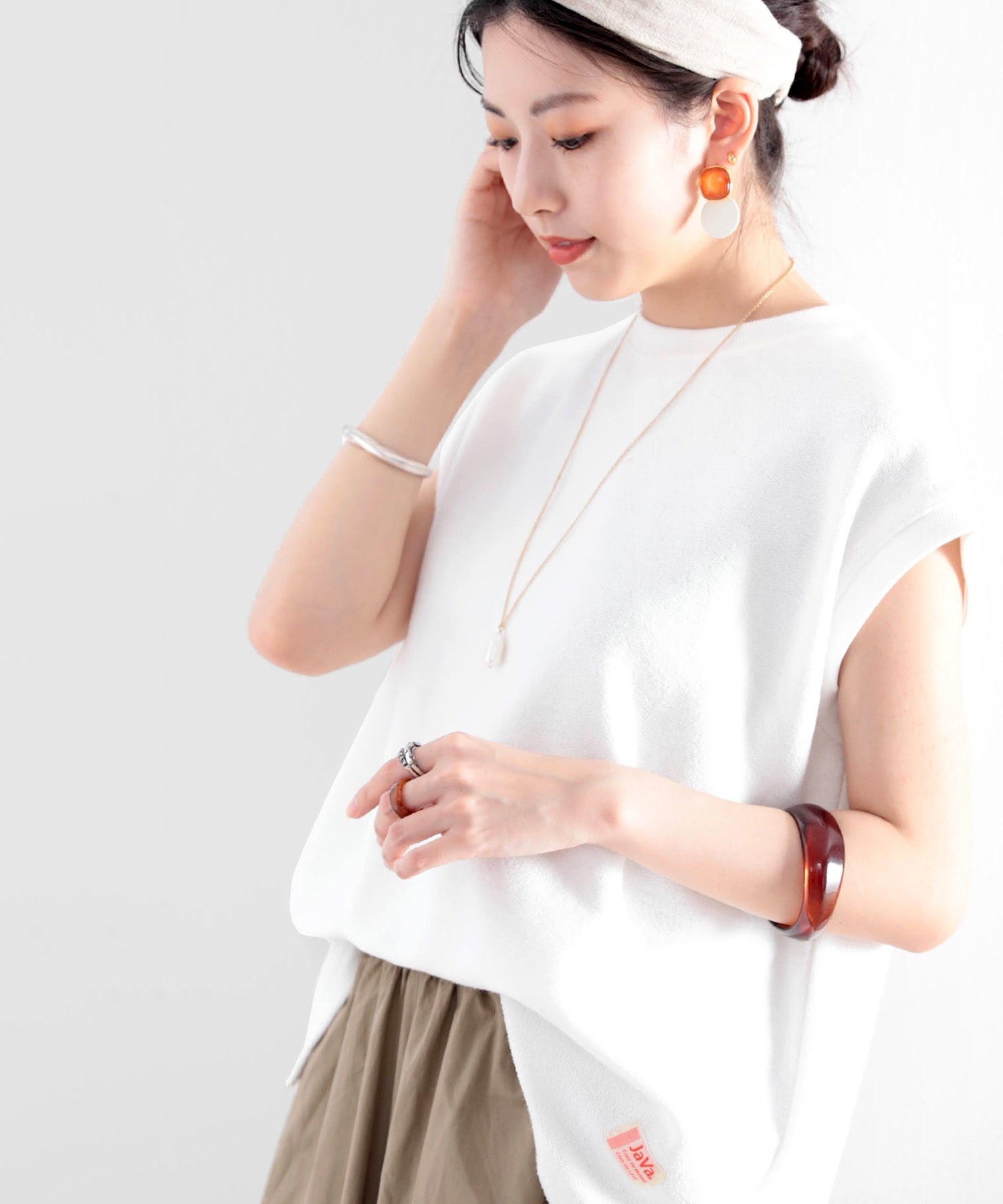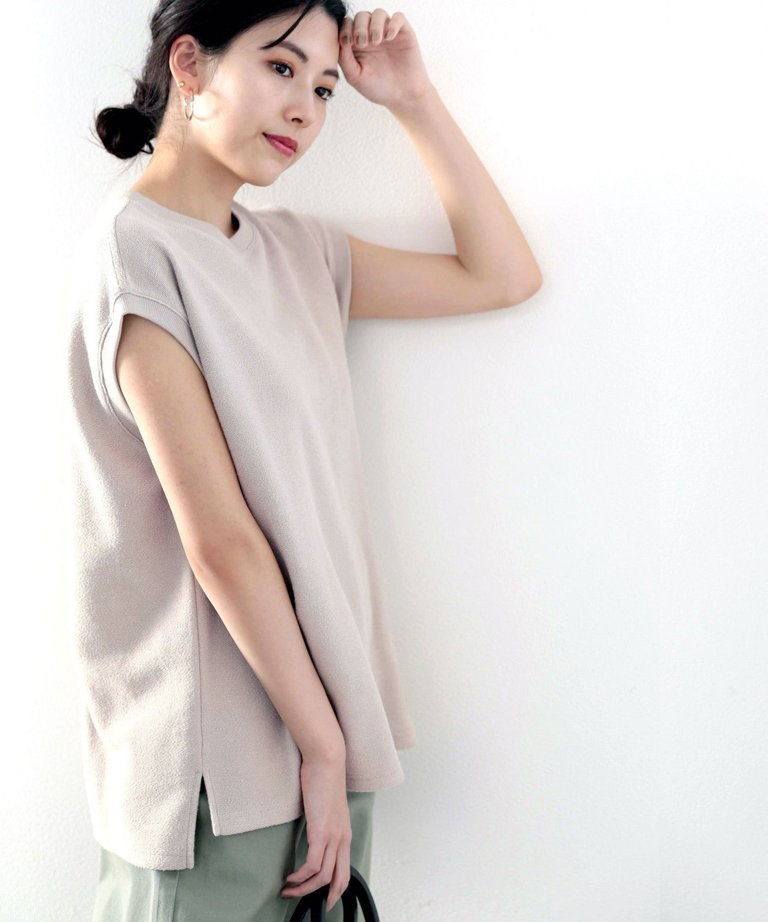 肩を程よく隠してくれるフレンチスリーブ感のあるデザインで一枚でも安心感ある形。