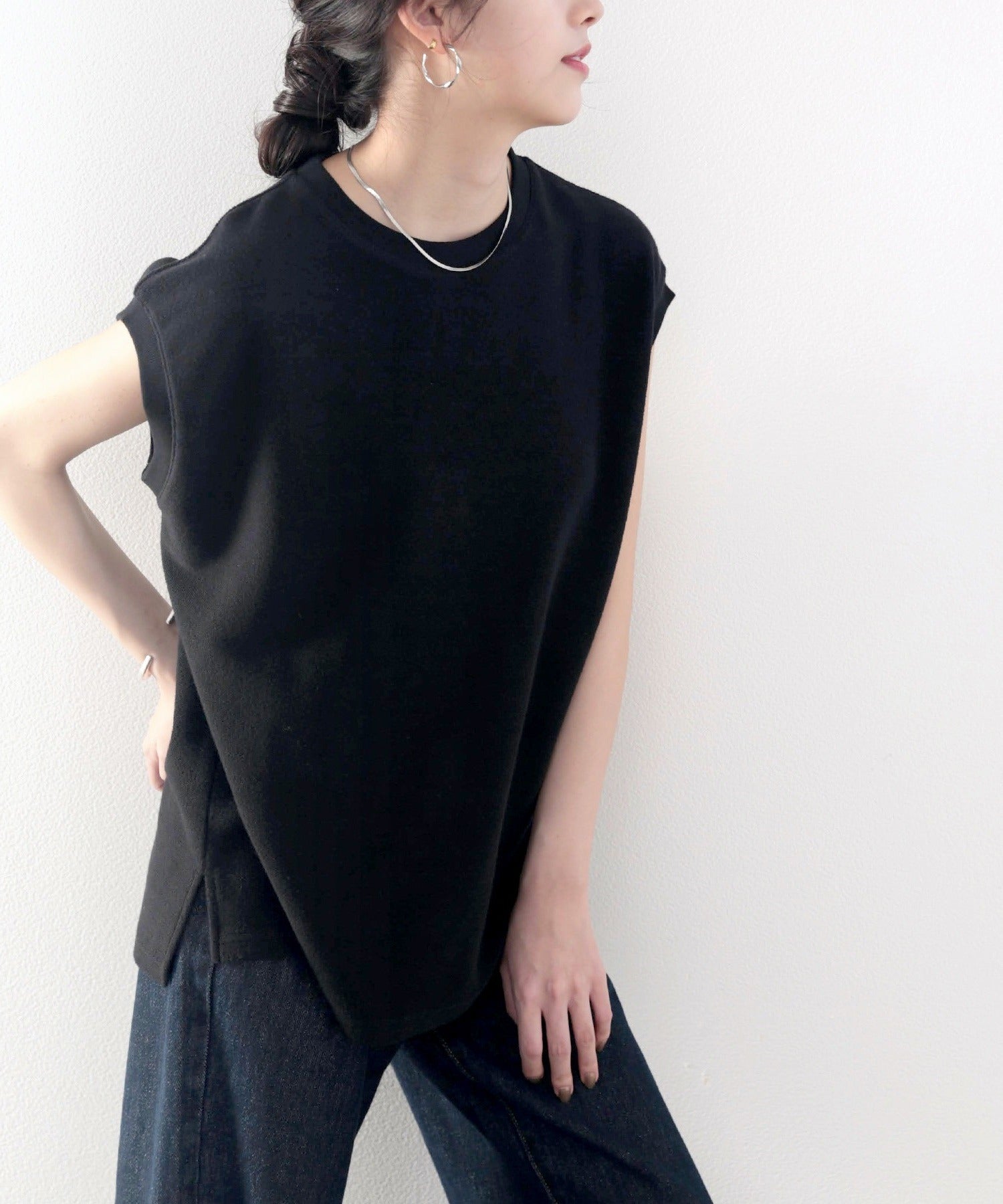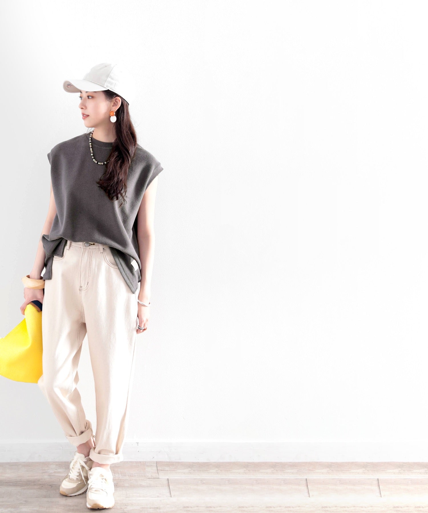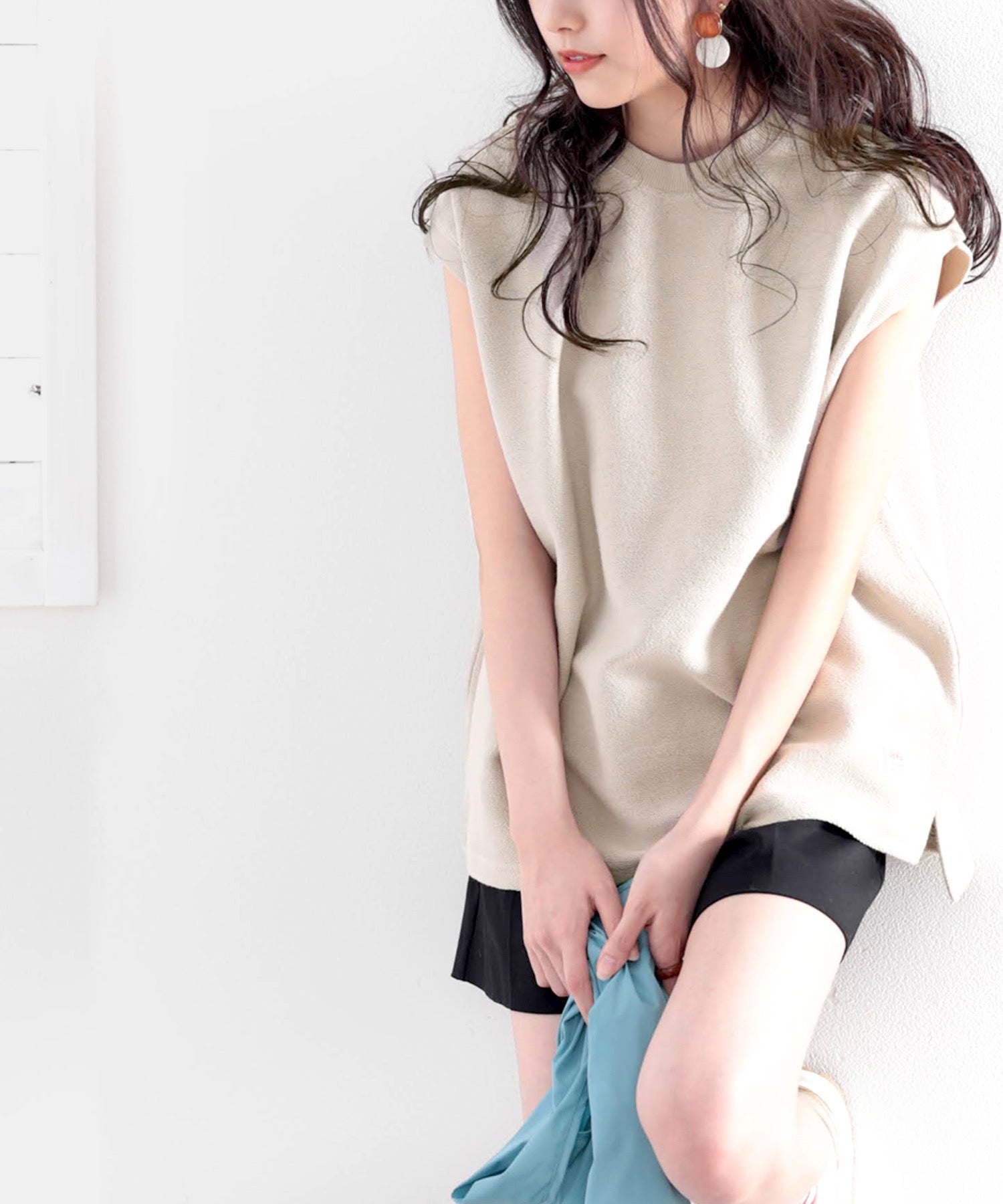 クルーネックデザインはノースリーブで抜け感を出し、バランスの取れたシルエットに。