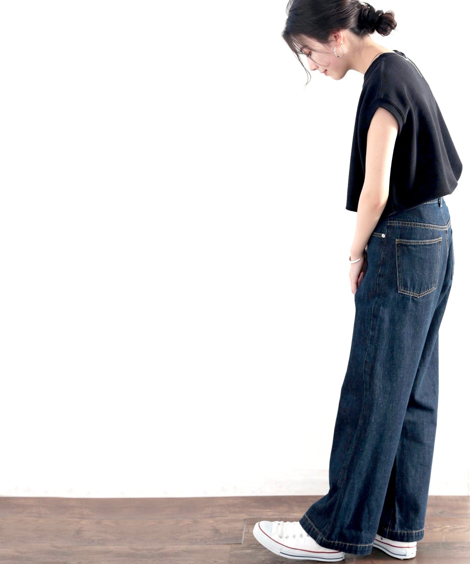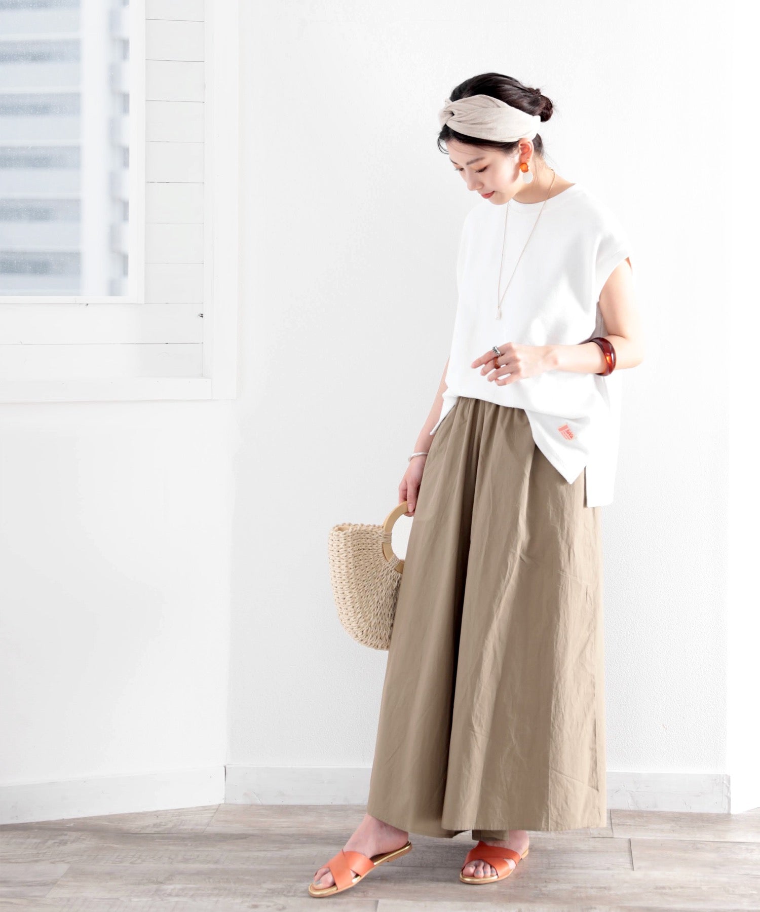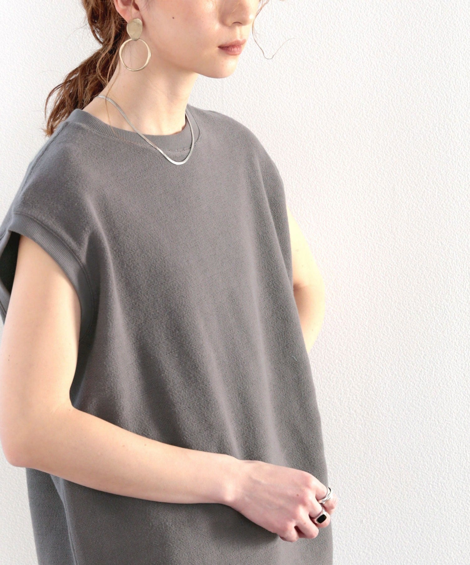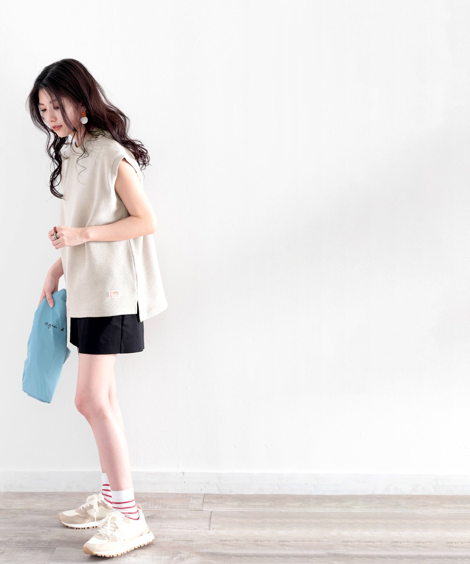 クルーネックデザインはノースリーブで抜け感を出し、バランスの取れたシルエットに。