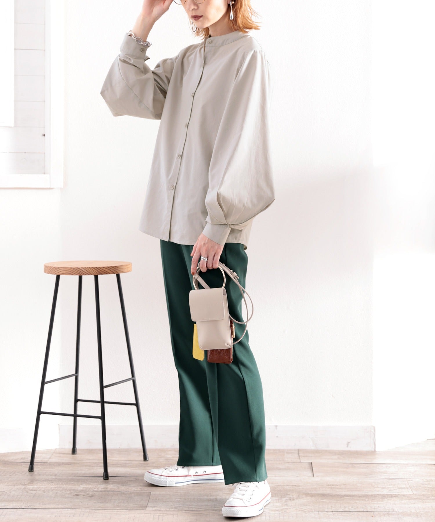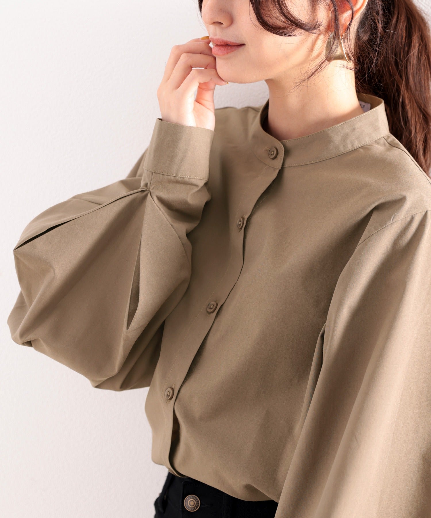 袖にポイントがあるので襟元はバンドカラーですっきりと◎