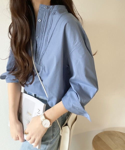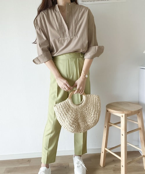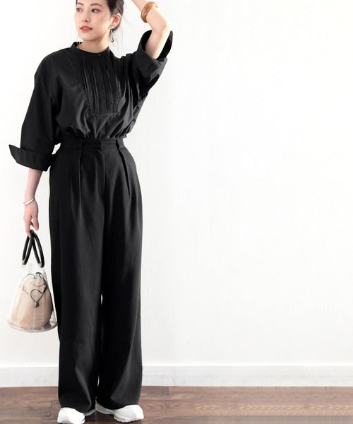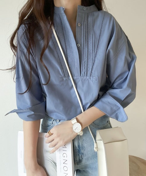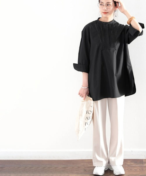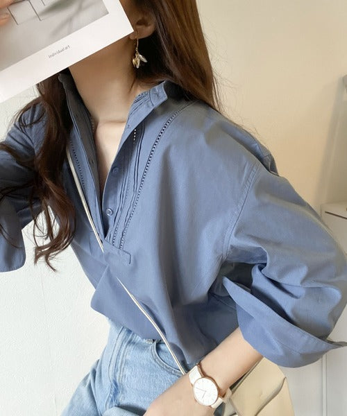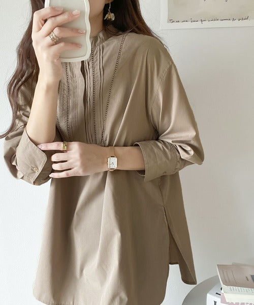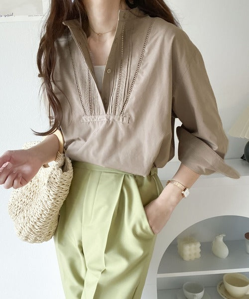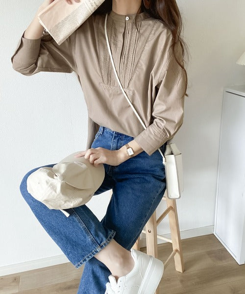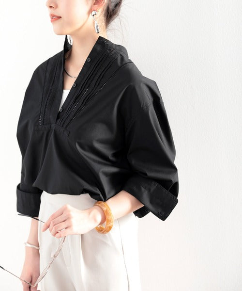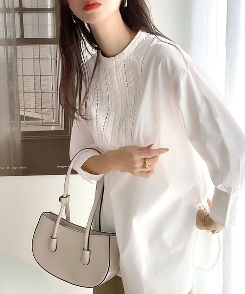 フロントにピンタックとはしごレースの切り替えデザインで、