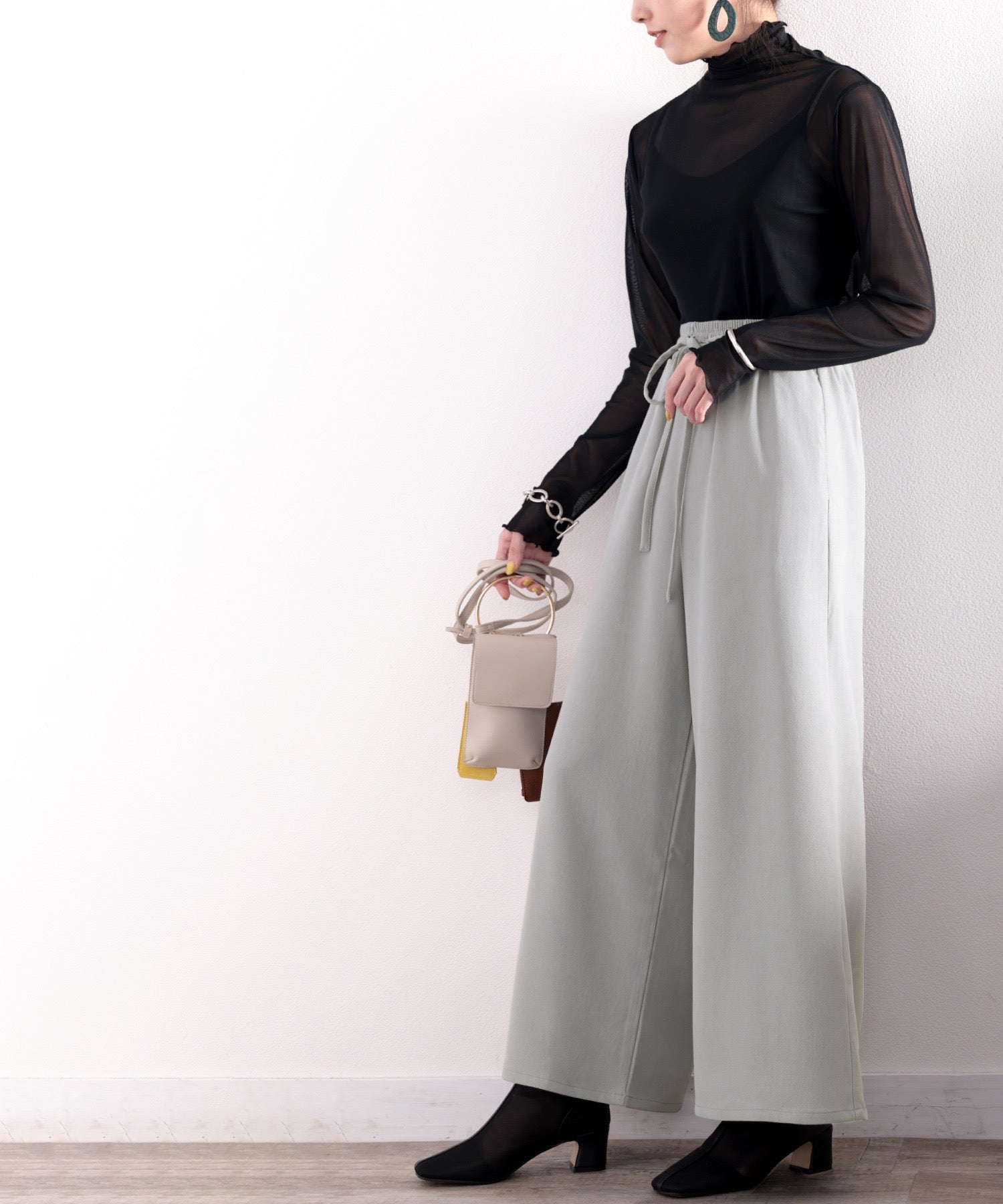 ハイウエスト×ワイドパンツはウエストを細見えする効果もあり。