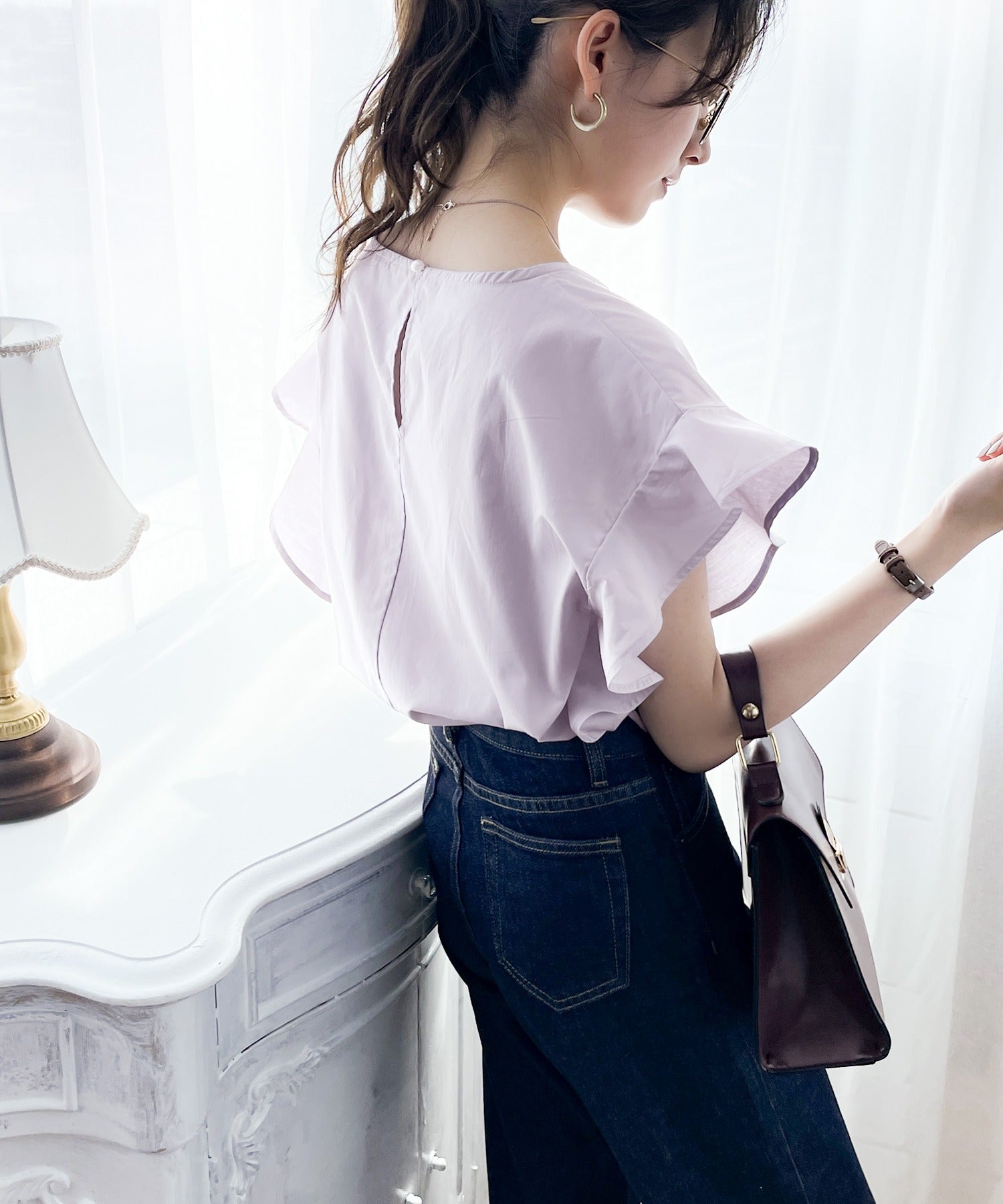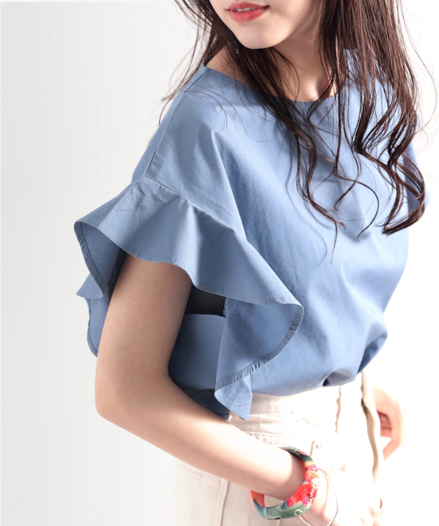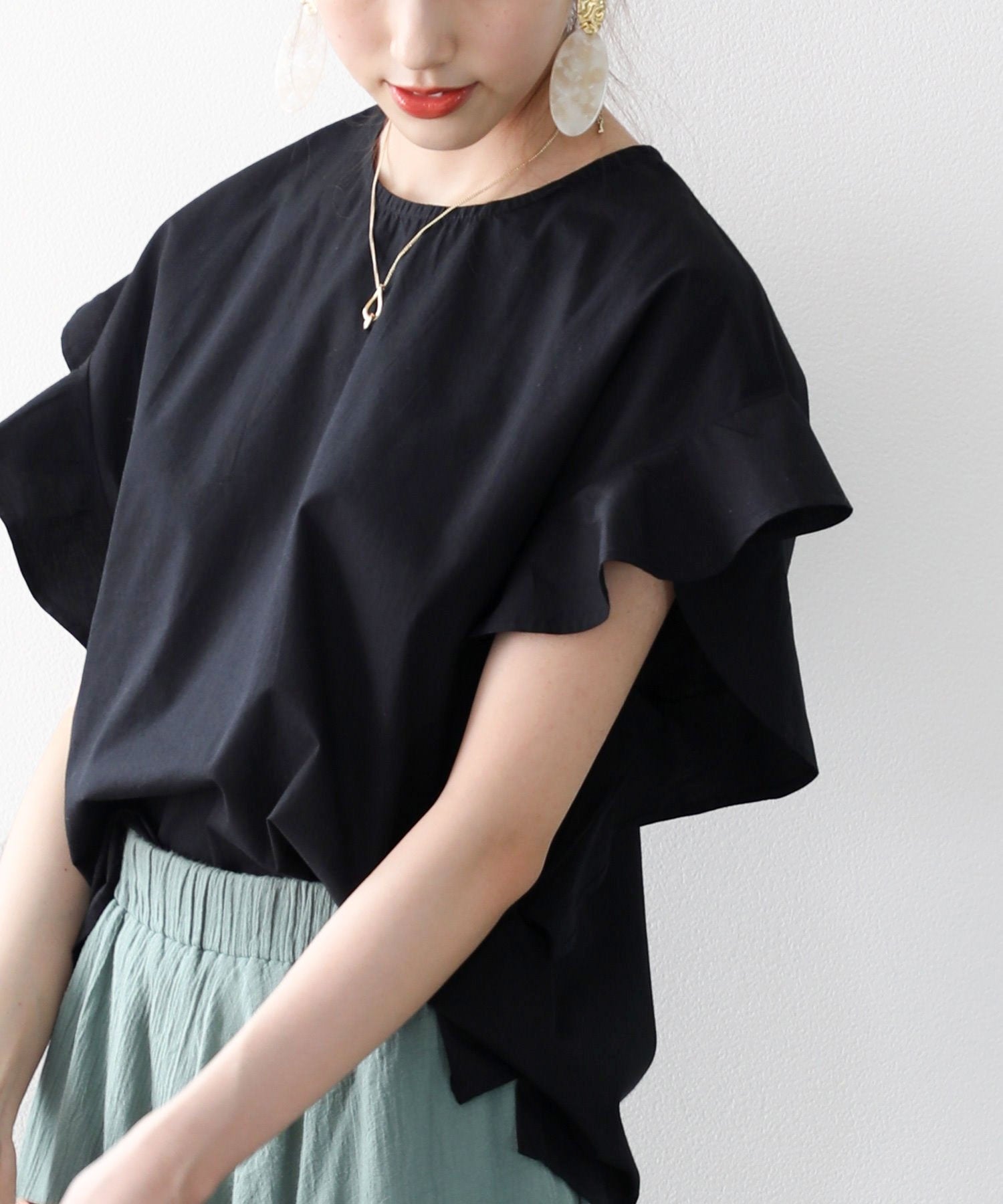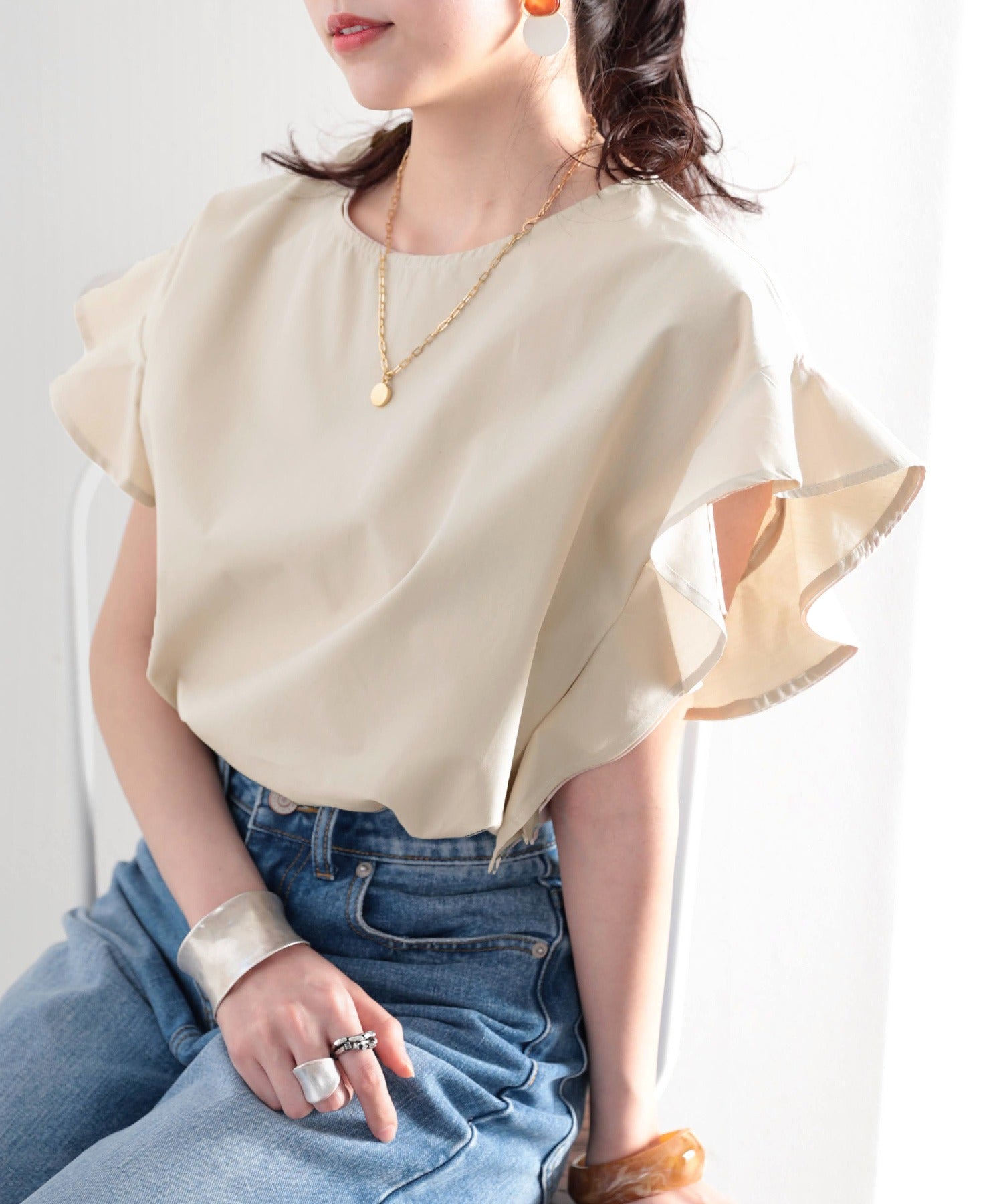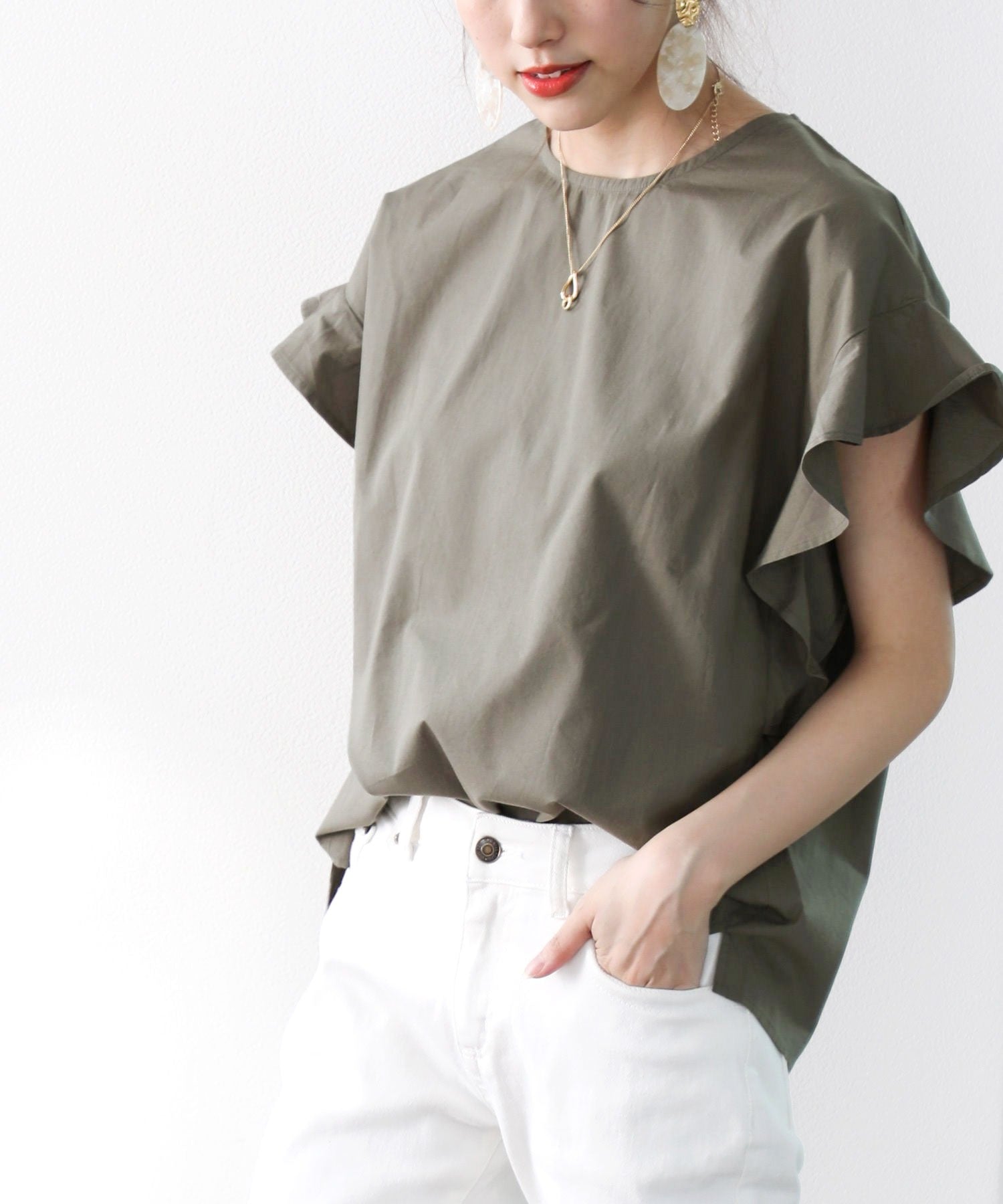 袖のフリルが大人カワイイ。さらりと着られて着回し力抜群ブラウス。