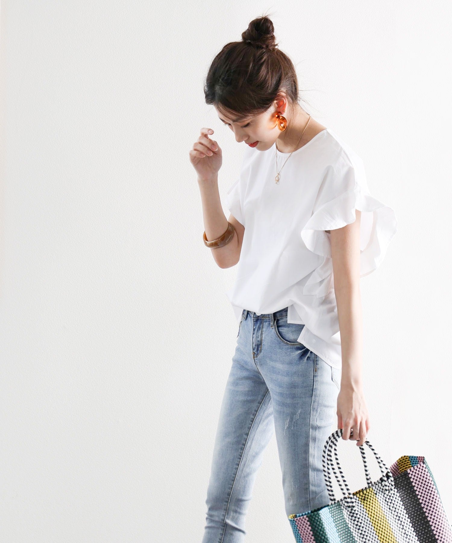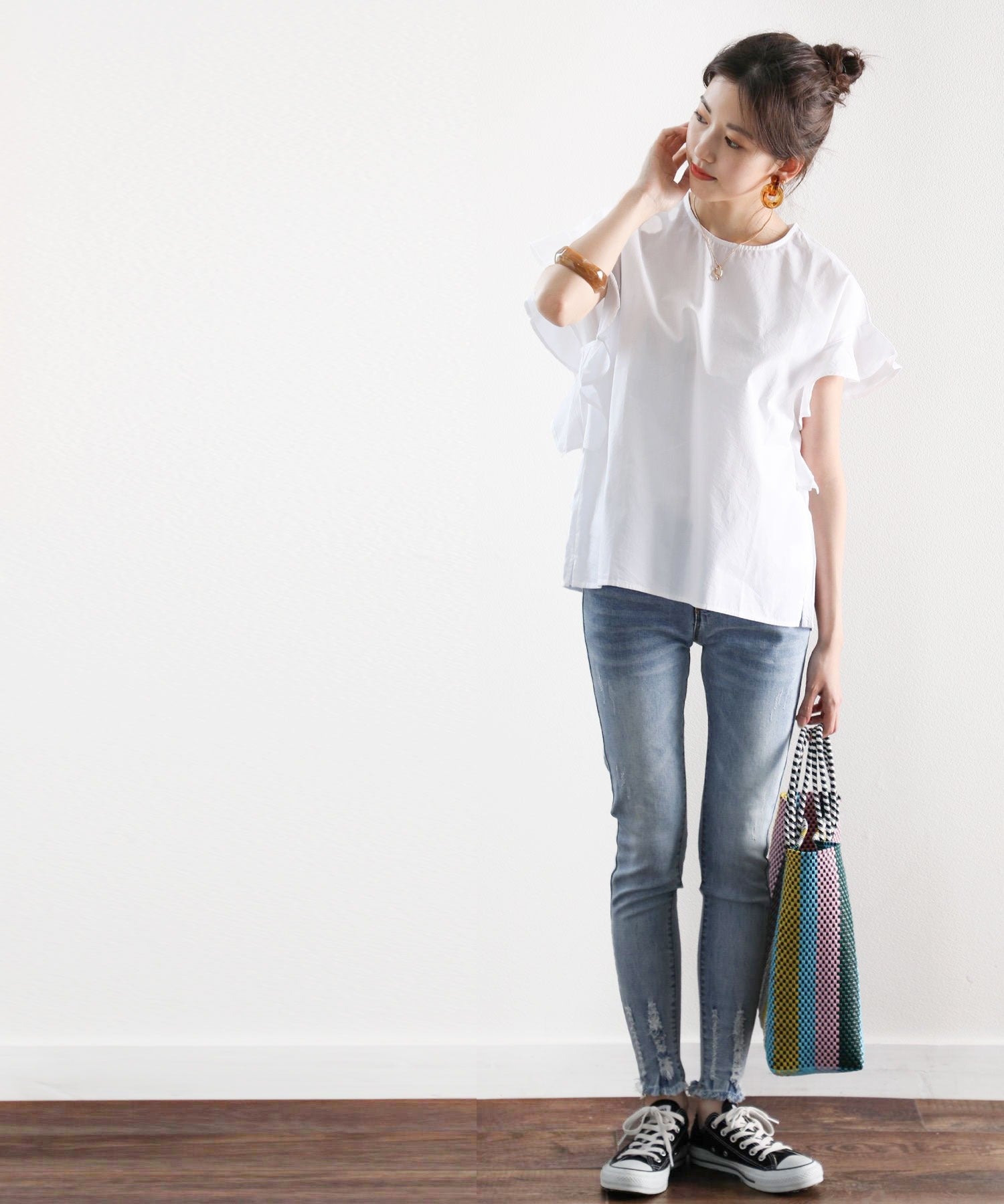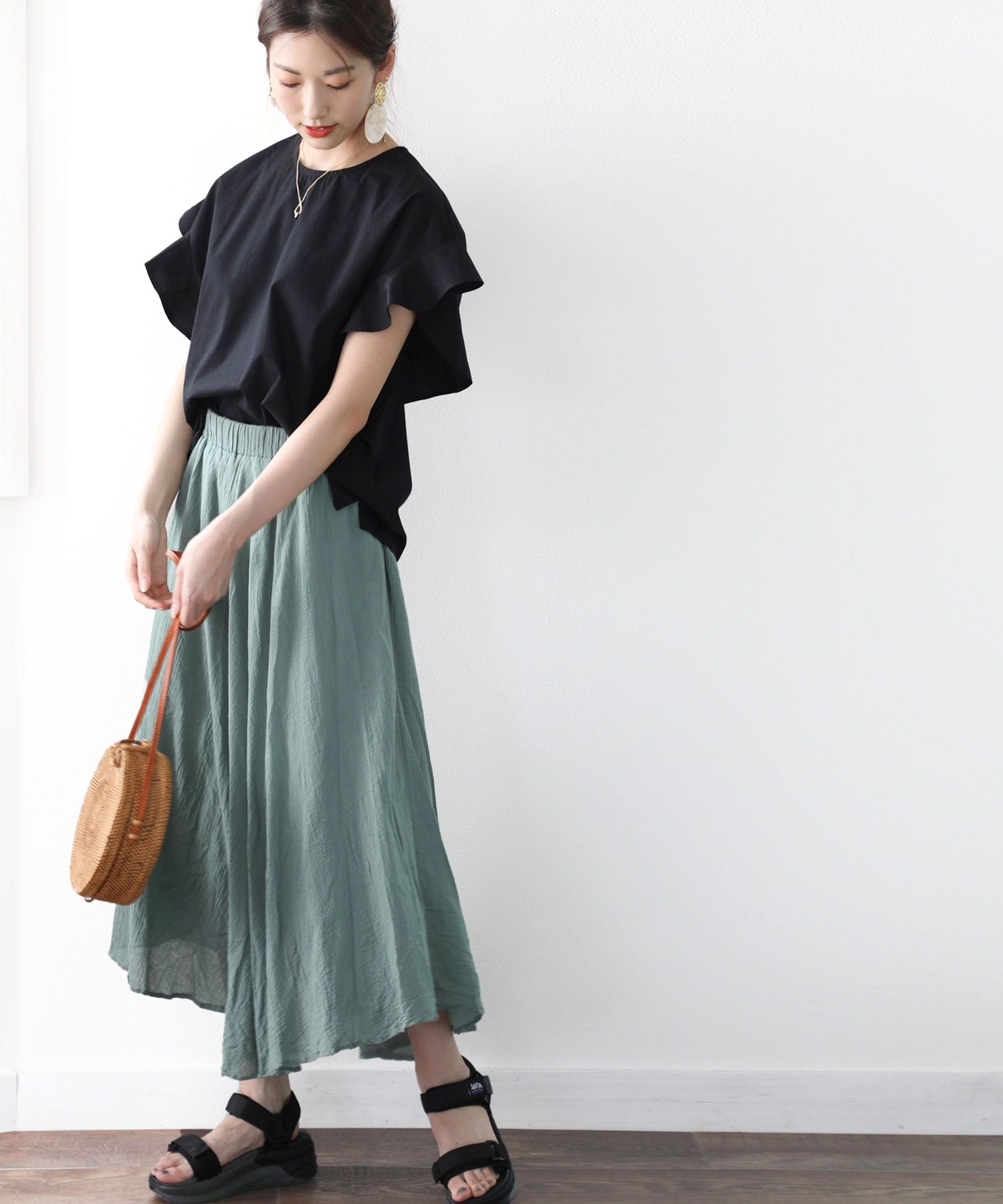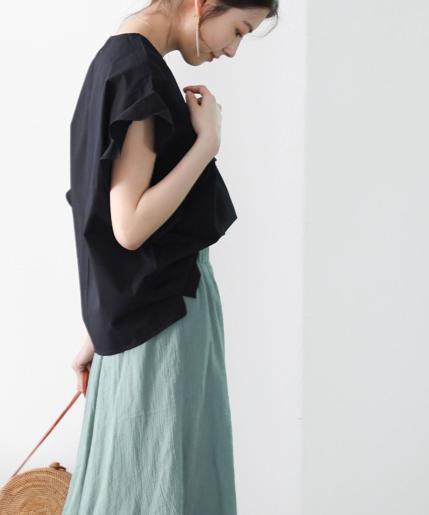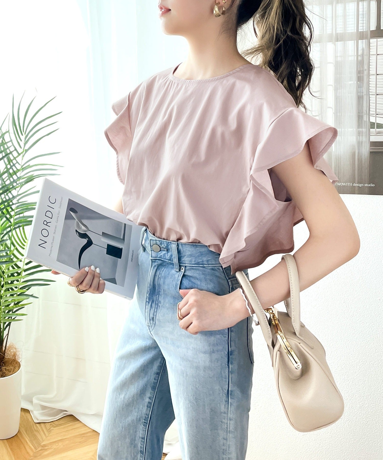 袖のフリルが大人カワイイ。さらりと着られて着回し力抜群ブラウス。