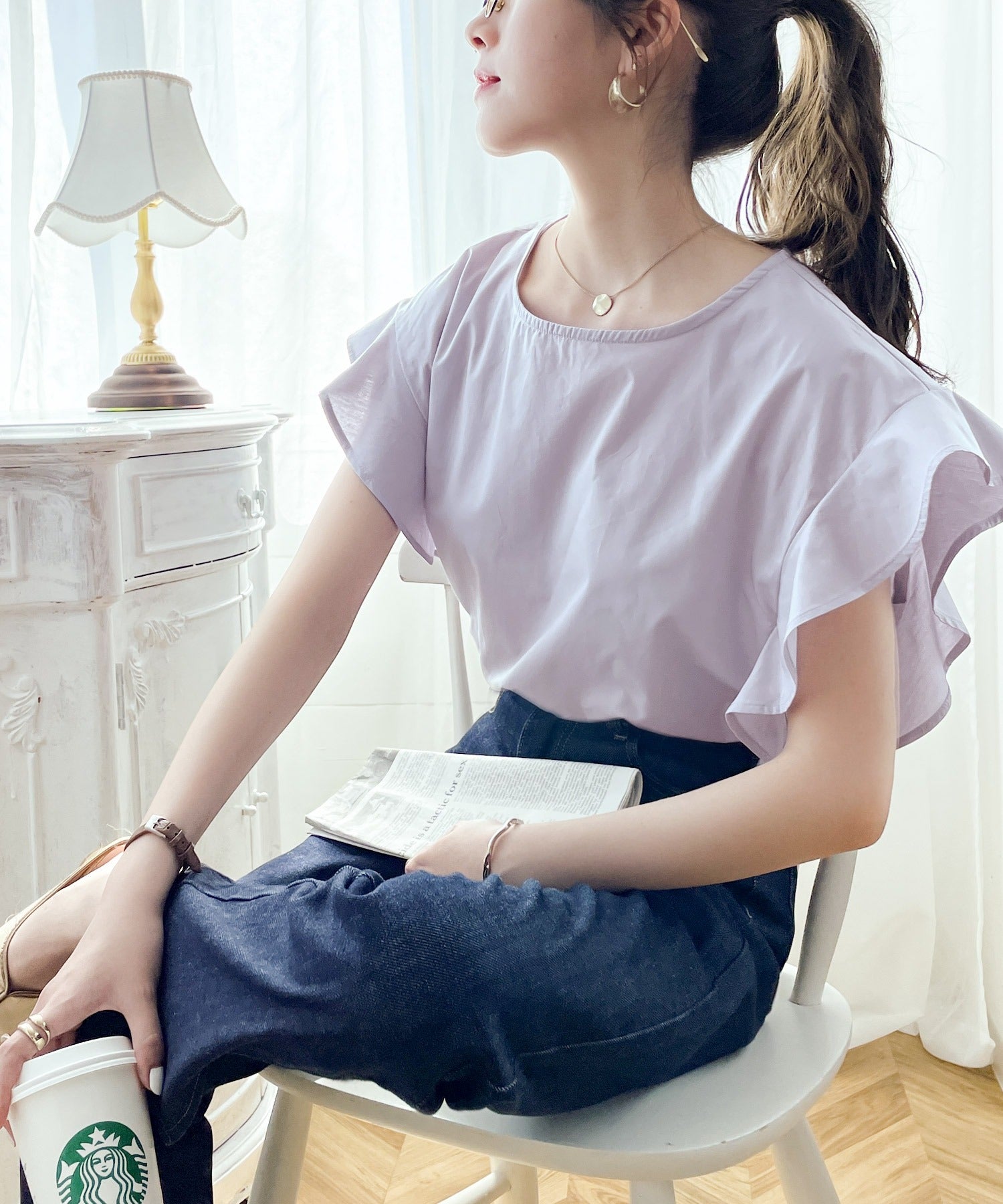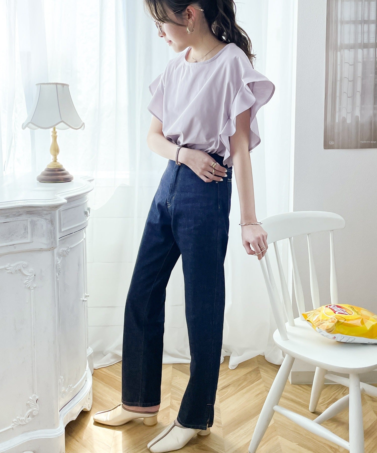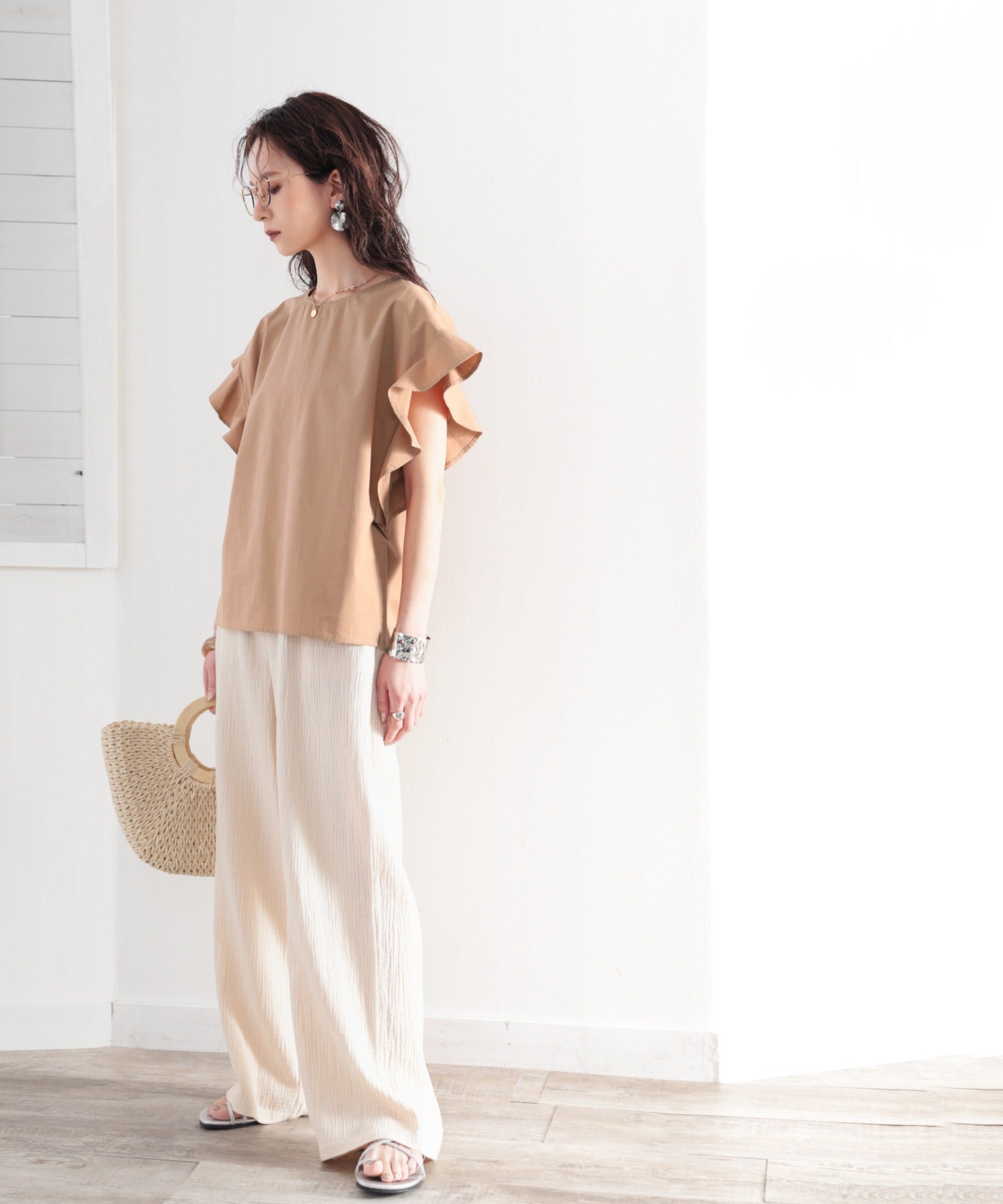 リネン素材のワイドパンツやデニム合わせでガーリーだけどカジュアルさも。