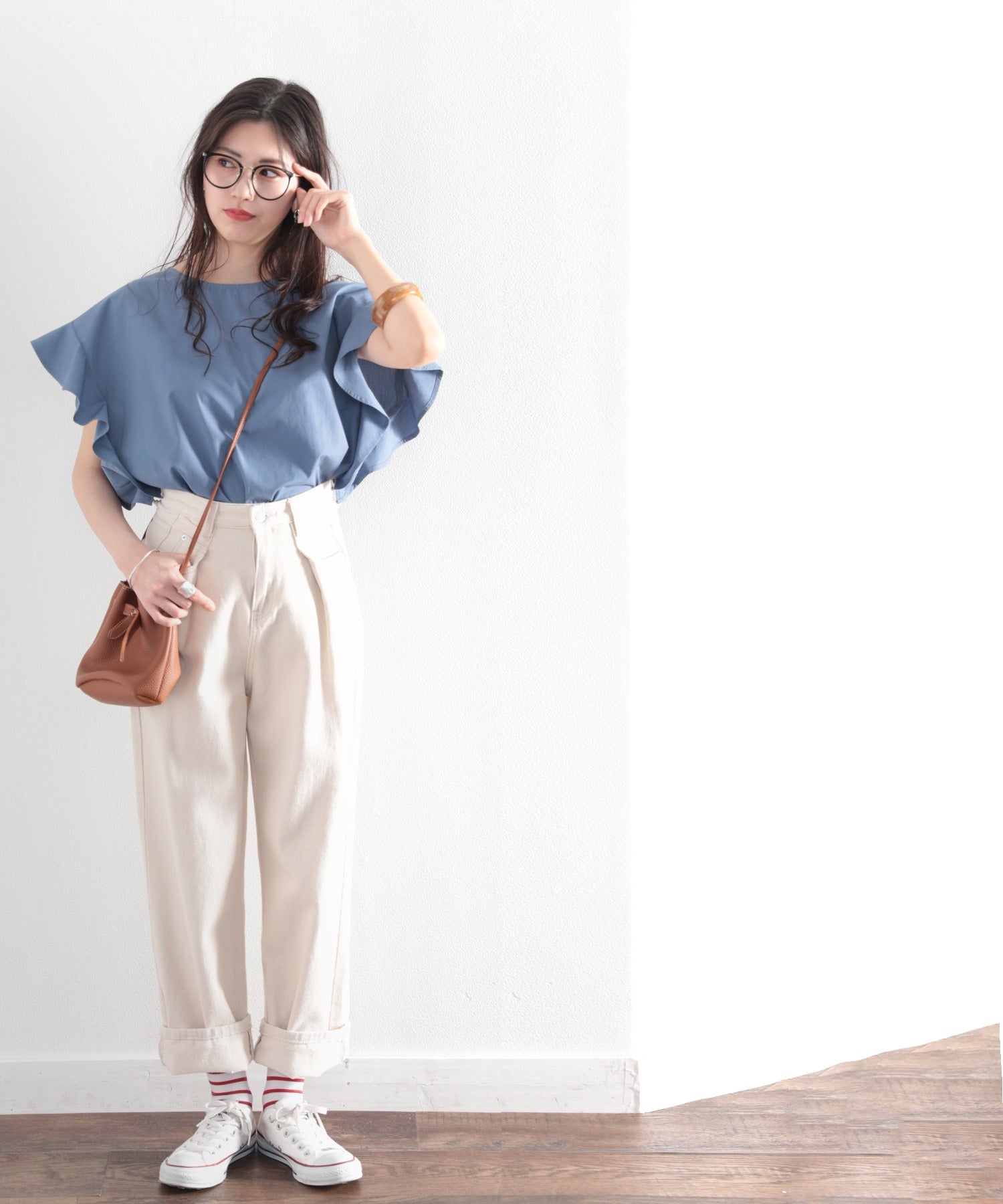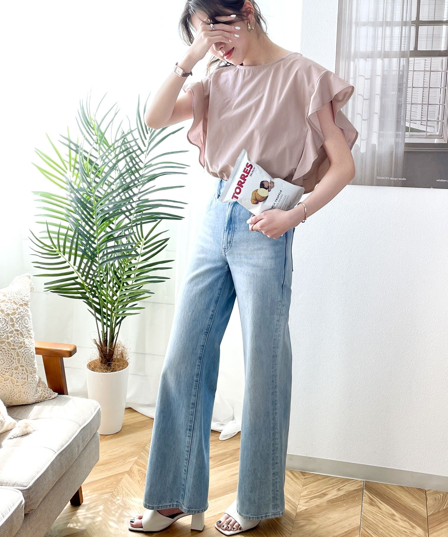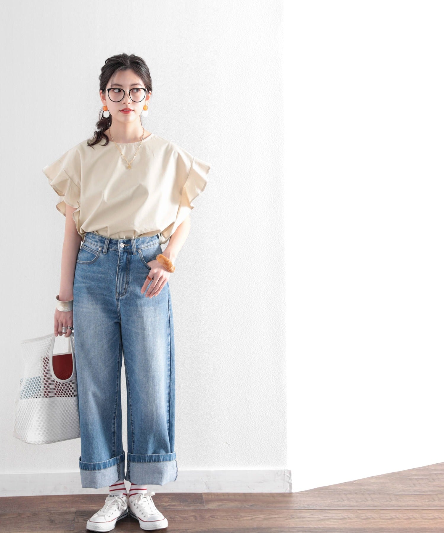 リネン素材のワイドパンツやデニム合わせでガーリーだけどカジュアルさも。