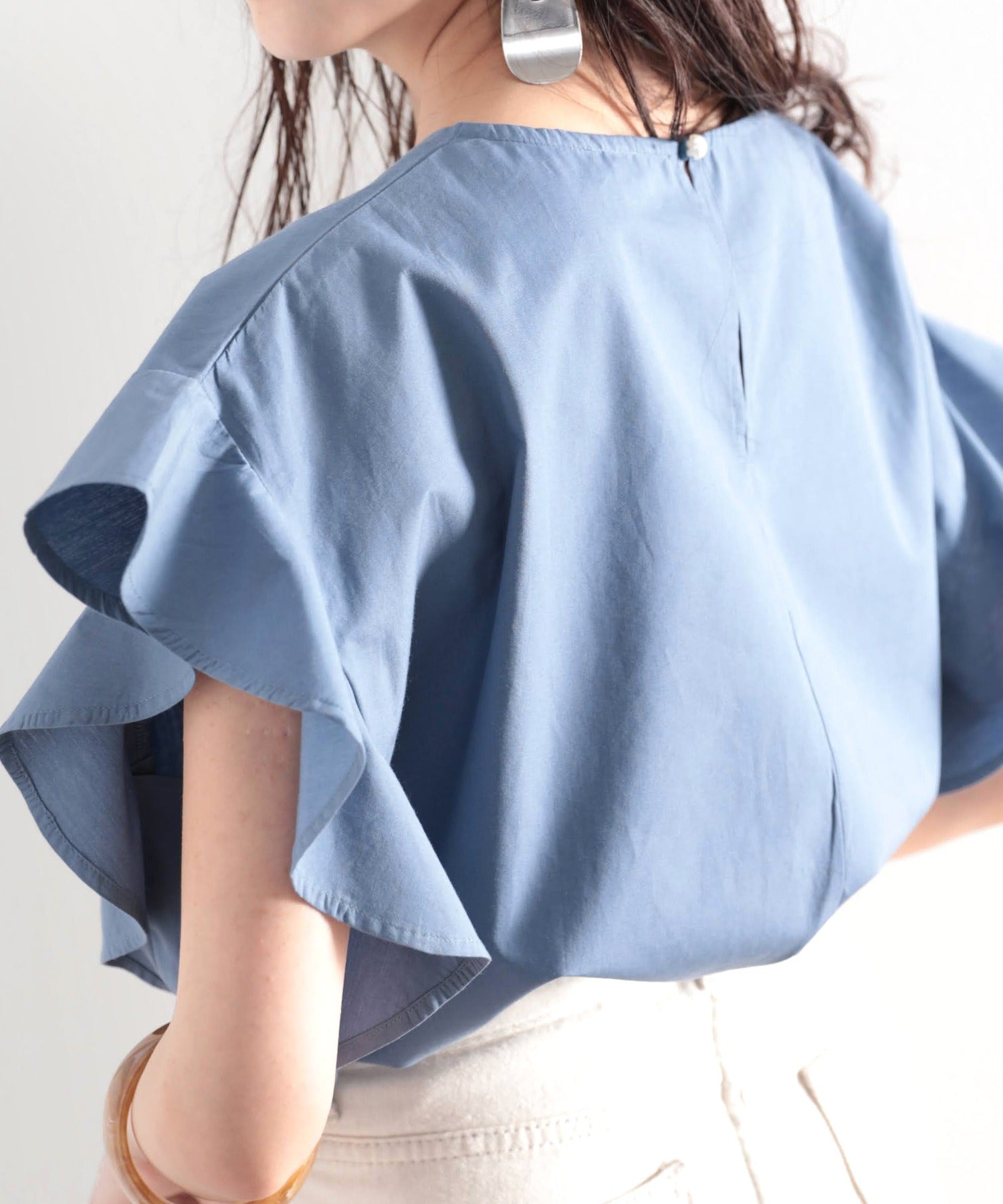 涼し気な風合いの生地に袖の振フレアが魅力のブラウス。