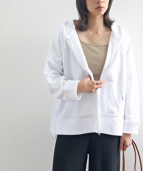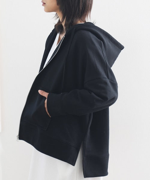 サイドスリットと前後差の丈がポイントのジップアップパーカー。