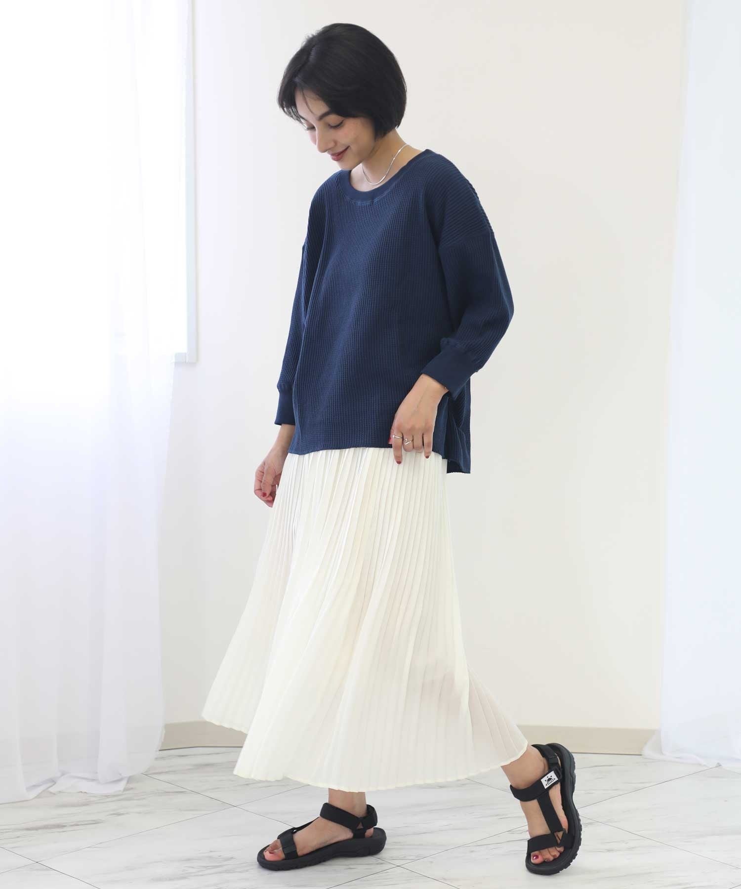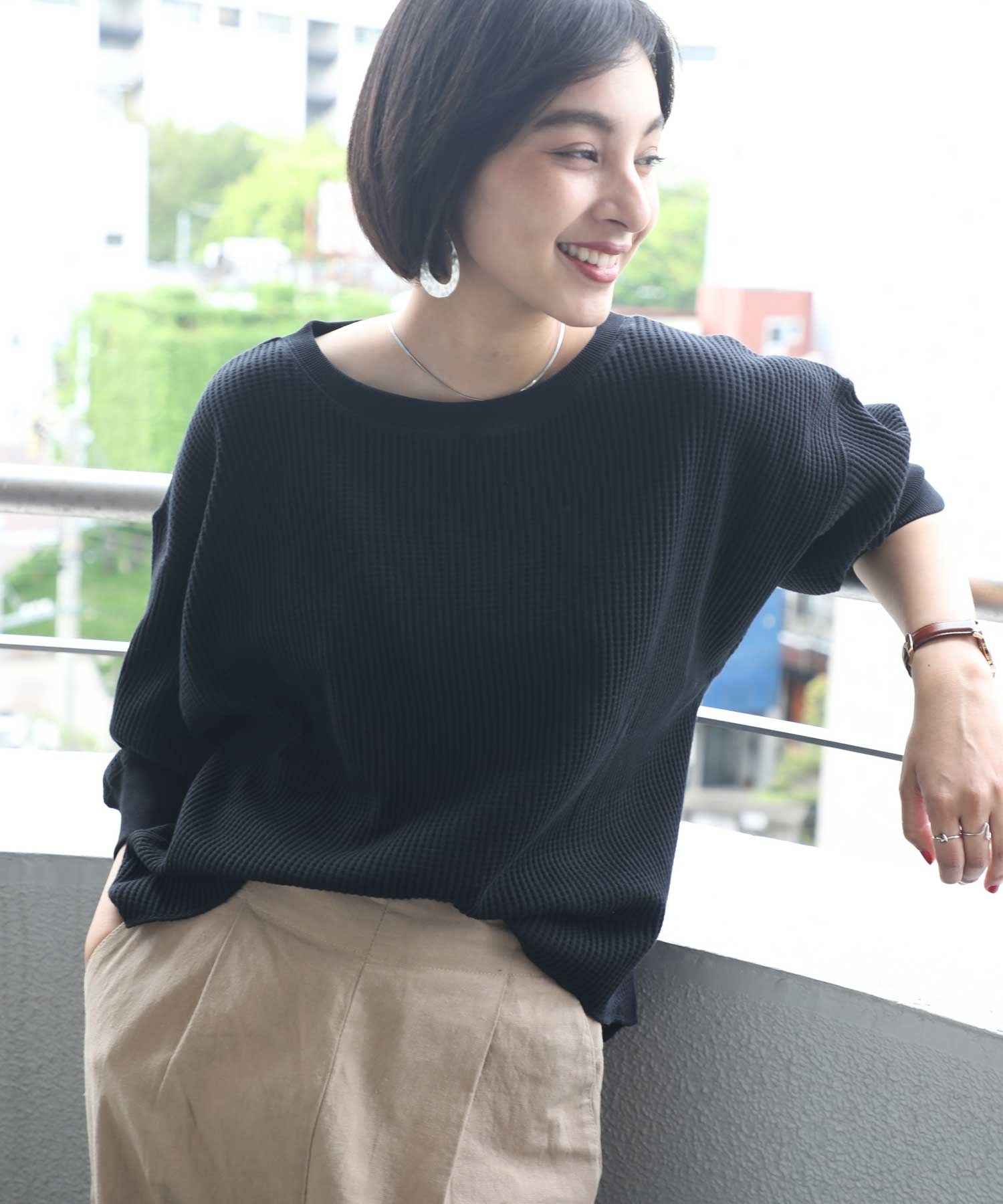 ワッフルラウンドサーマル七分袖トップス ctl002