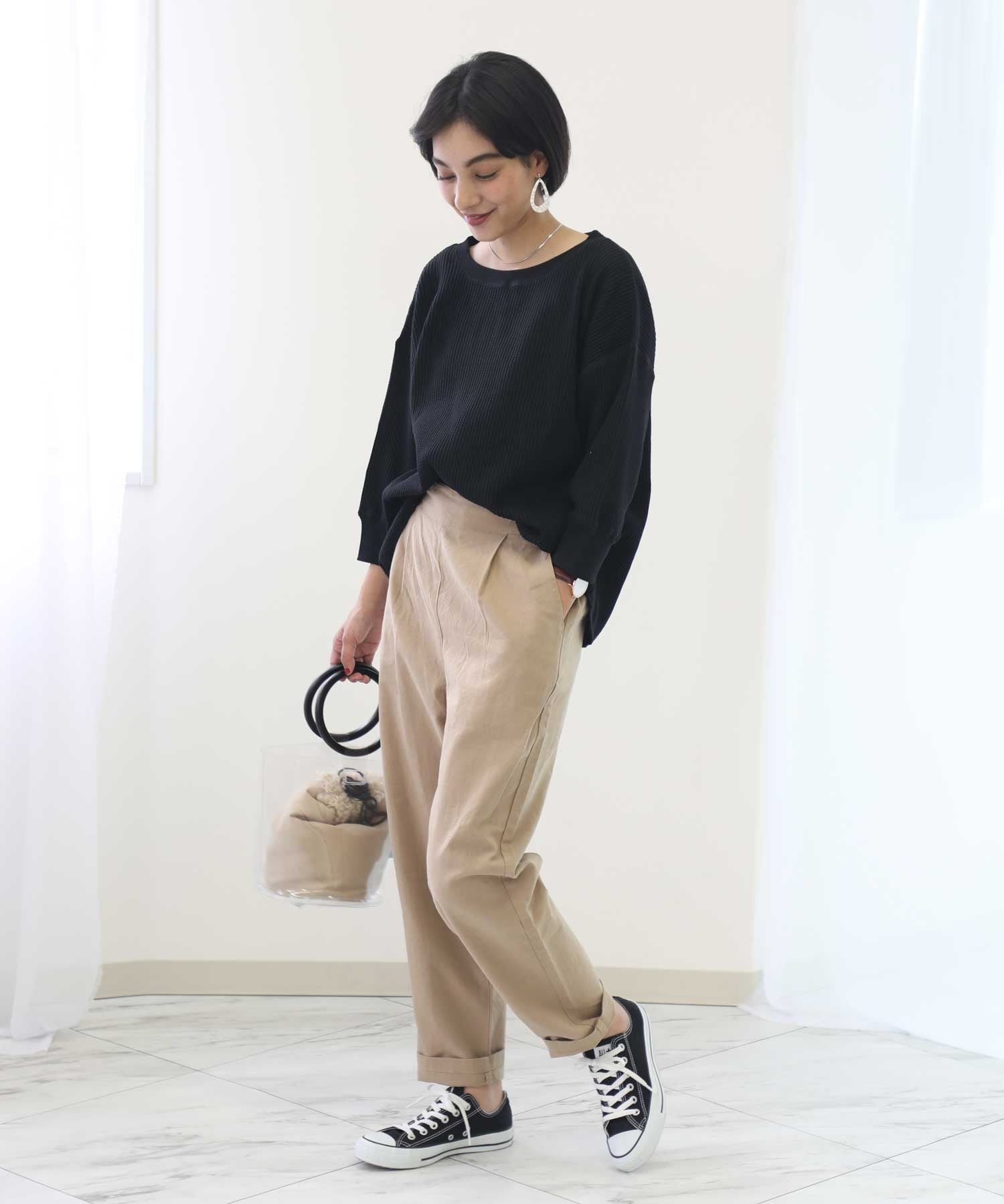 ビッグシルエットトップスの下にインナーとして着るのもコットン100%だからおすすめの生地感。