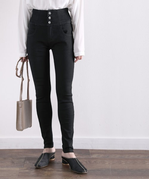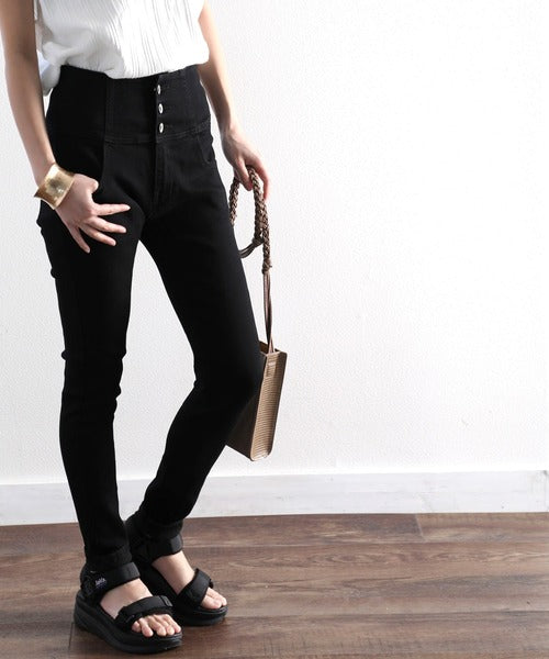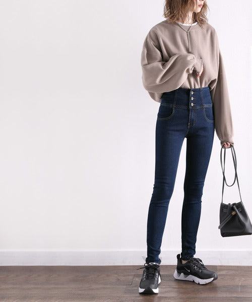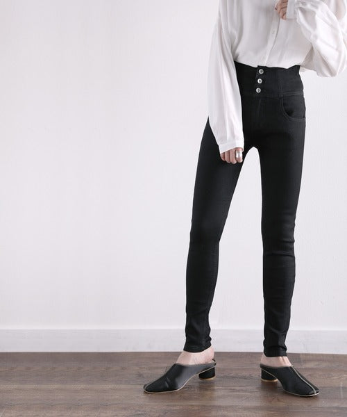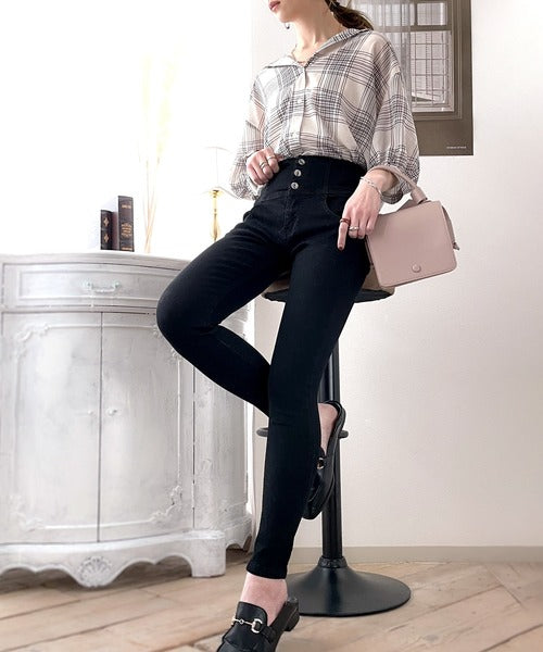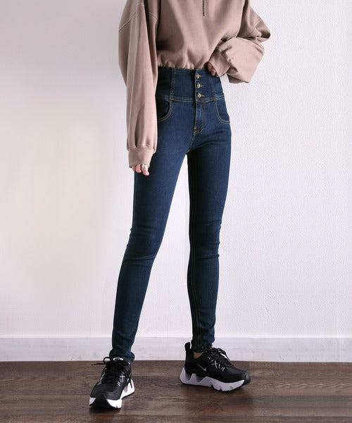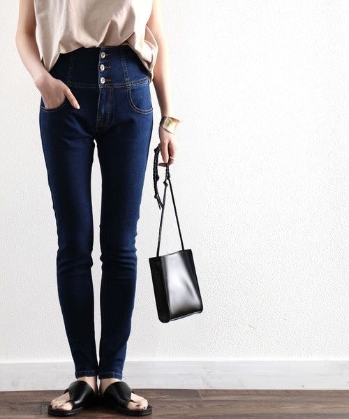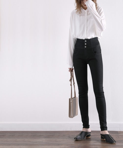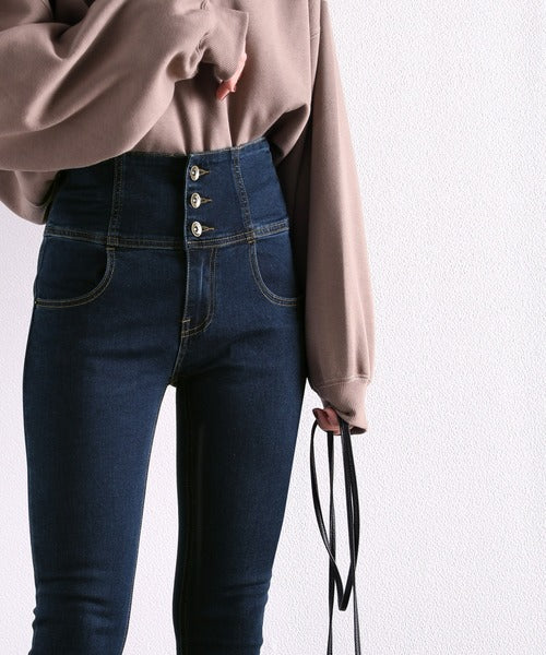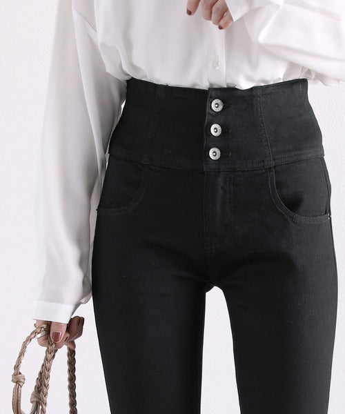 ハイウエスト3連ボタン無地ストレッチスキニーデニムパンツ(フルレングス) elf063