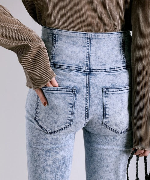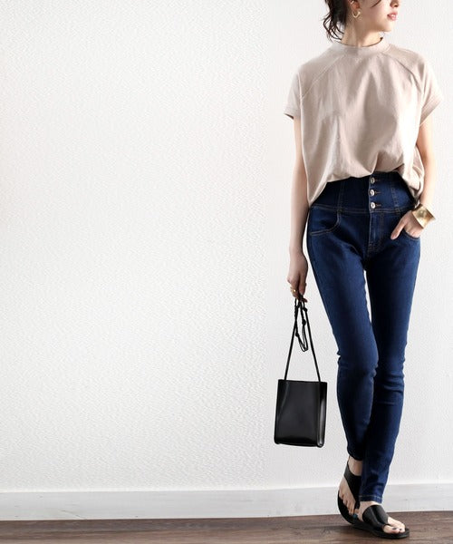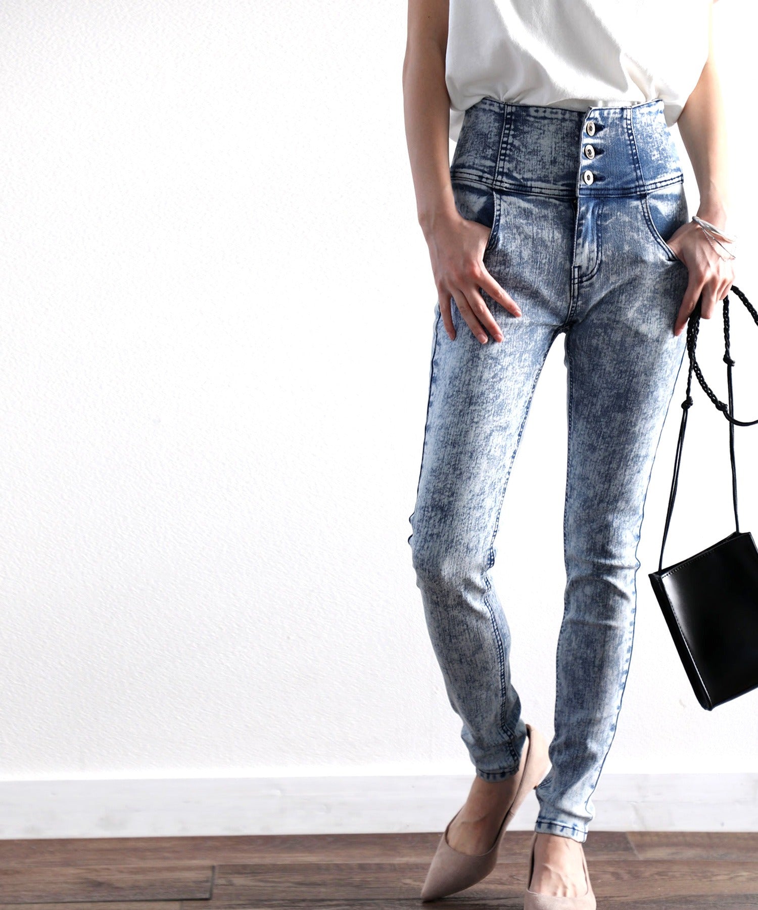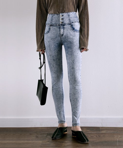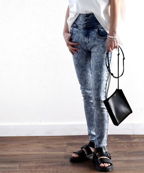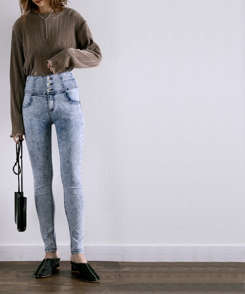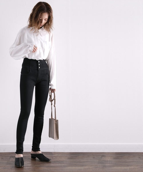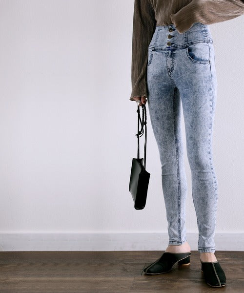 ハイウエスト3連ボタン無地ストレッチスキニーデニムパンツ(フルレングス) elf063
