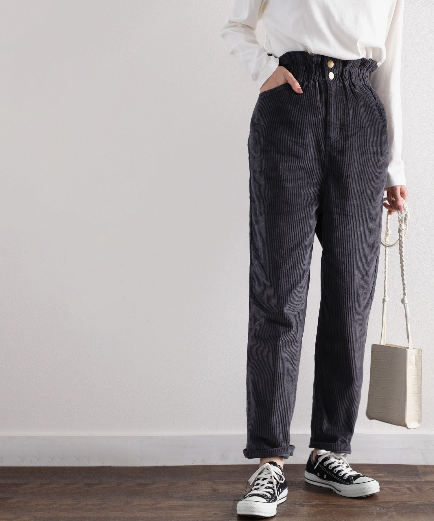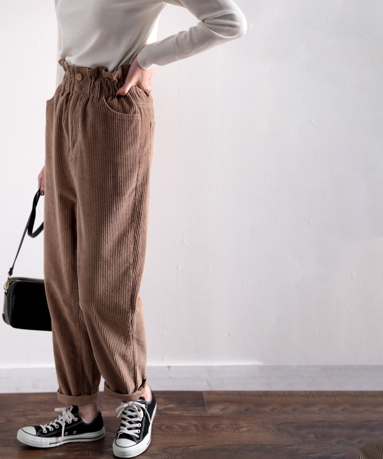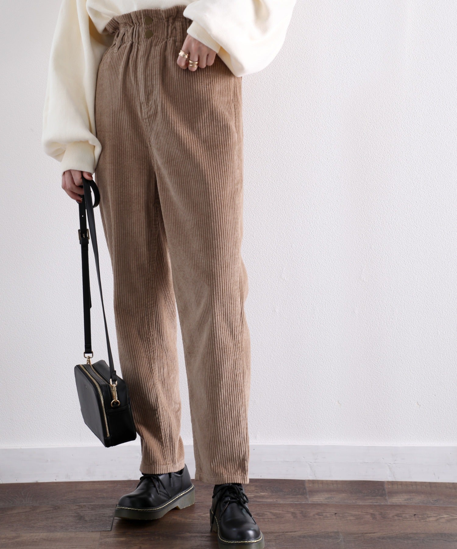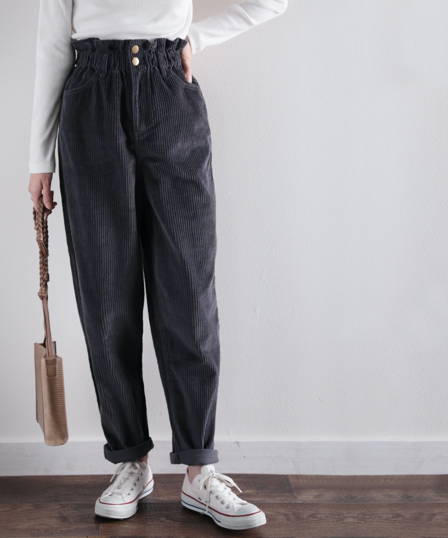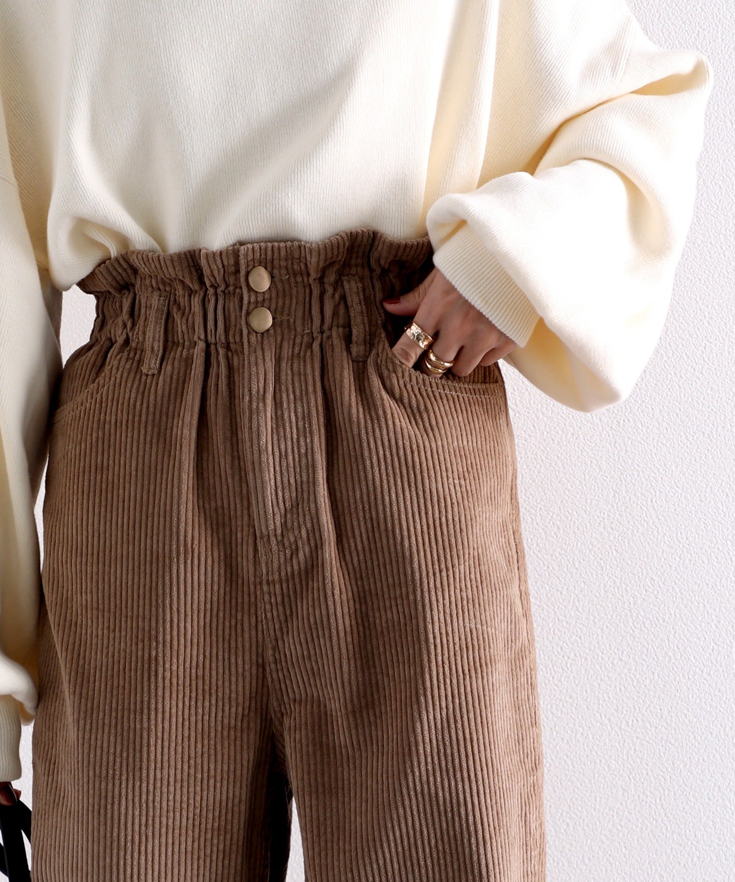ギャザーウエストコーデュロイ無地ハイウエストテーパードパンツ(フルレングス) elf073