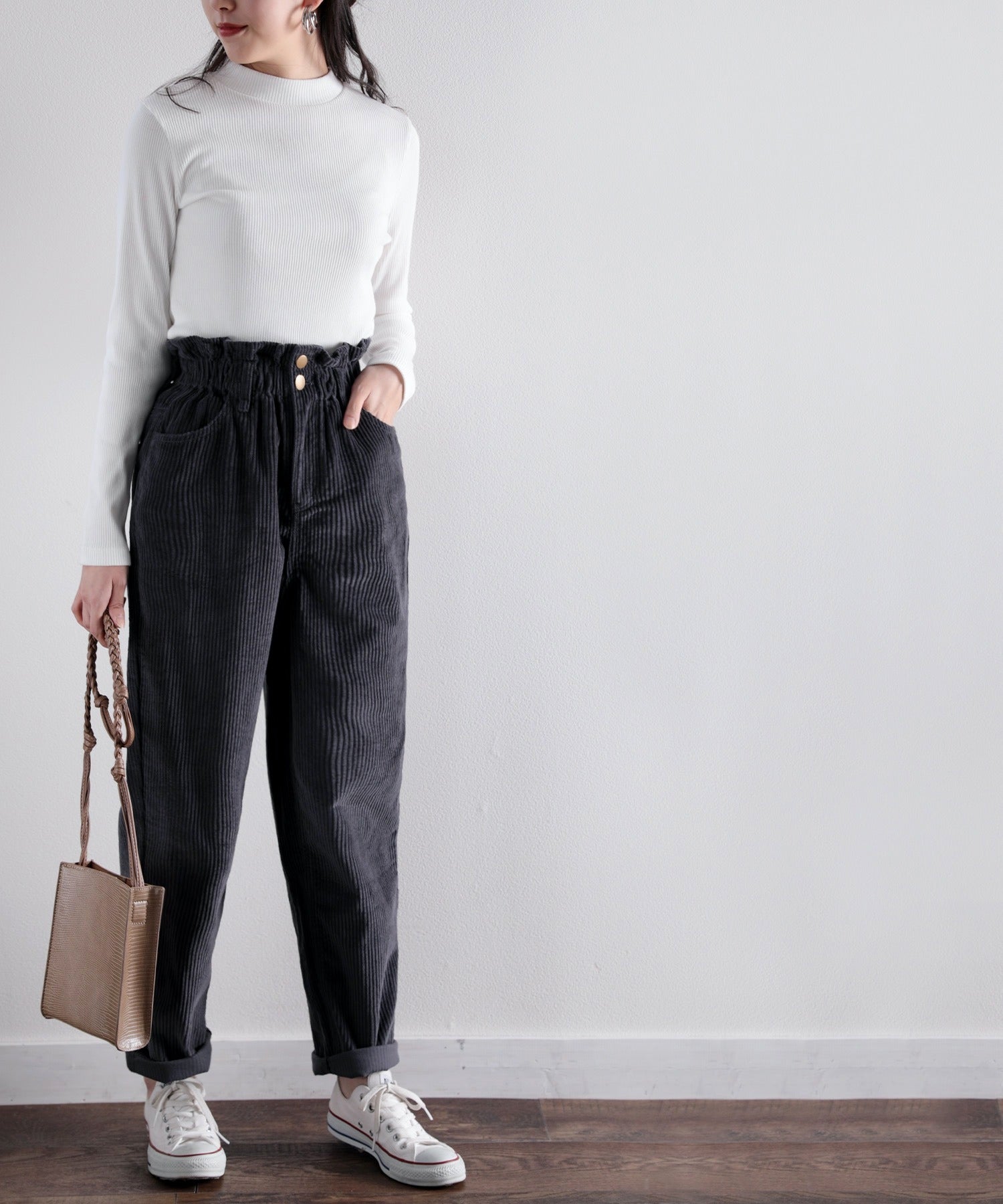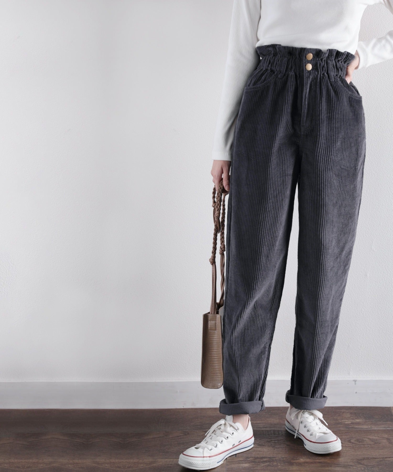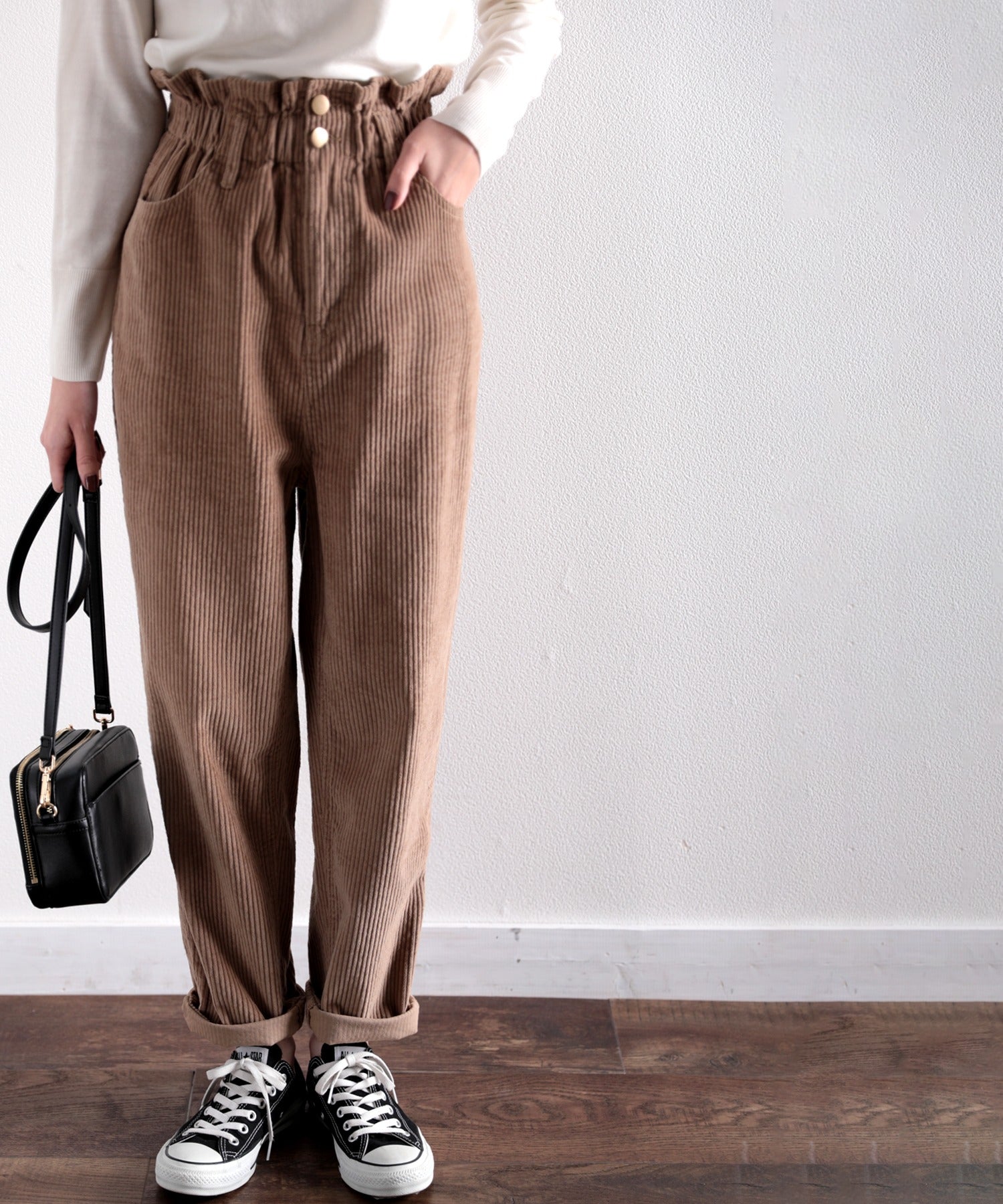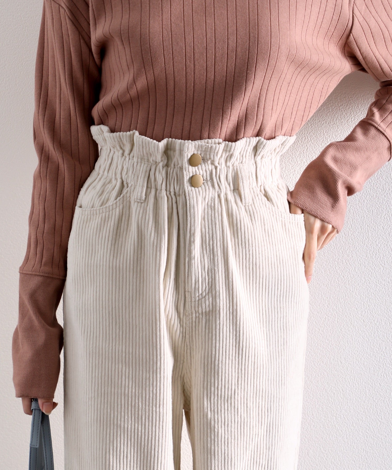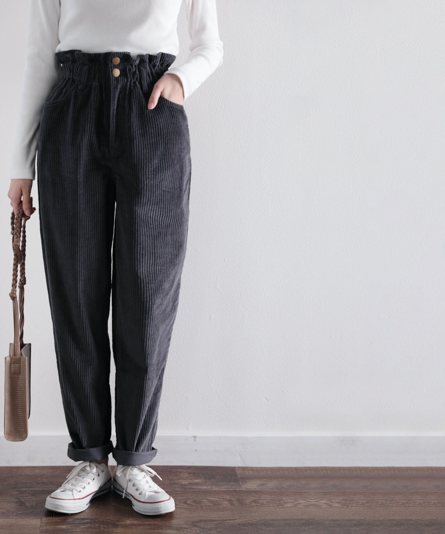ギャザーウエストコーデュロイ無地ハイウエストテーパードパンツ(フルレングス) elf073