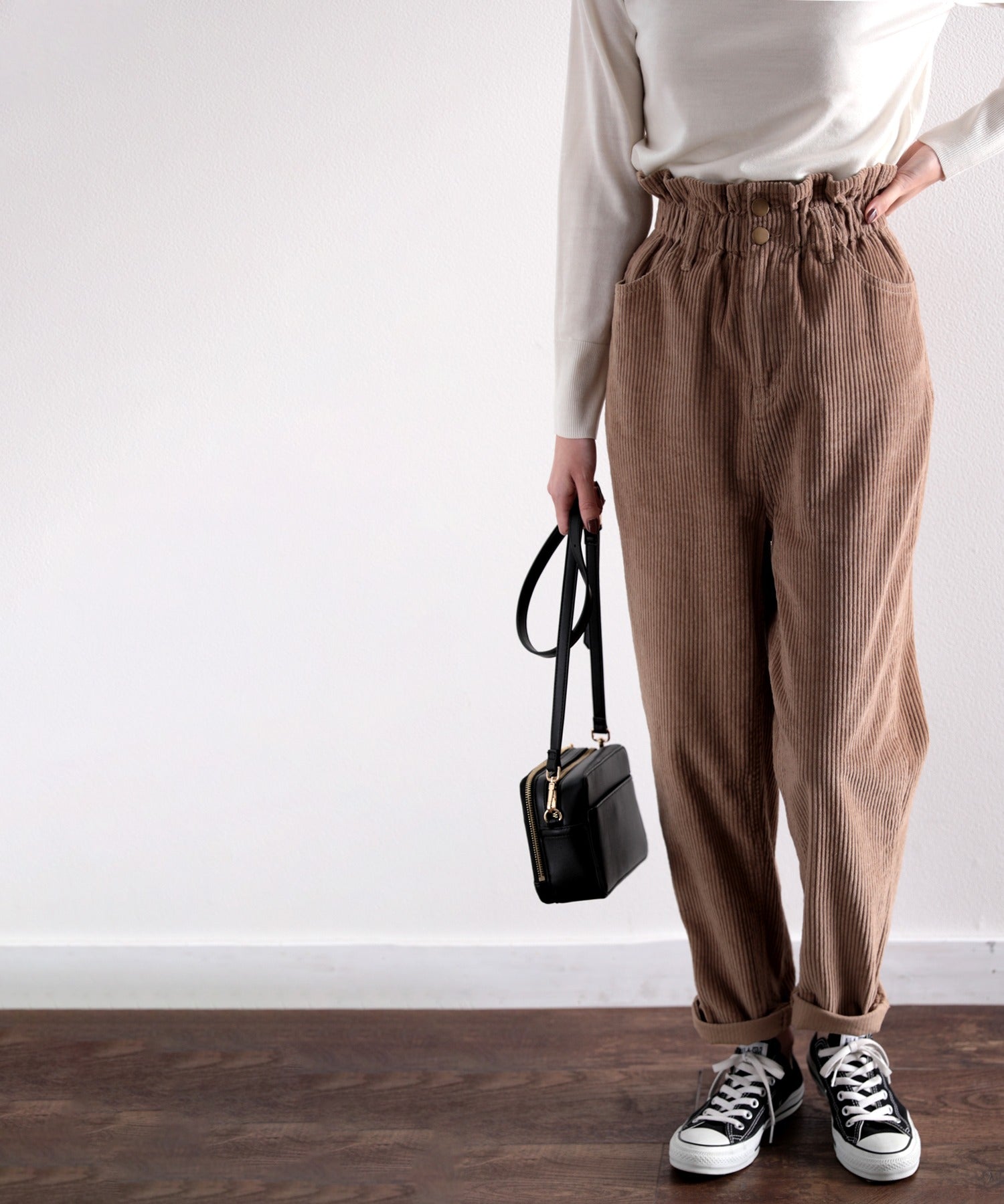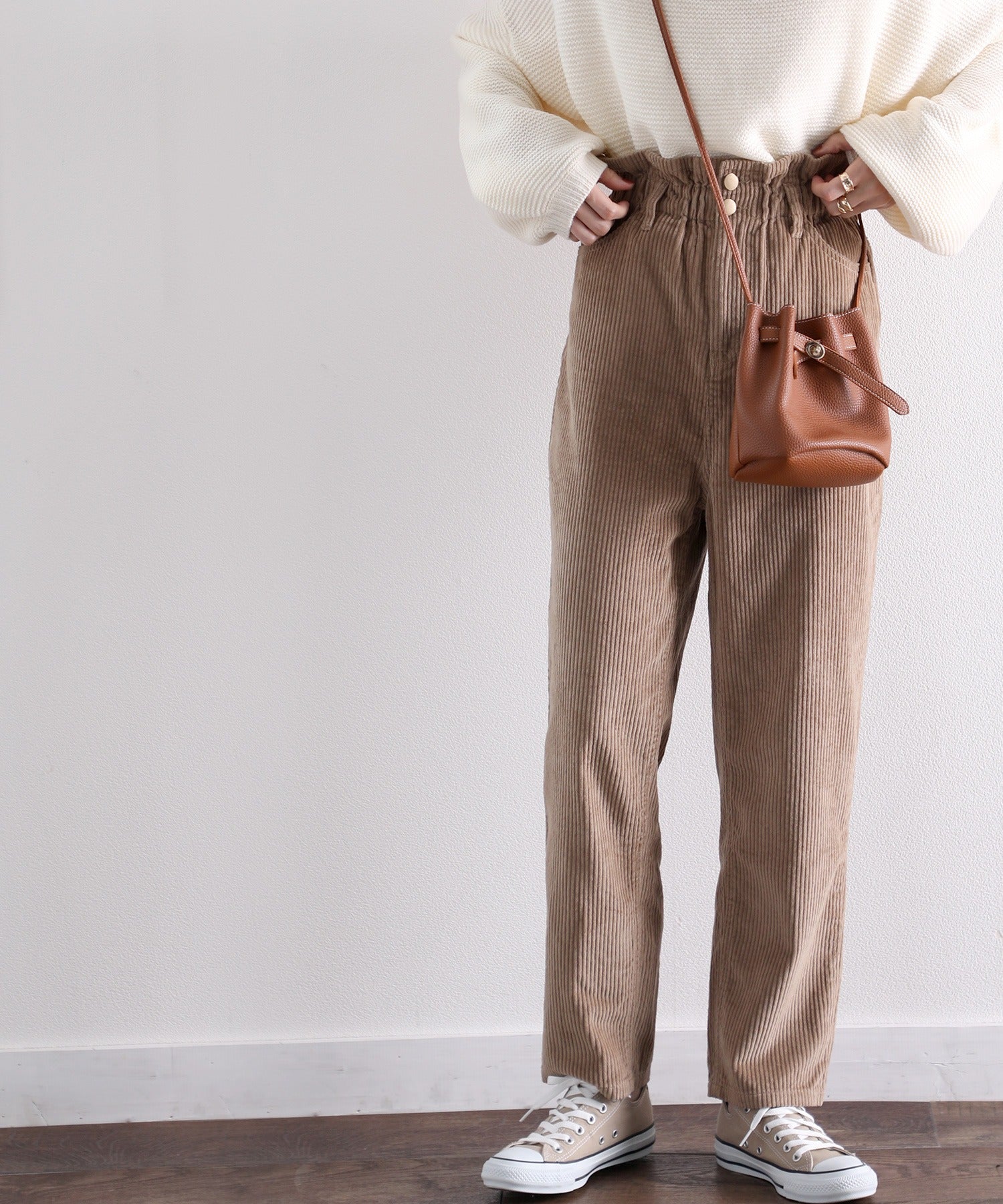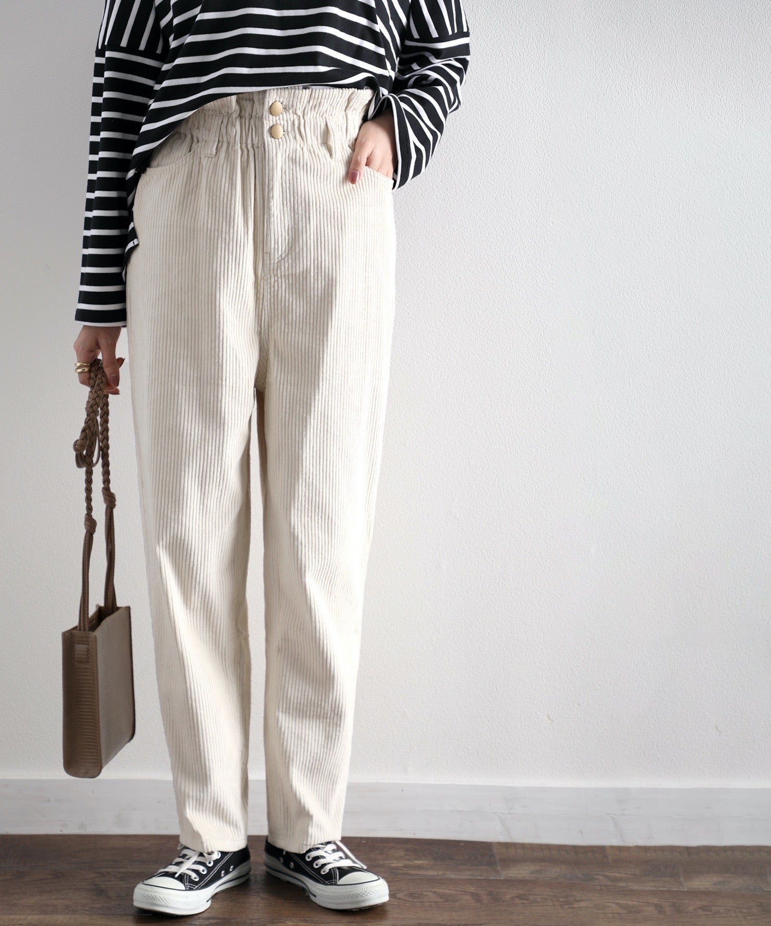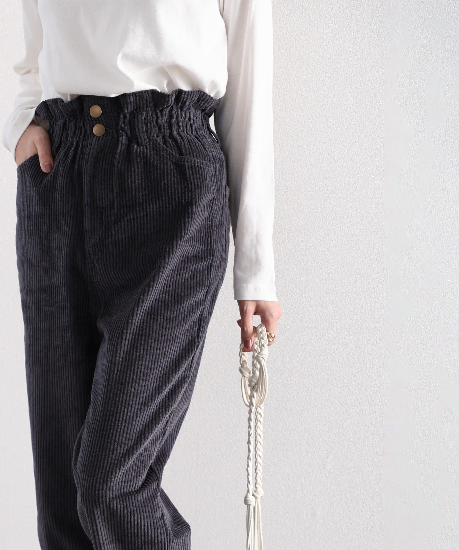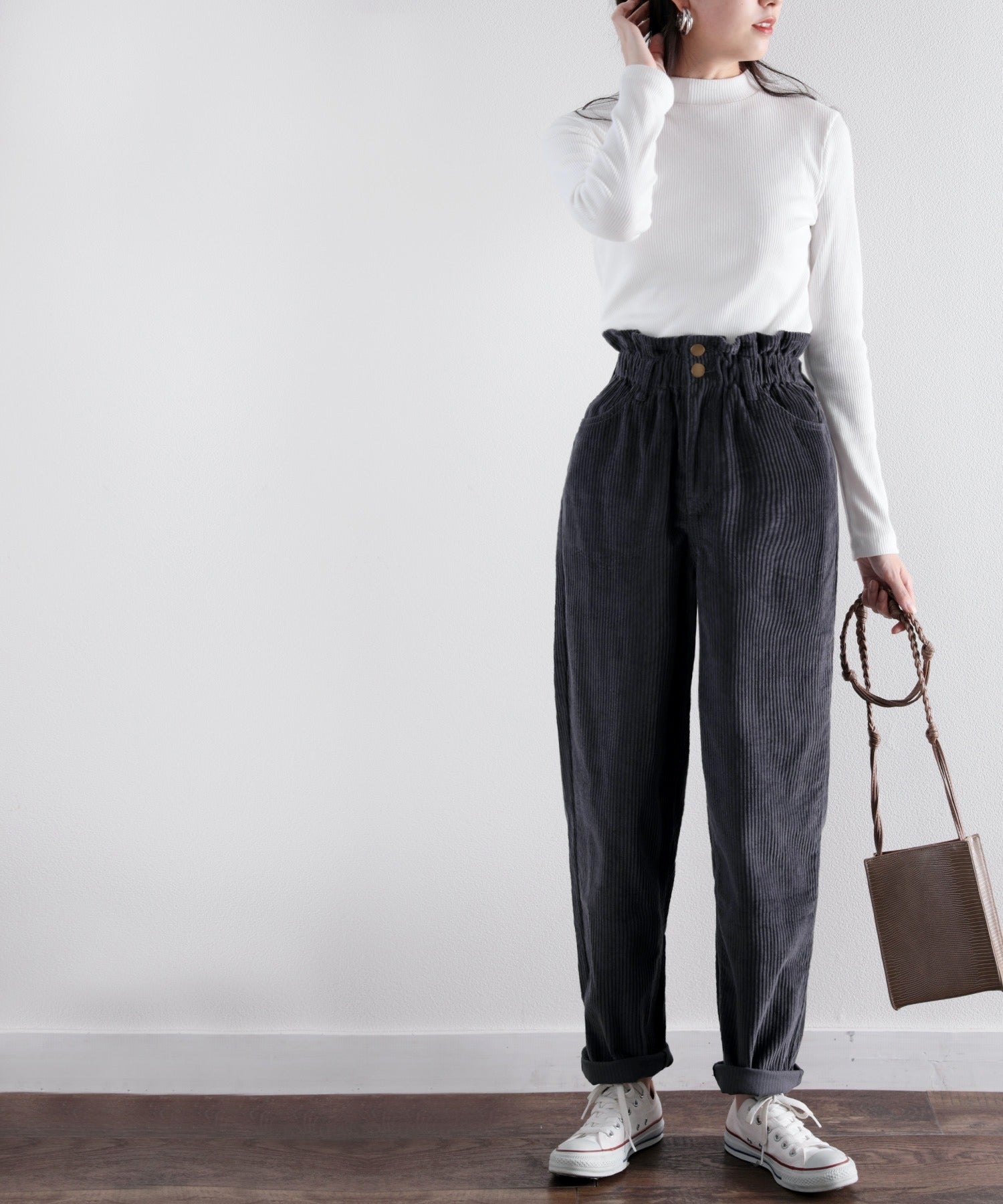 ギャザーウエストコーデュロイ無地ハイウエストテーパードパンツ(フルレングス) elf073