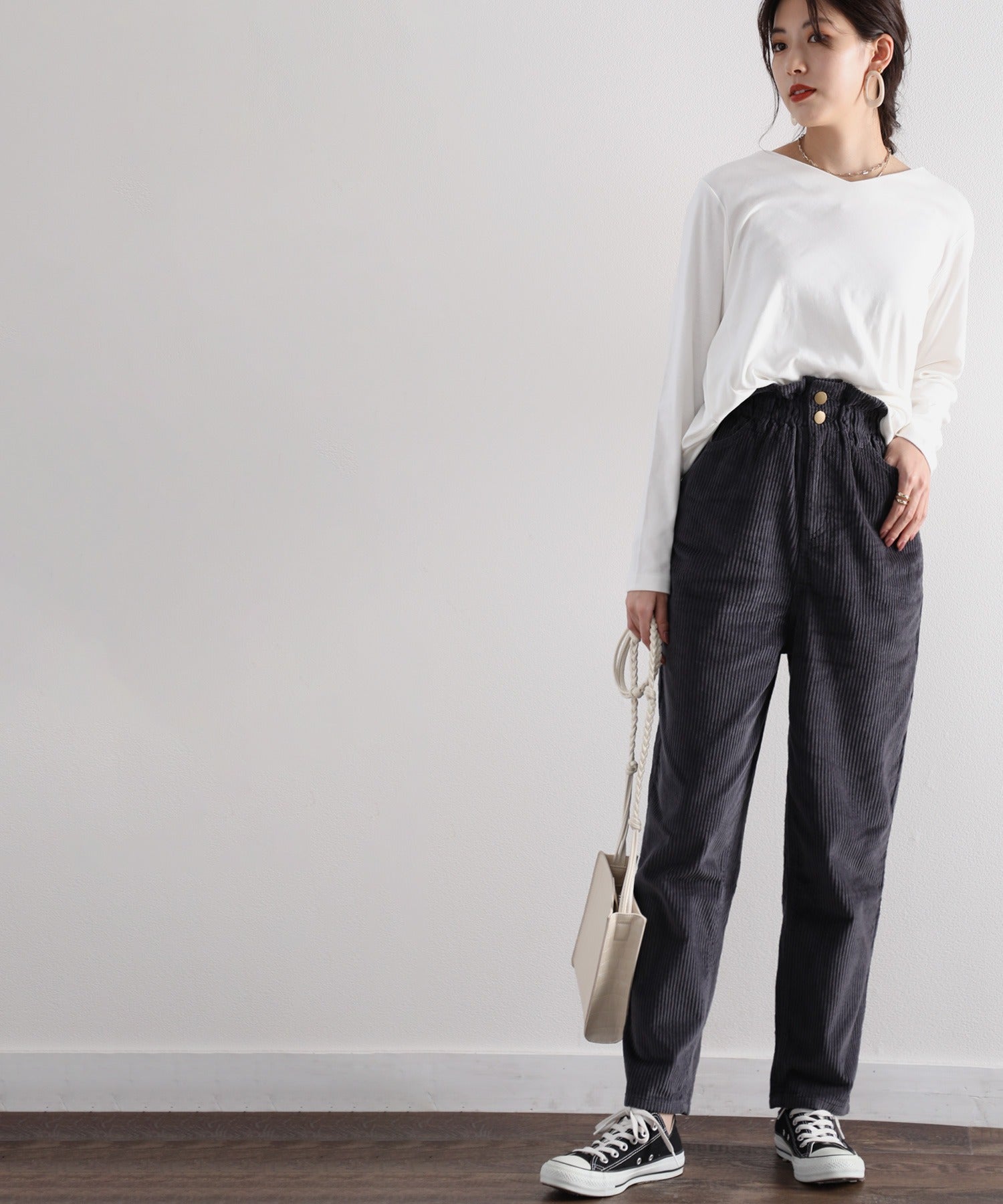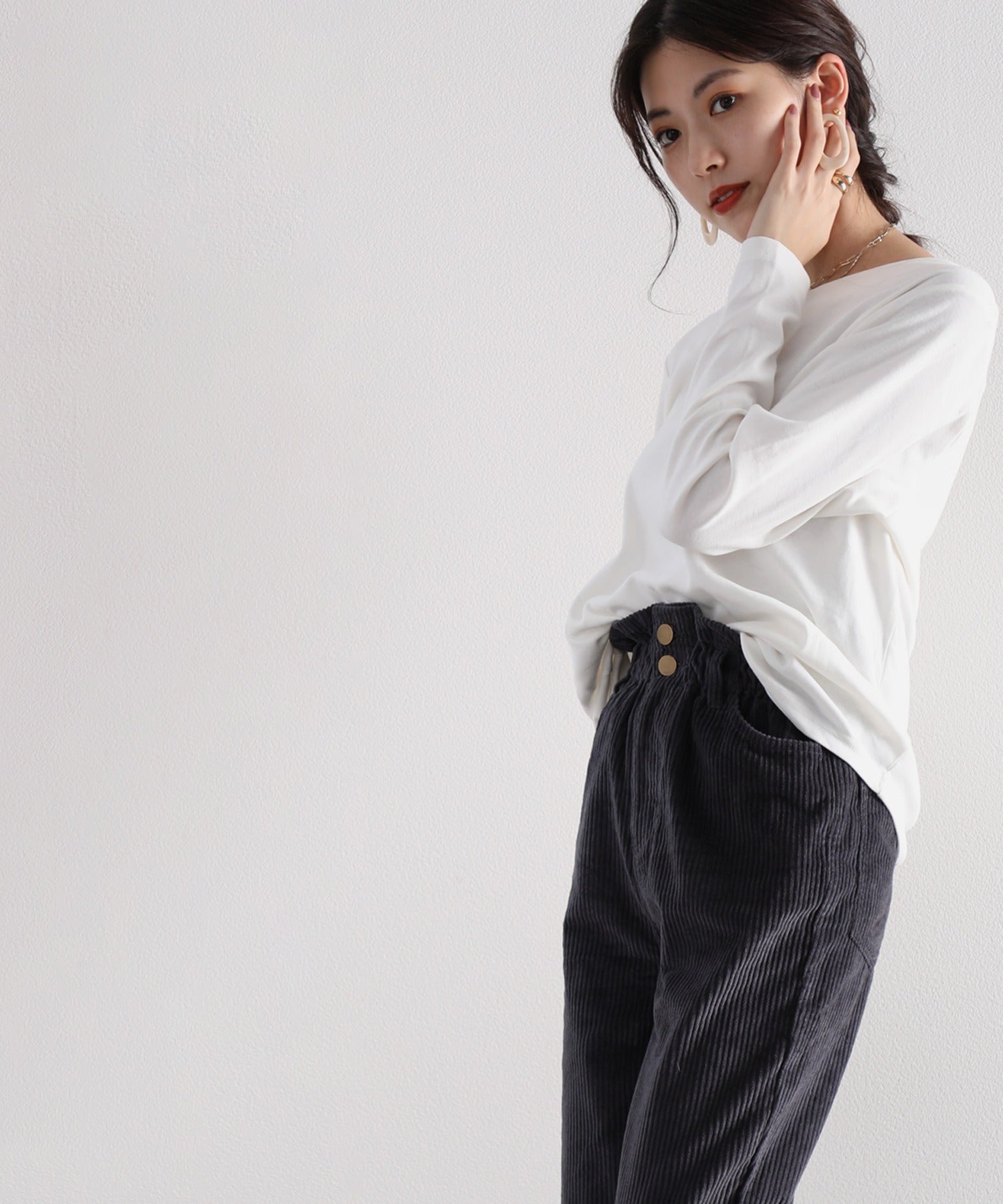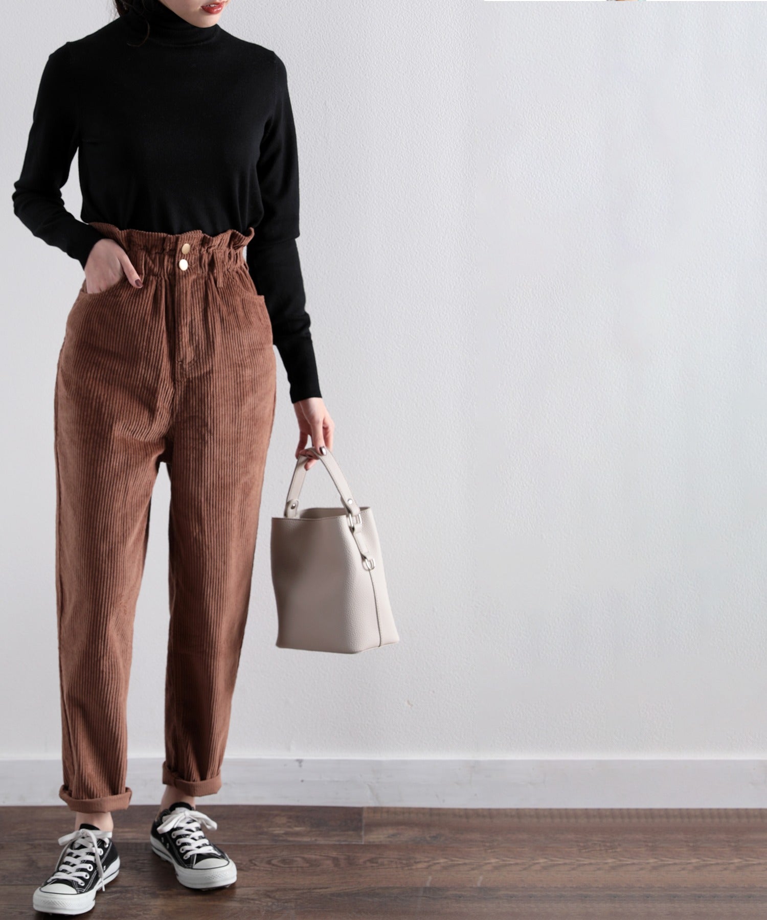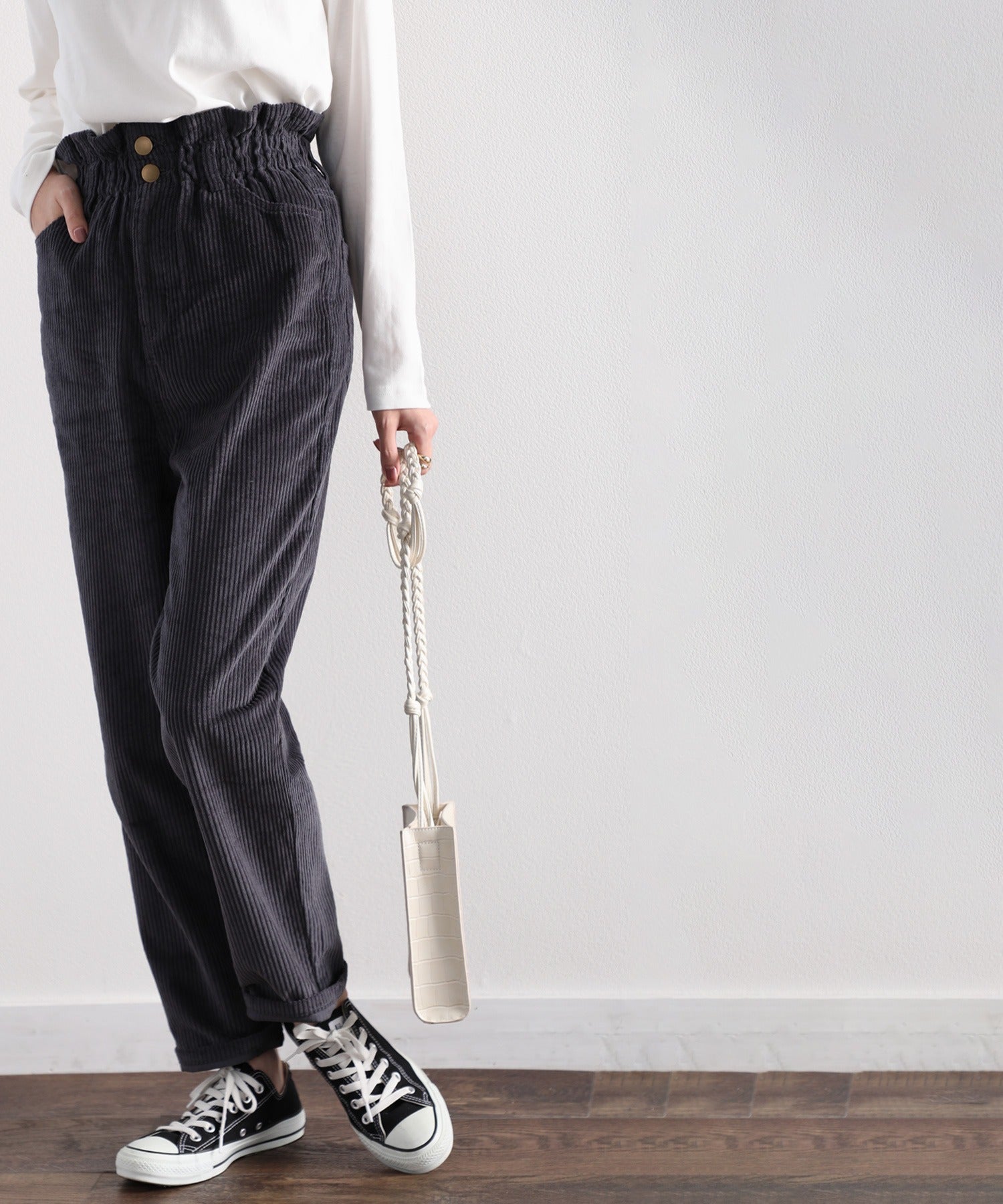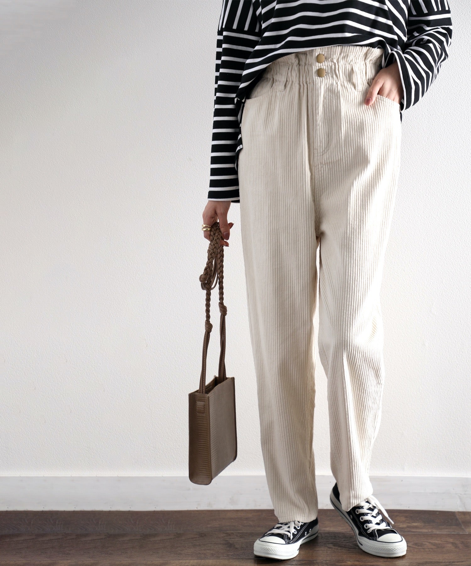 ギャザーウエストコーデュロイ無地ハイウエストテーパードパンツ(フルレングス) elf073