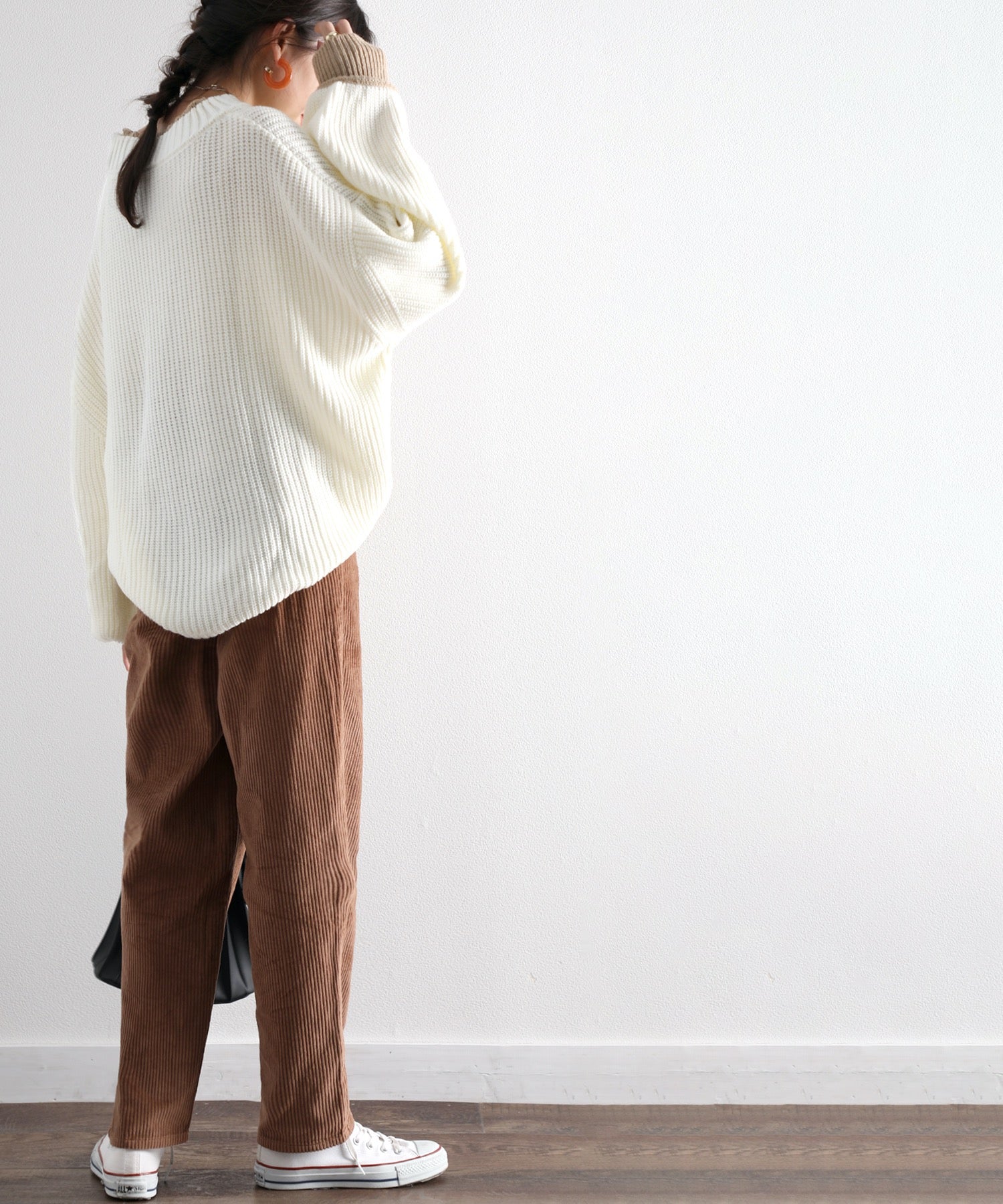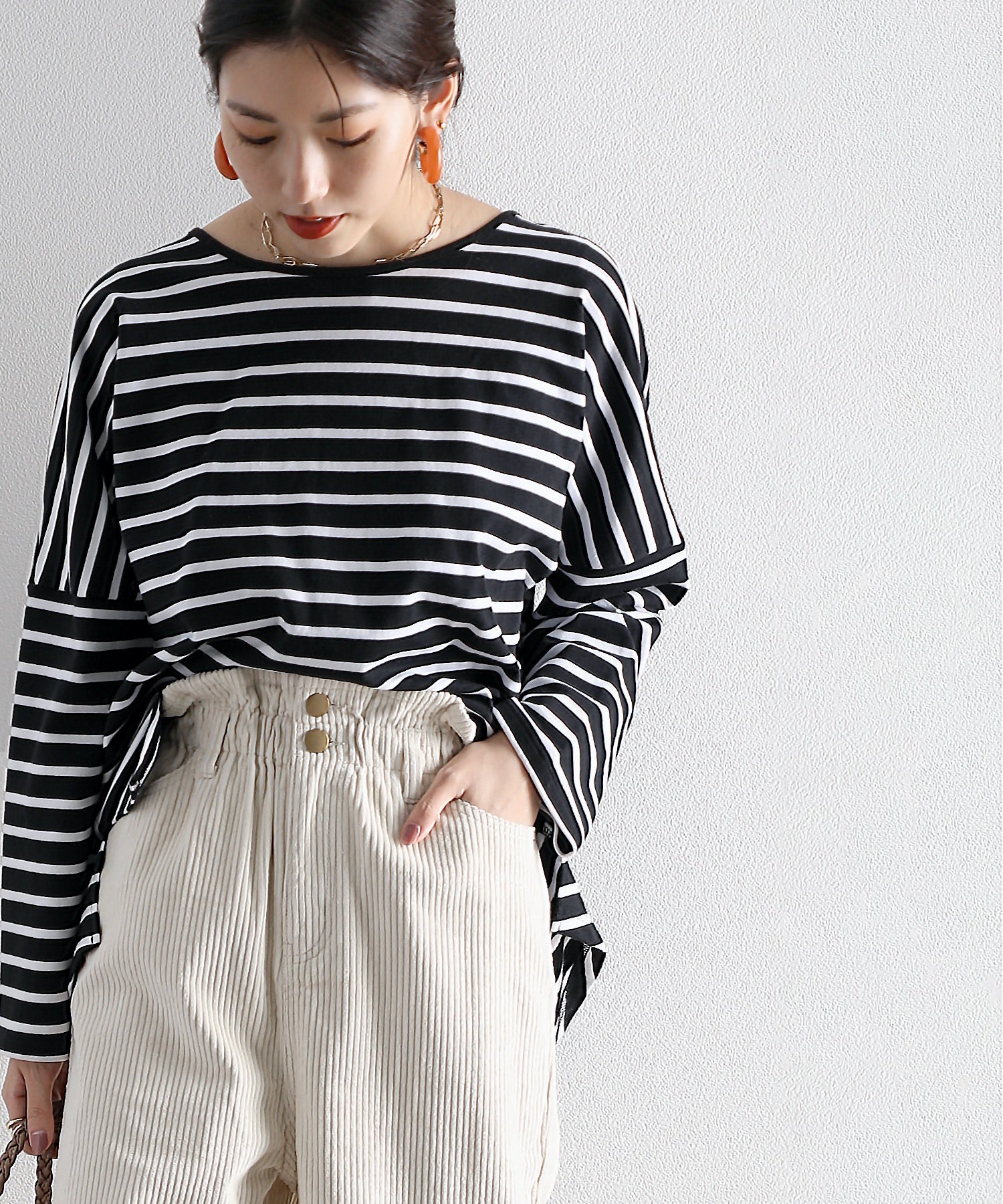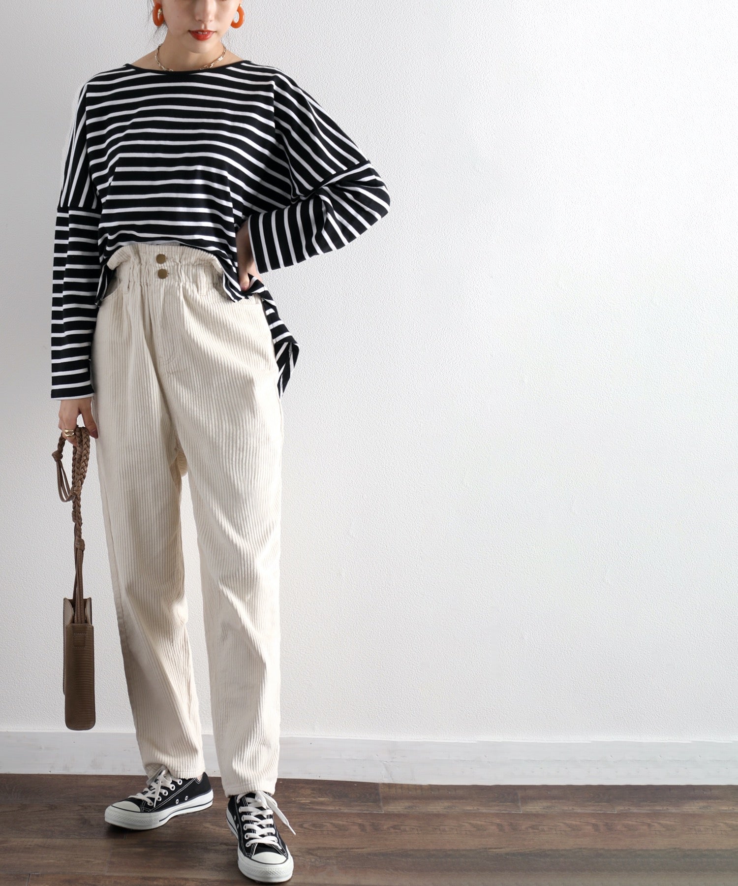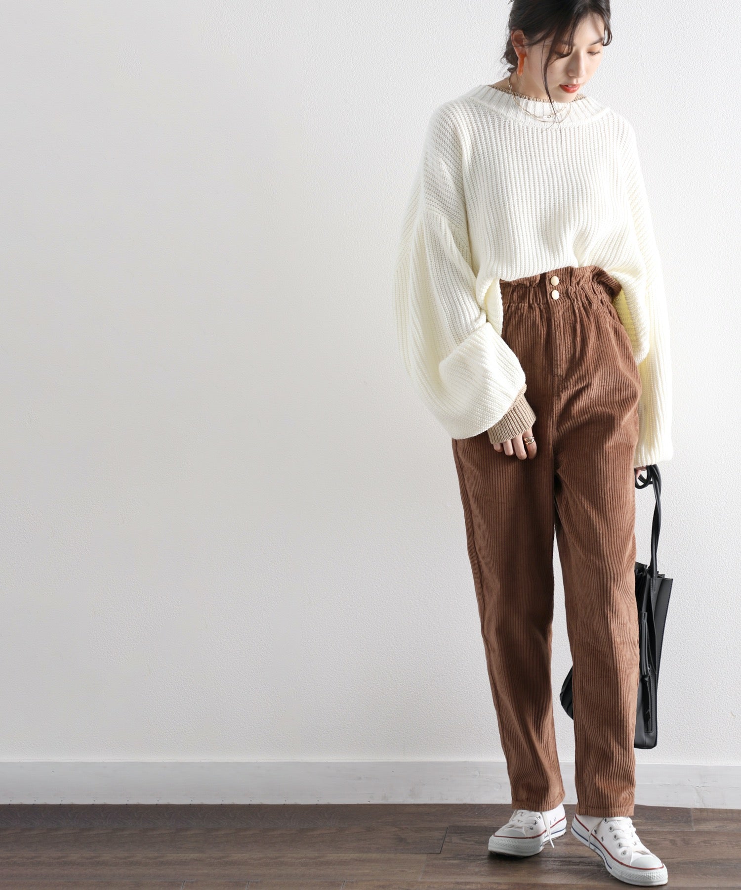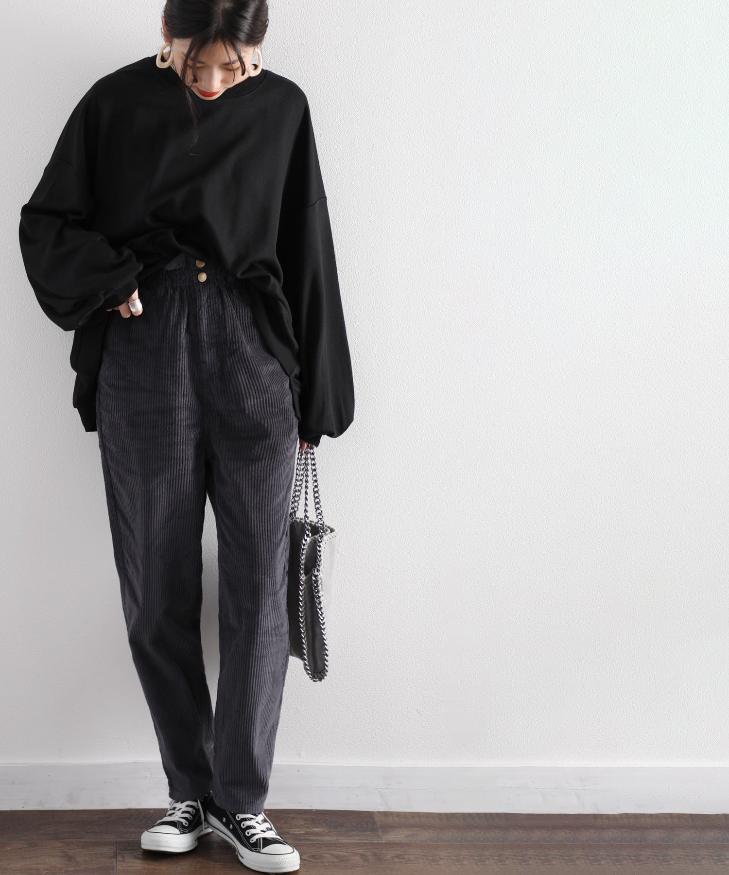 バルーンシルエットを活かすコンパクトなサイズ感のトップスも好相性。