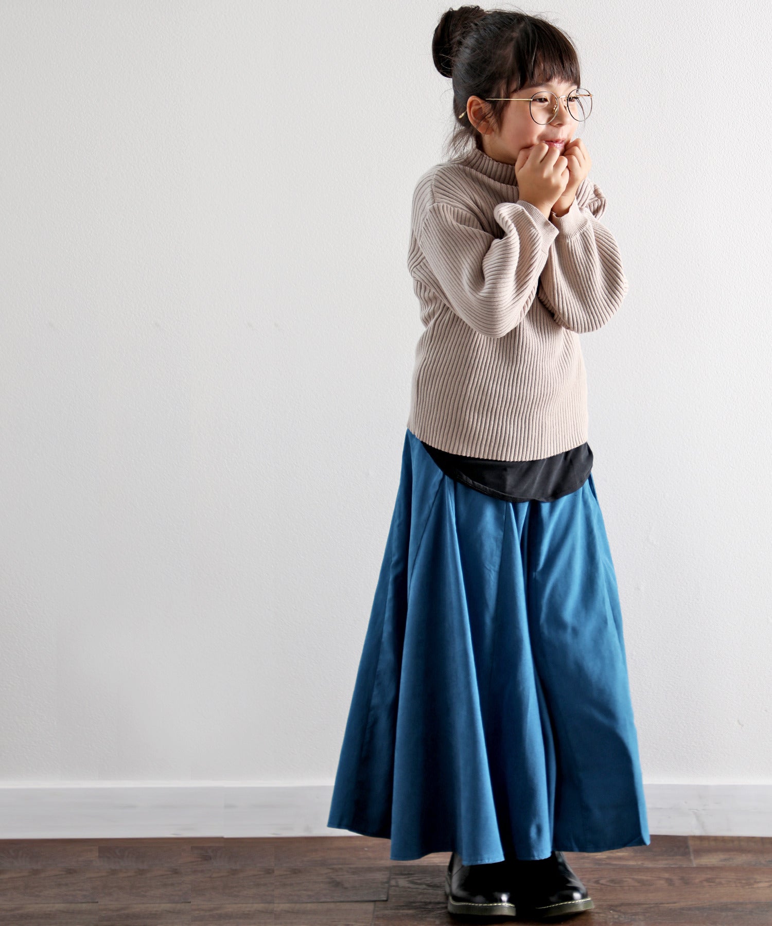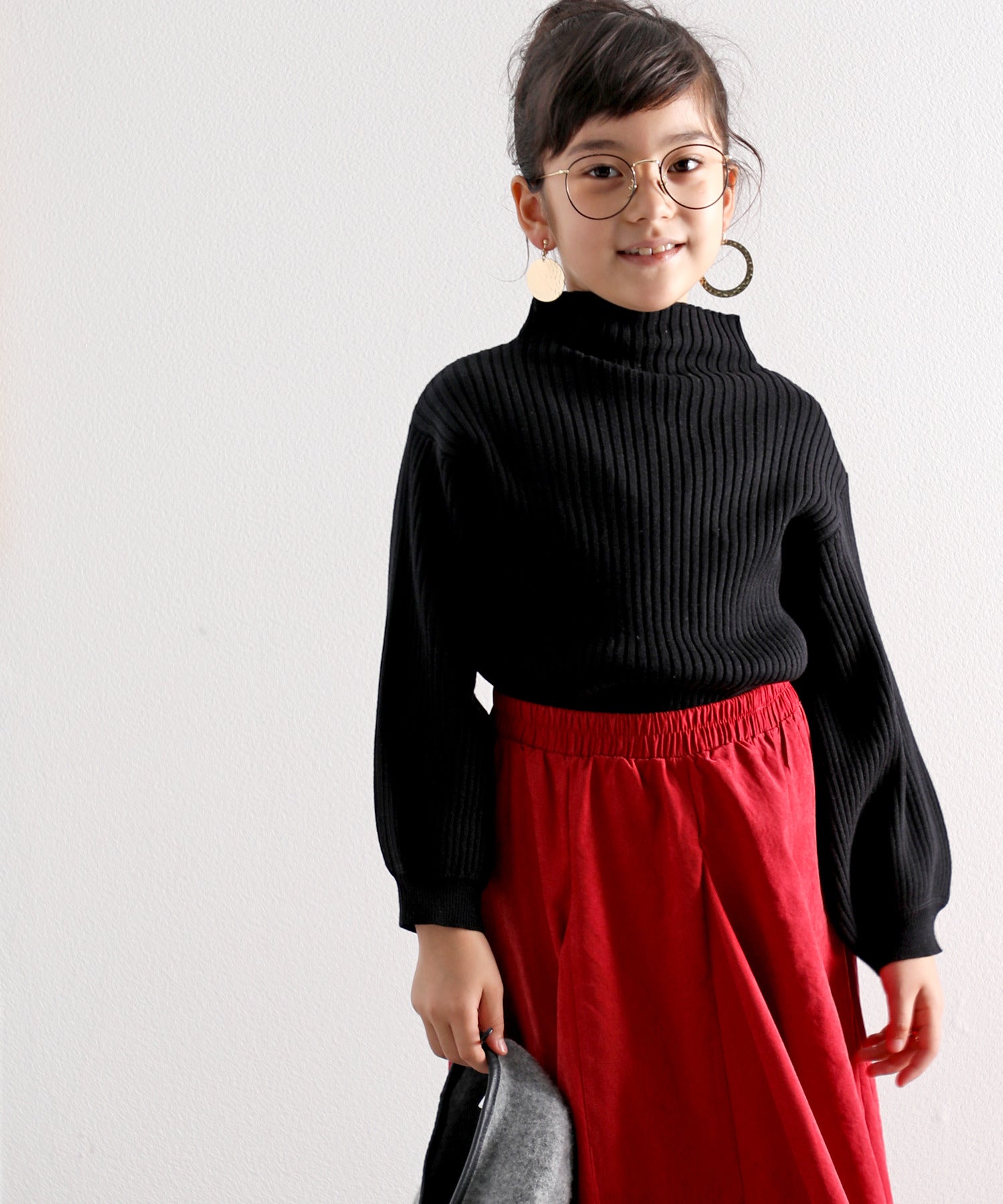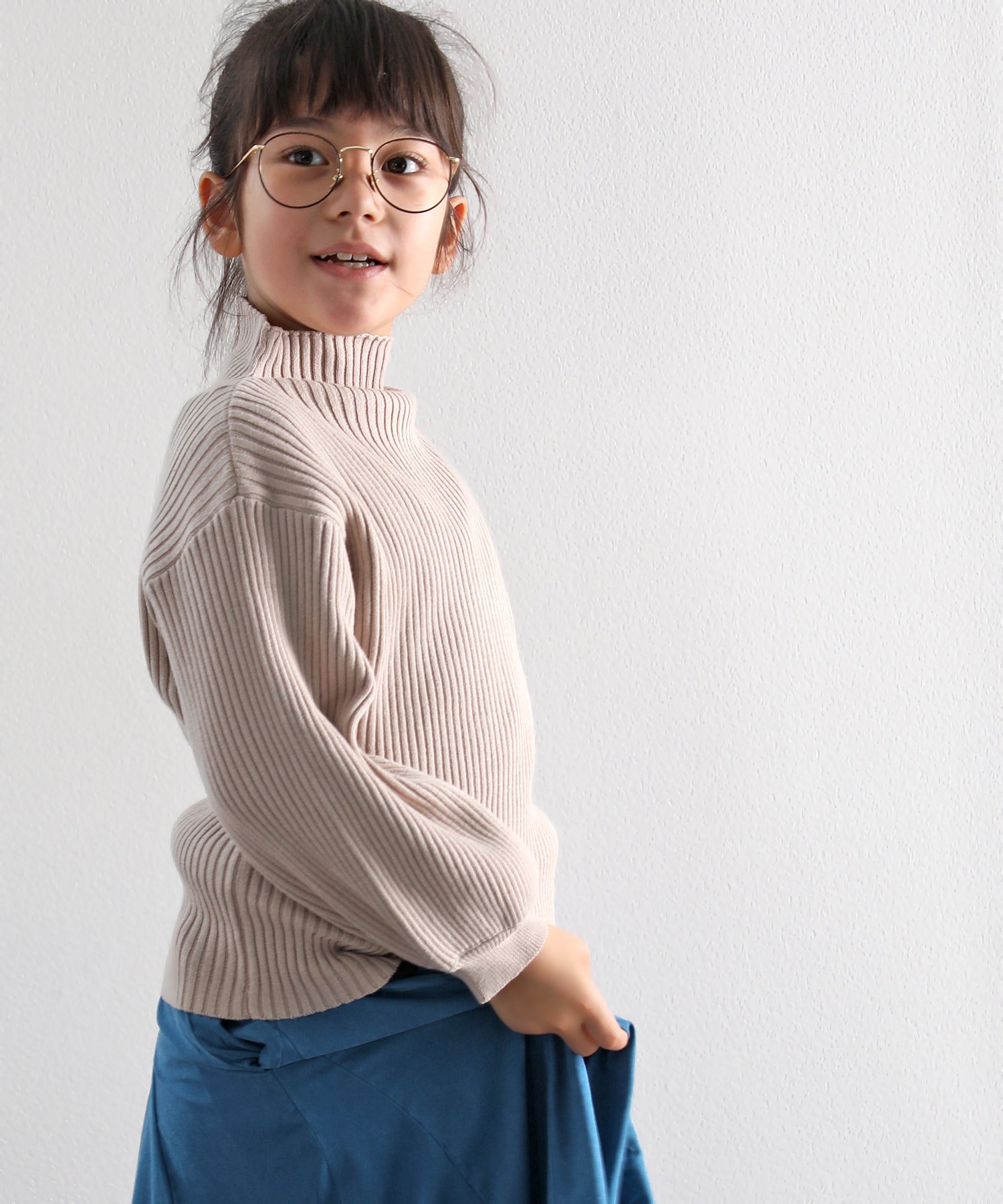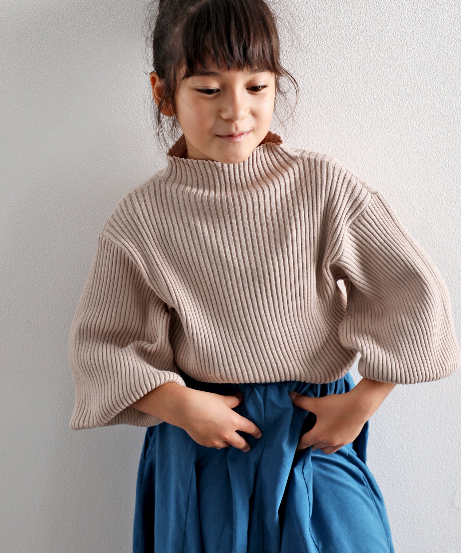 【family+】【親子コーデ】キッズ ワイドスリーブハイネックミドル丈コットンリブニット(長袖) kcl7004