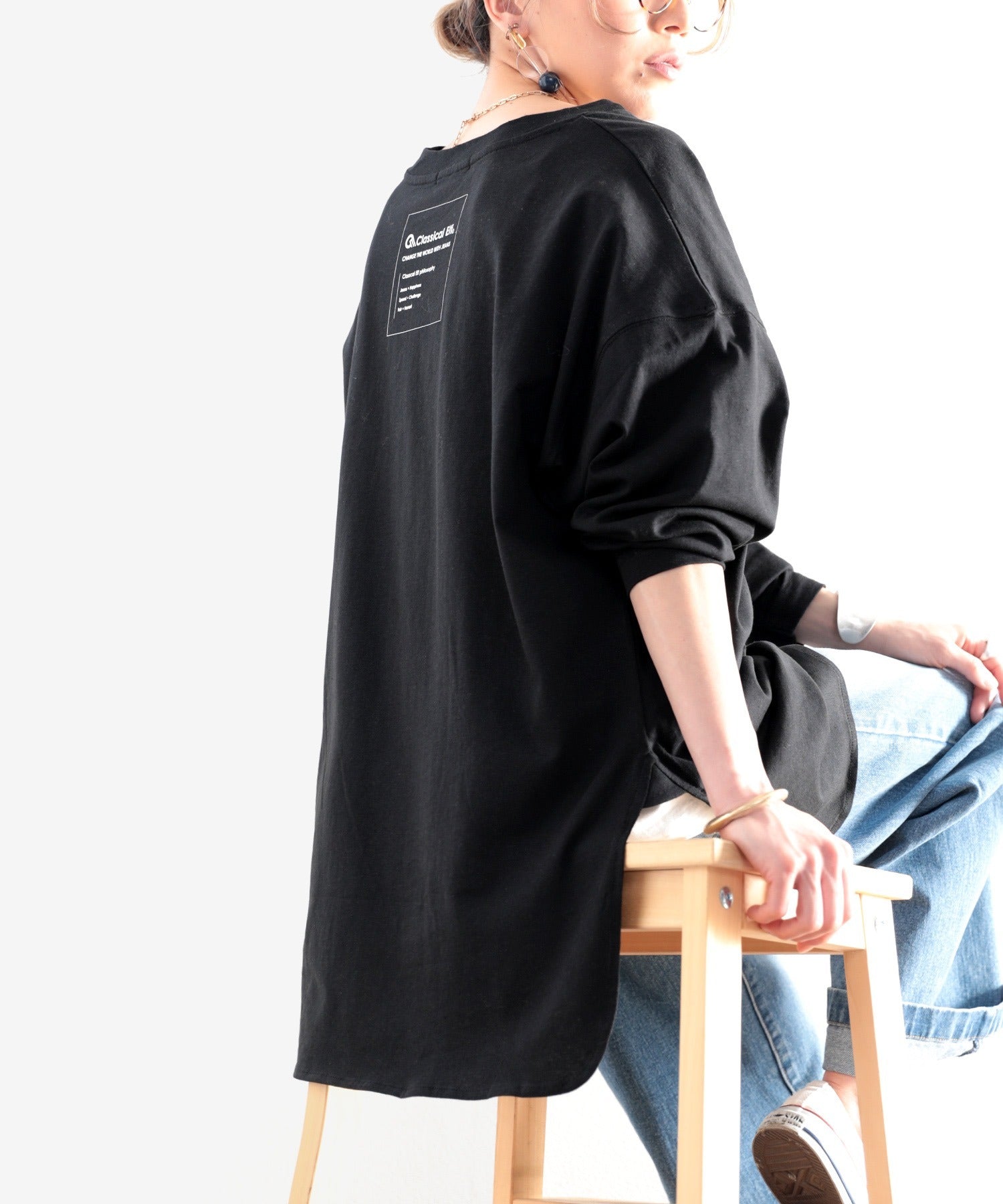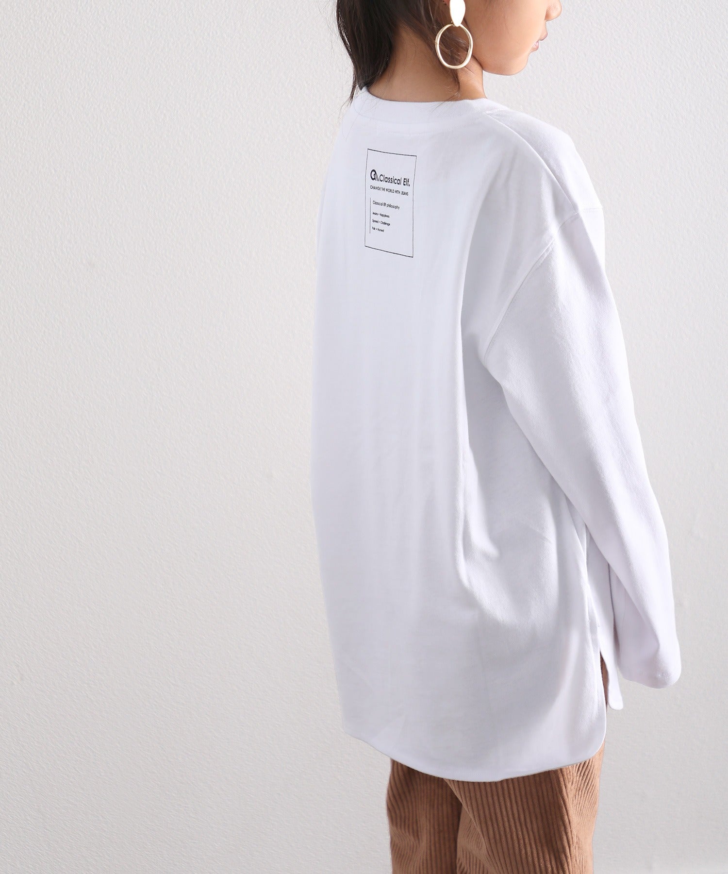 バックにさりげなくあしらったプリントでシンプルなTシャツでも一気にトレンド顔に。