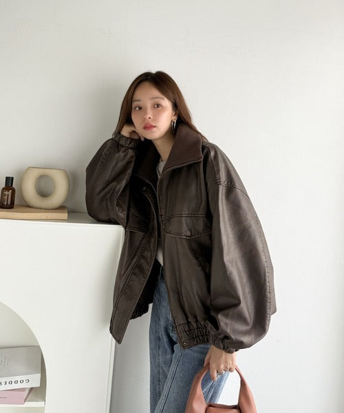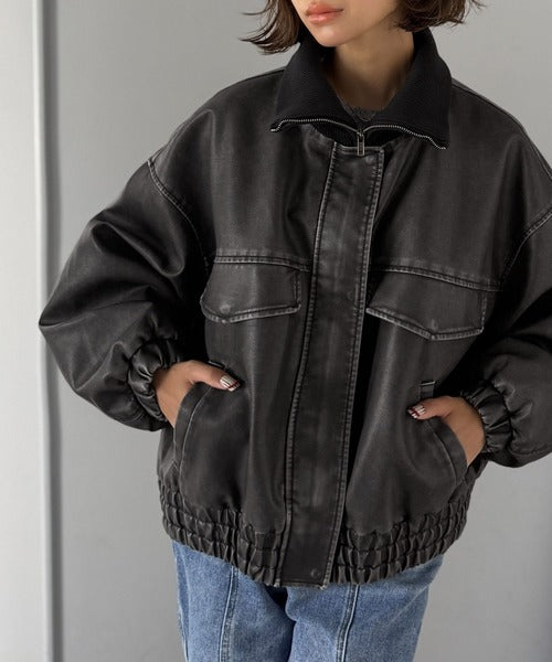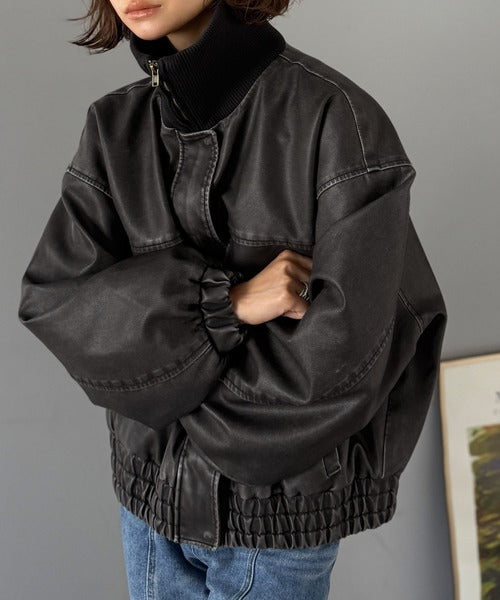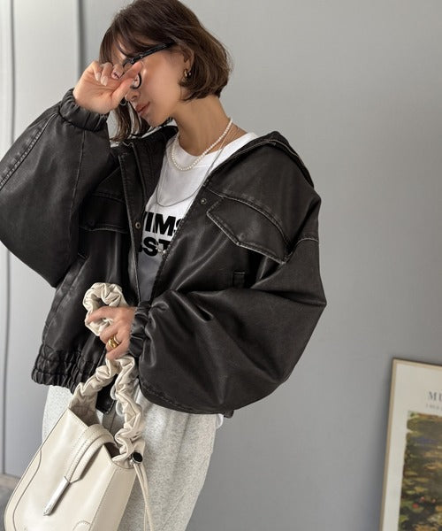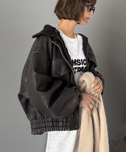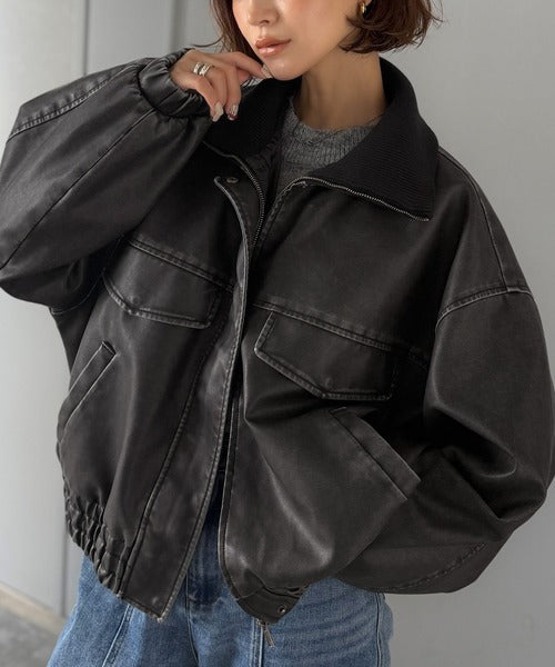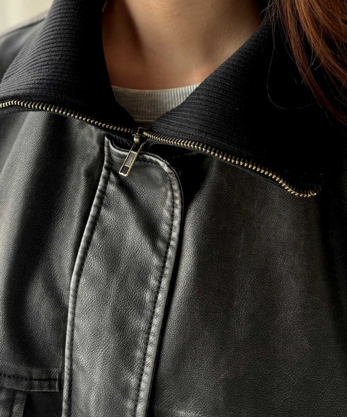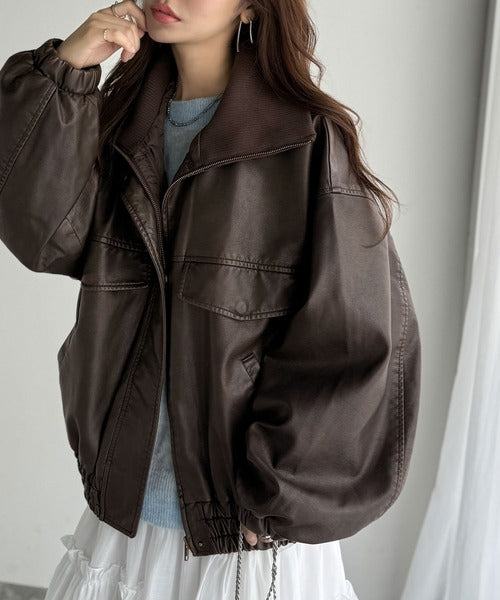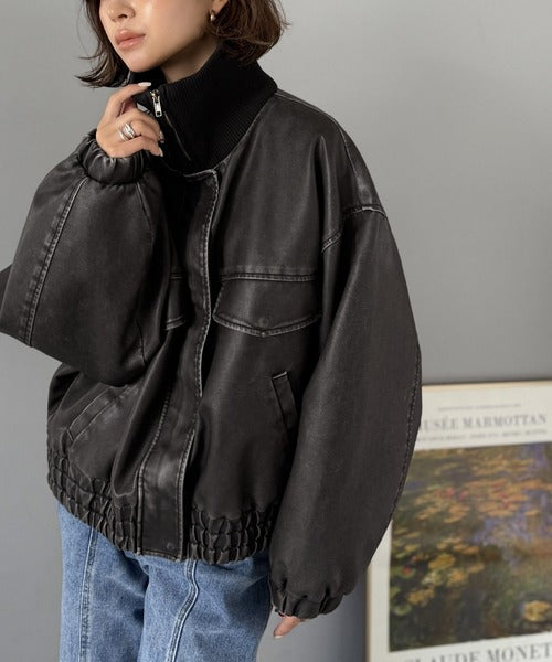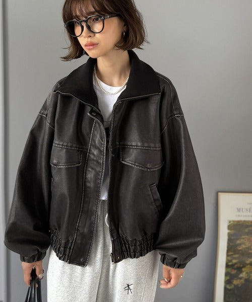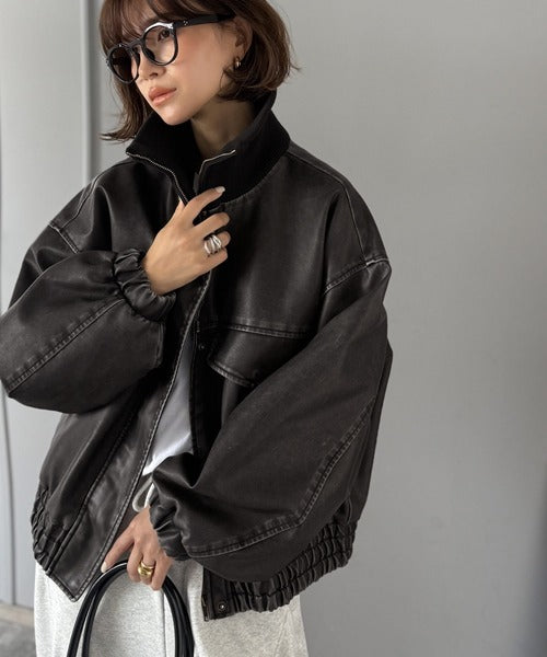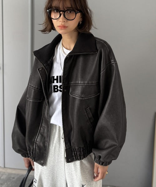 《JaVaジャバコラボ》ゆるっとシルエットで、こなれたムードをプラス。ヴィンテージ加工フェイクレザージャケット jv1070167