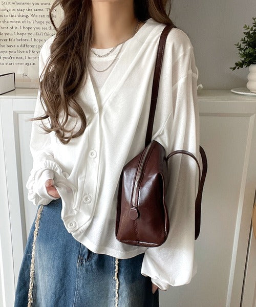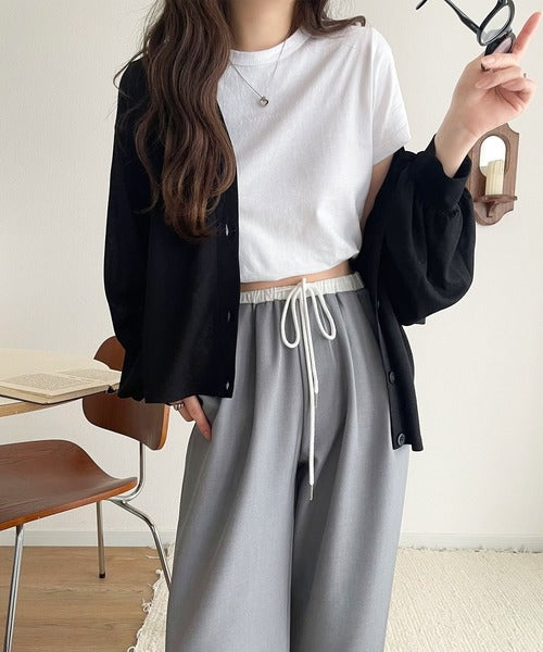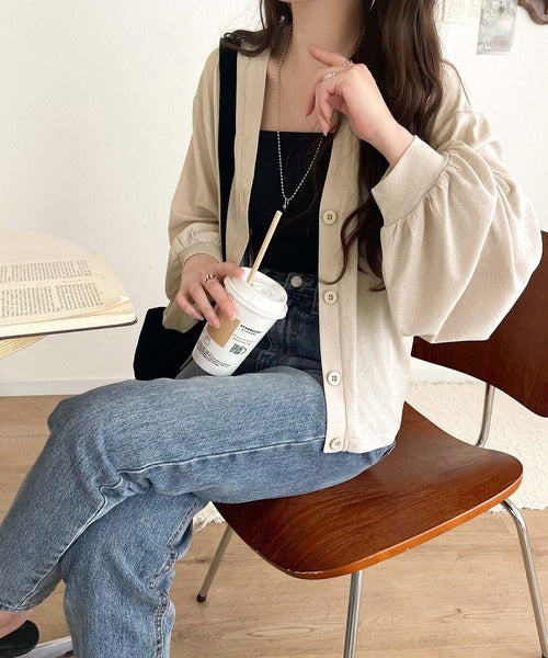 ショート丈のカーディガンは、身長に関係なくスタイルアップ効果があり、