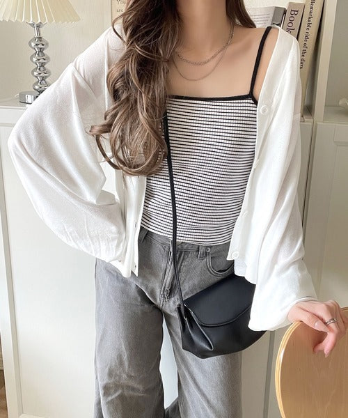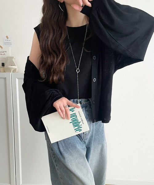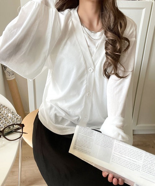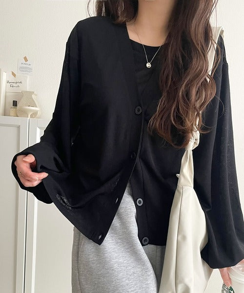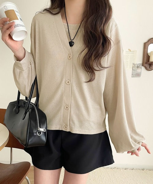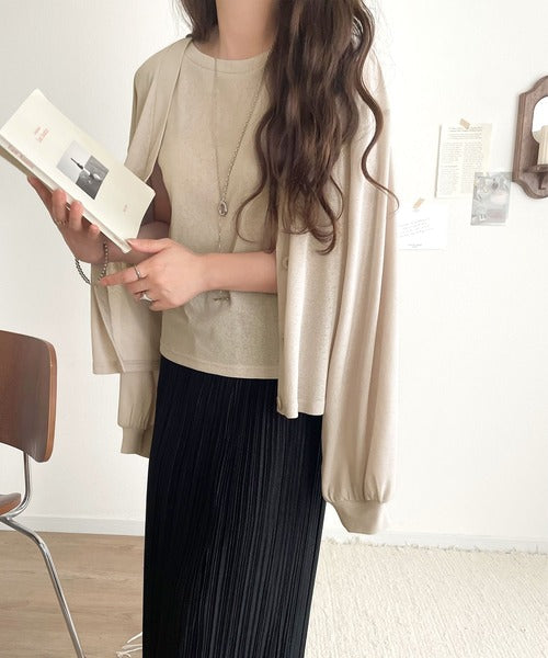 カーディガンは程よくゆとりがあり、肌に張り付かず涼しげに着こなせ、軽さと通気性が抜群。