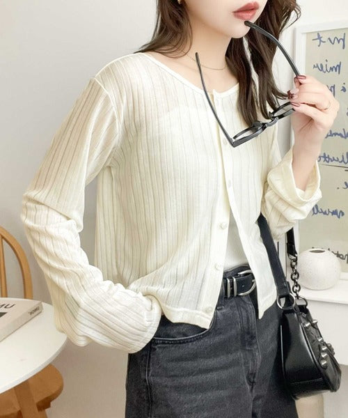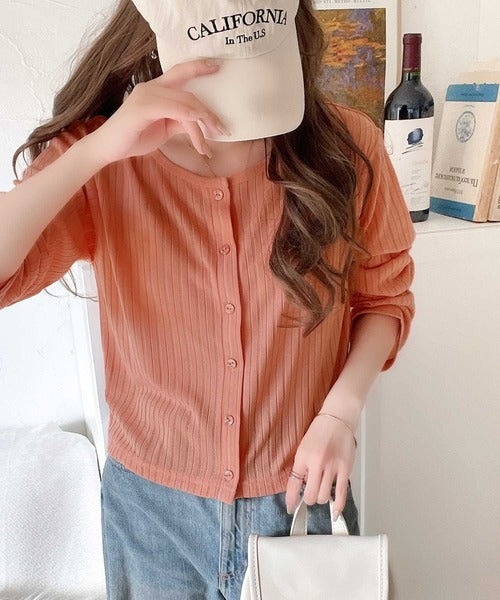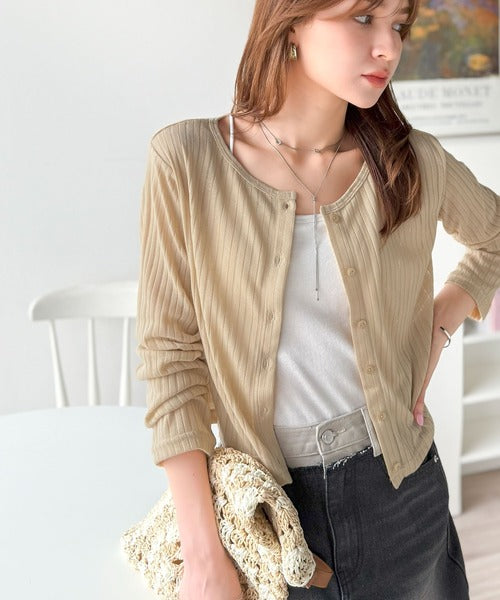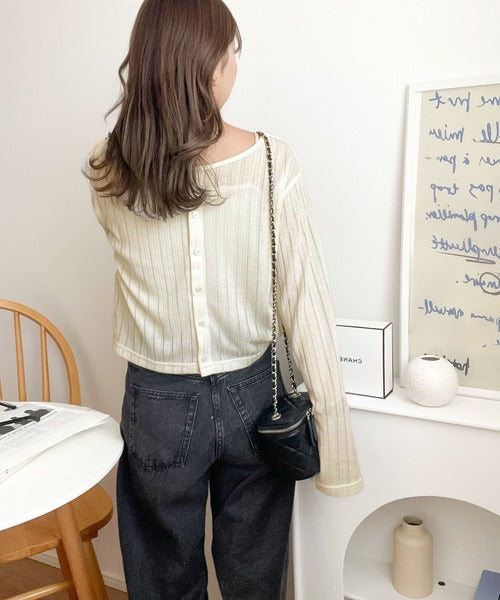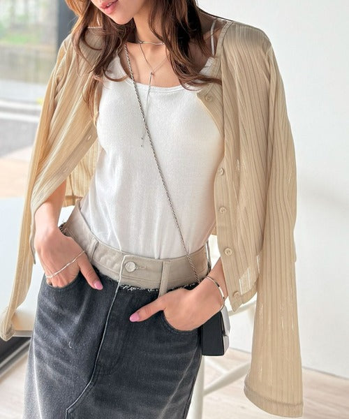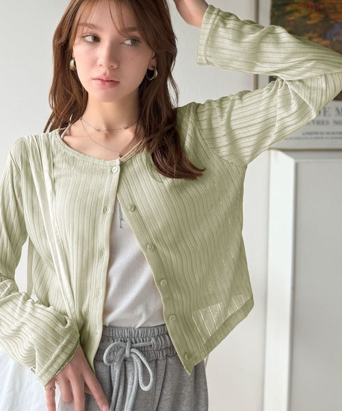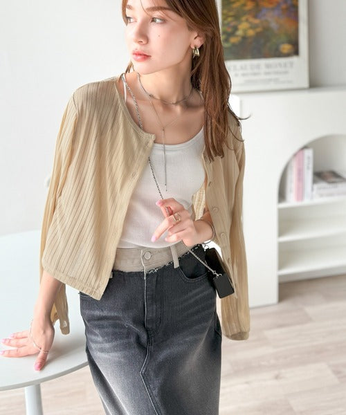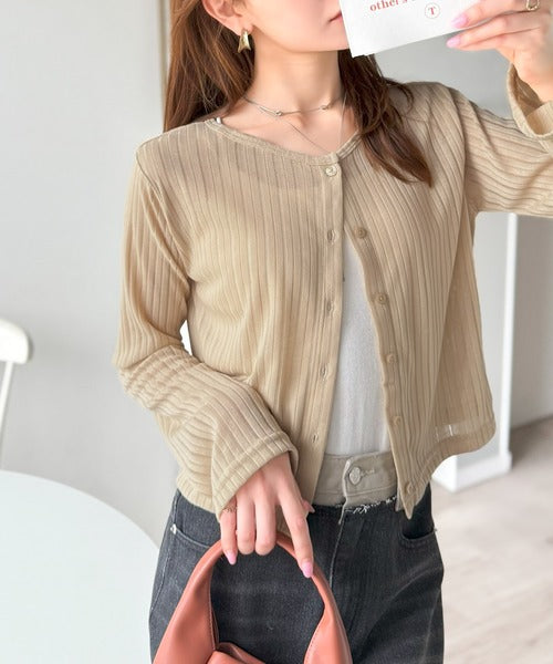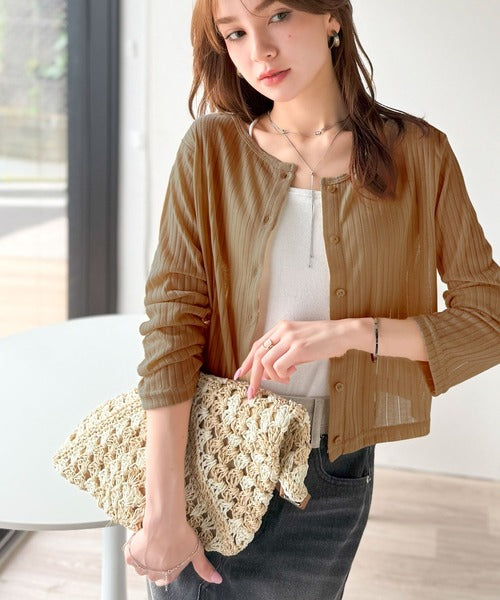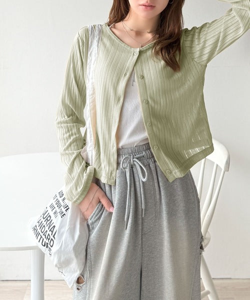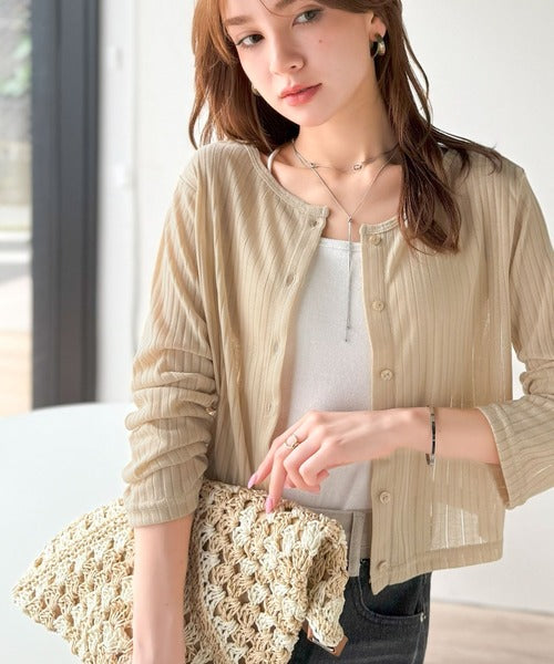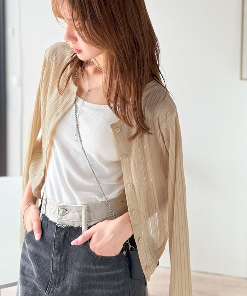 シアー素材と明るいカラーリングが軽やかな印象。2wayクルーネックシアーリブカーディガン(ショート丈) ce1020205