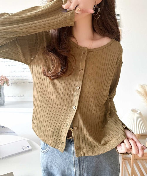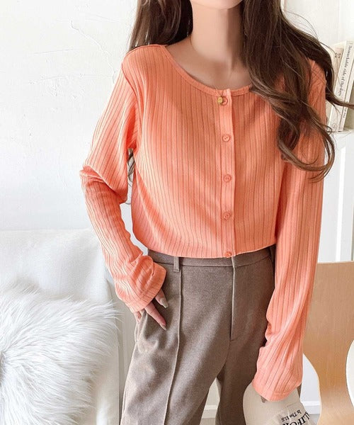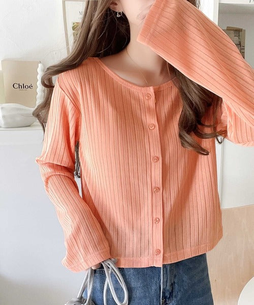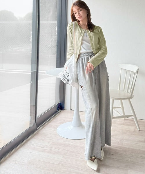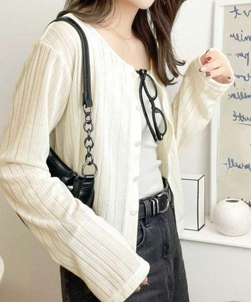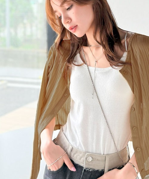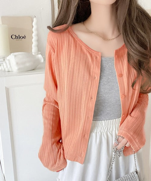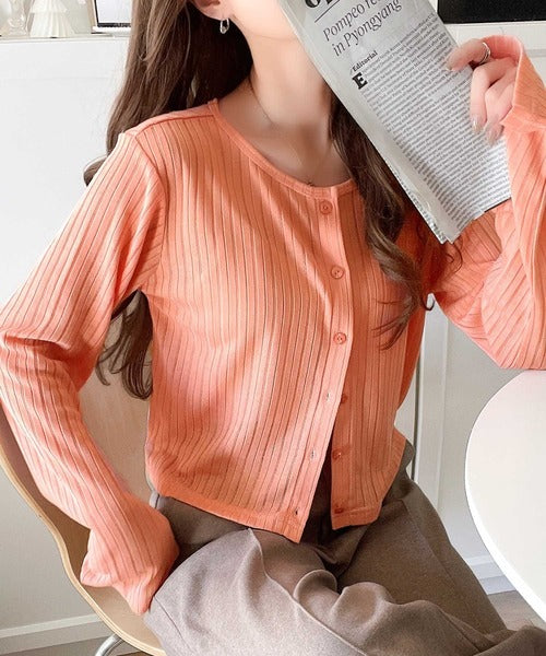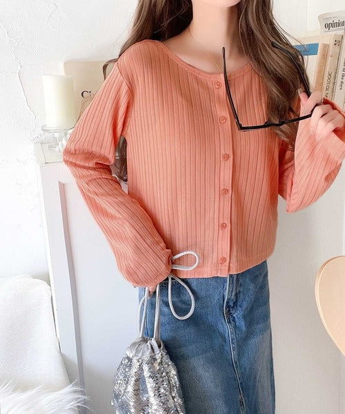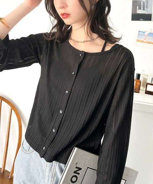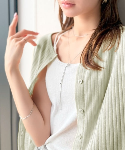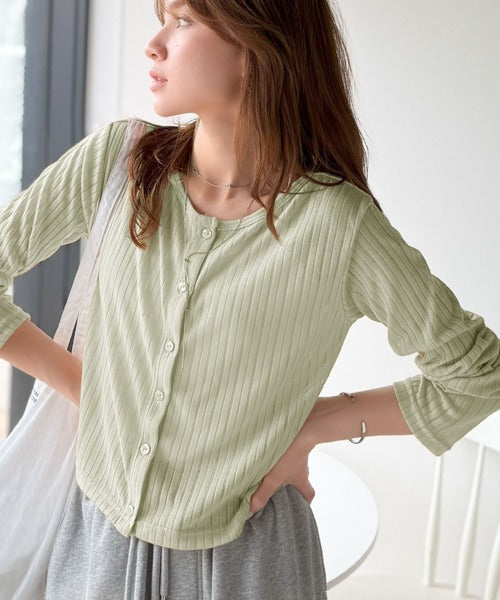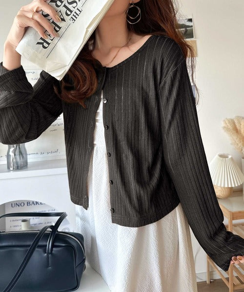 シアー素材と明るいカラーリングが軽やかな印象。2wayクルーネックシアーリブカーディガン(ショート丈) ce1020205