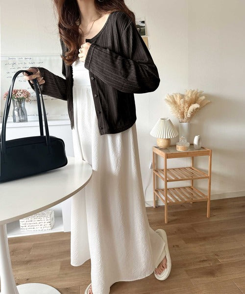 ボタンをバックにし、ワンピースのインナーとしてレイヤードスタイルにもピッタリ。