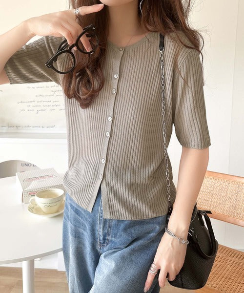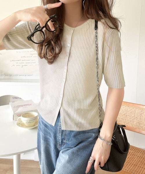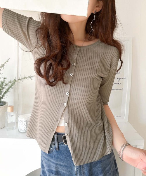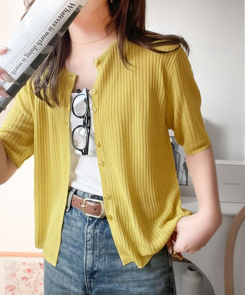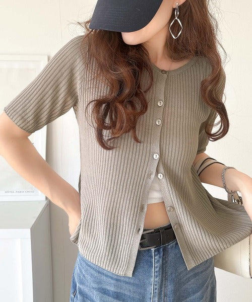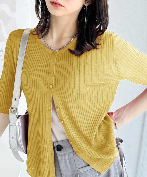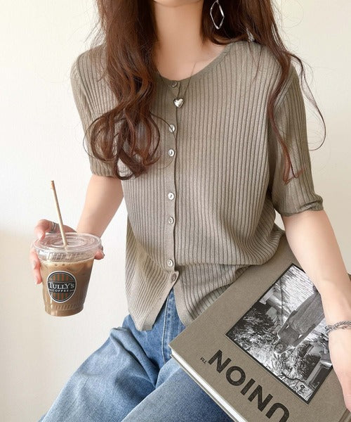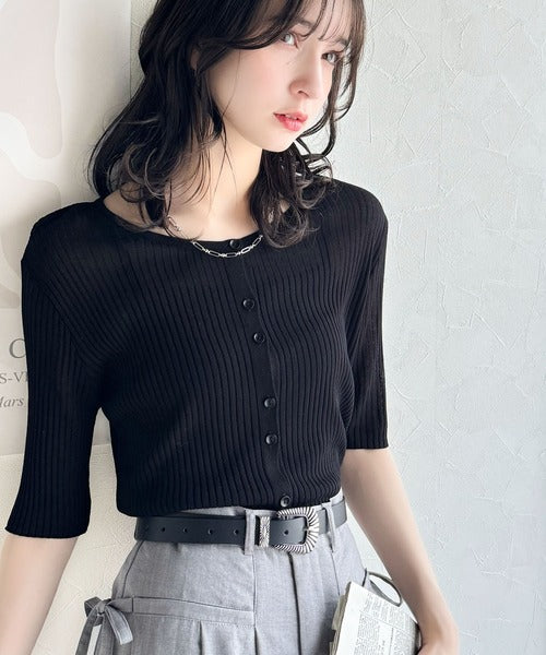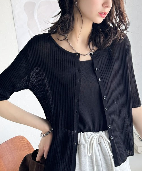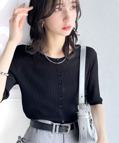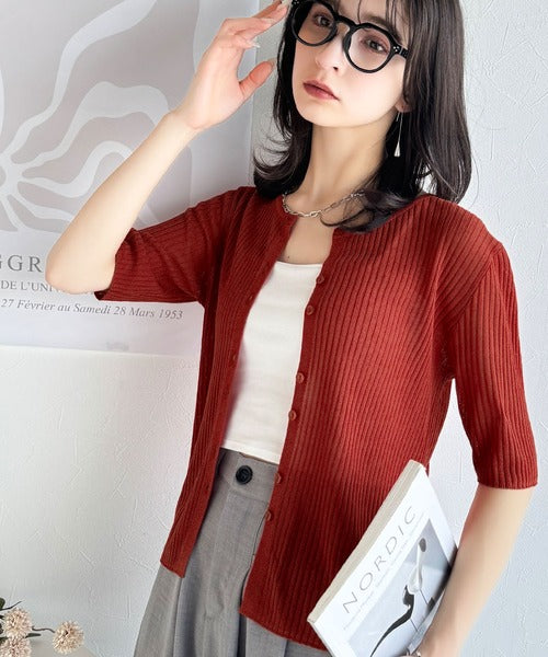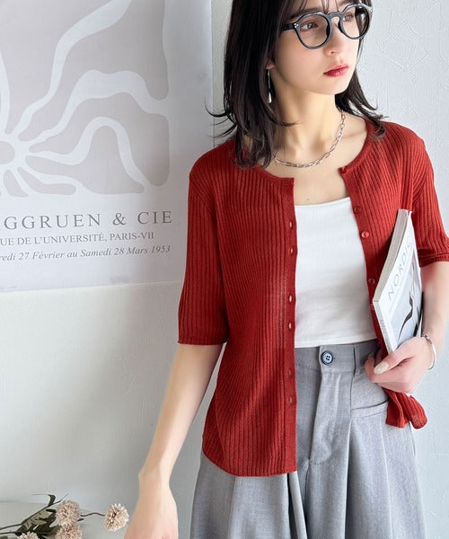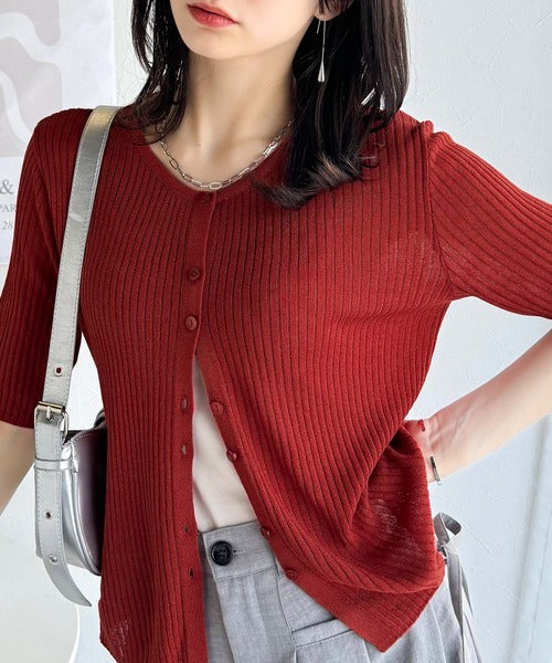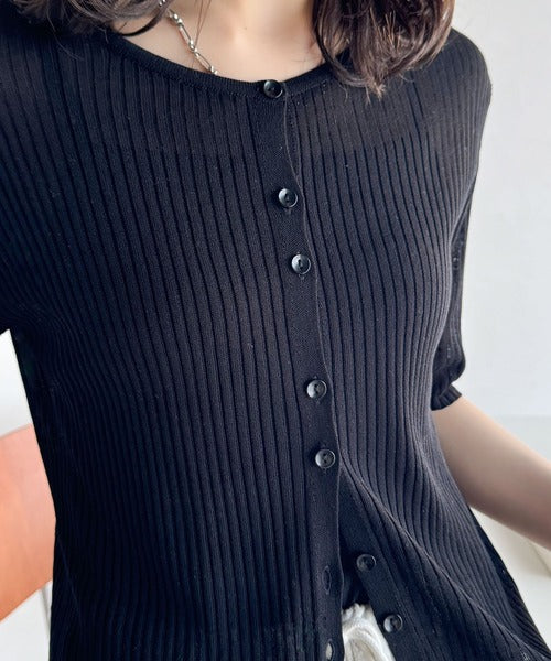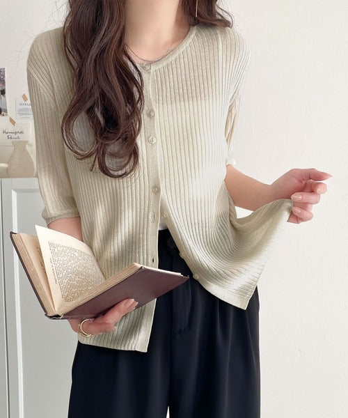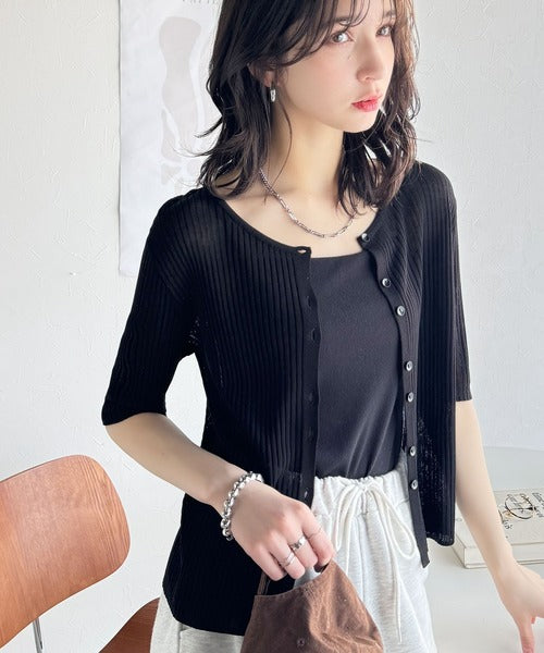 シアーな素材感と、縦ラインを強調するリブ編みが魅力の半袖カーディガン。