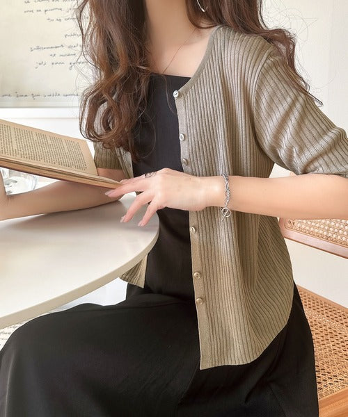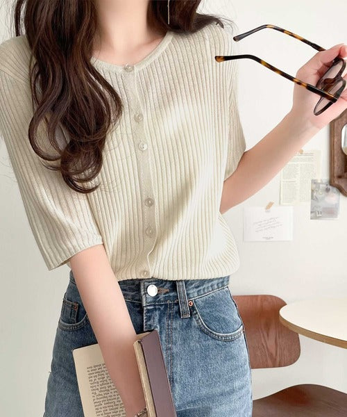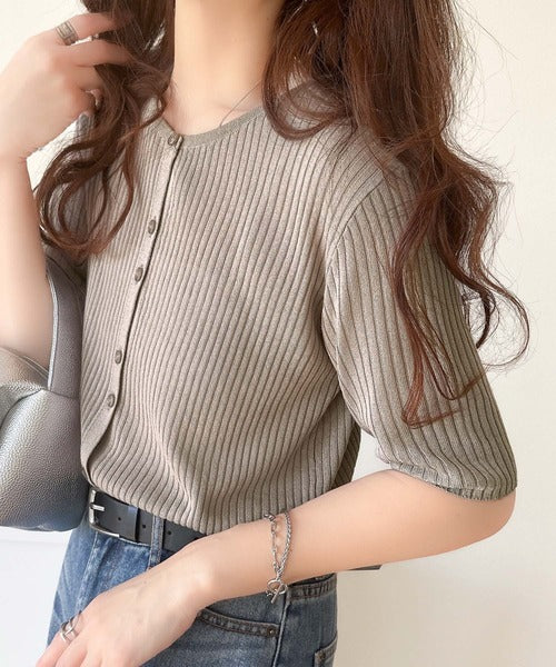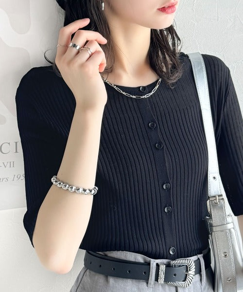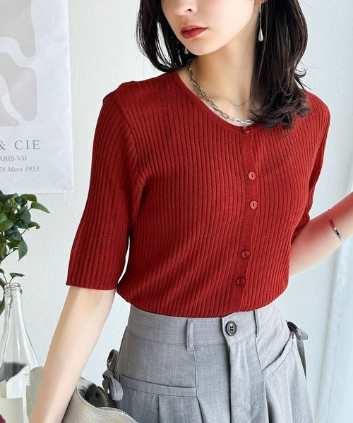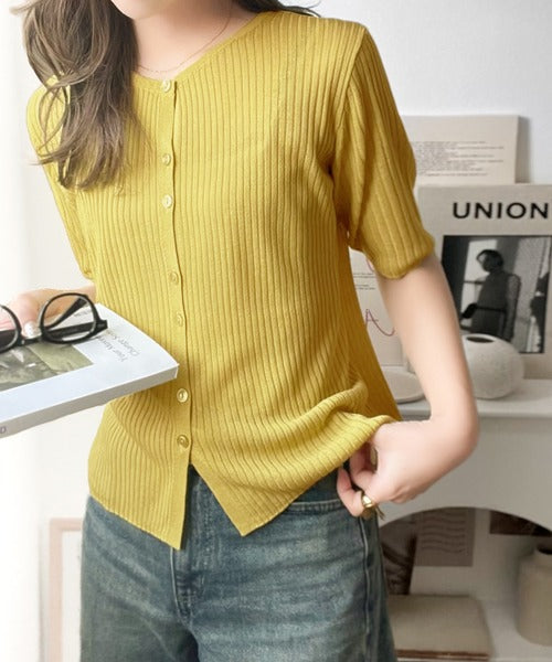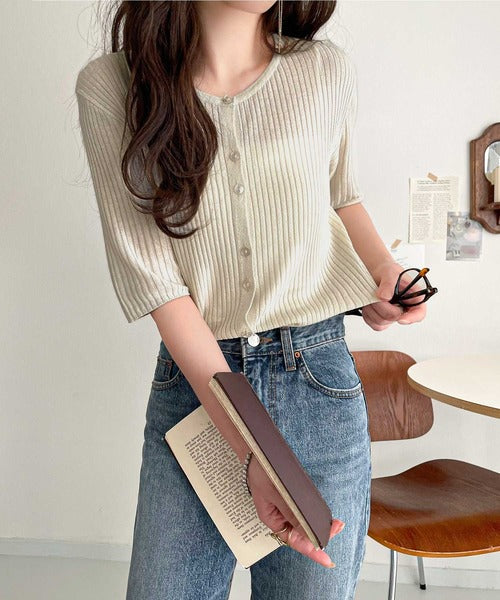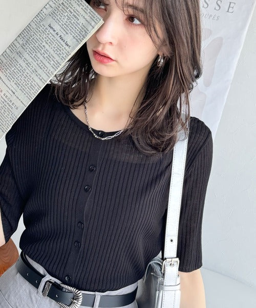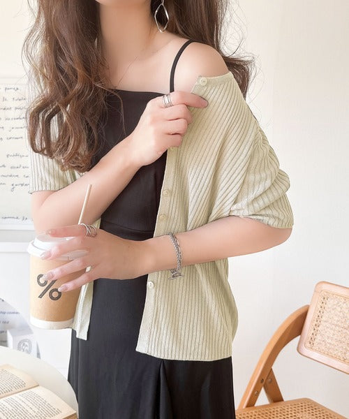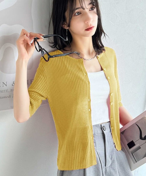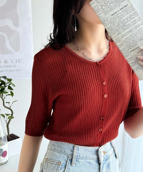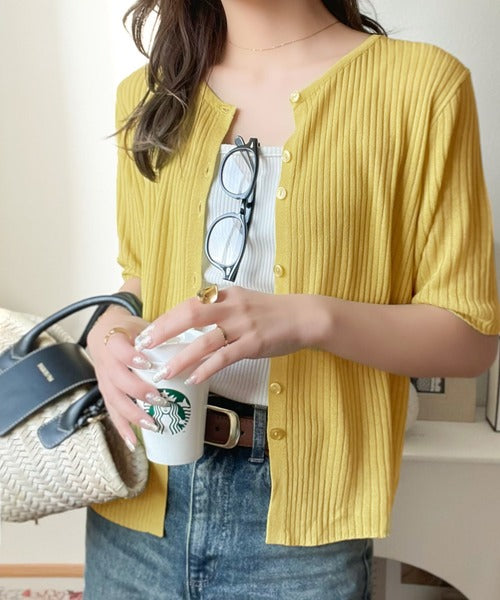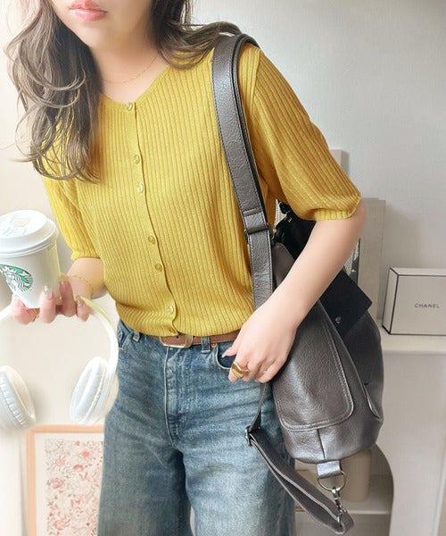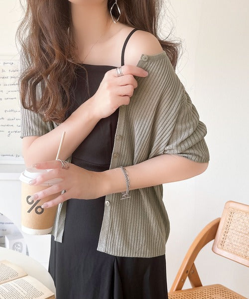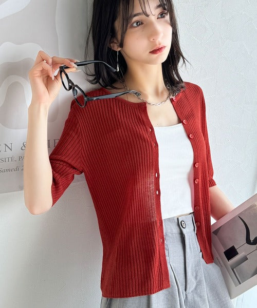 シアーな素材感と、縦ラインを強調するリブ編みが魅力の半袖カーディガン。