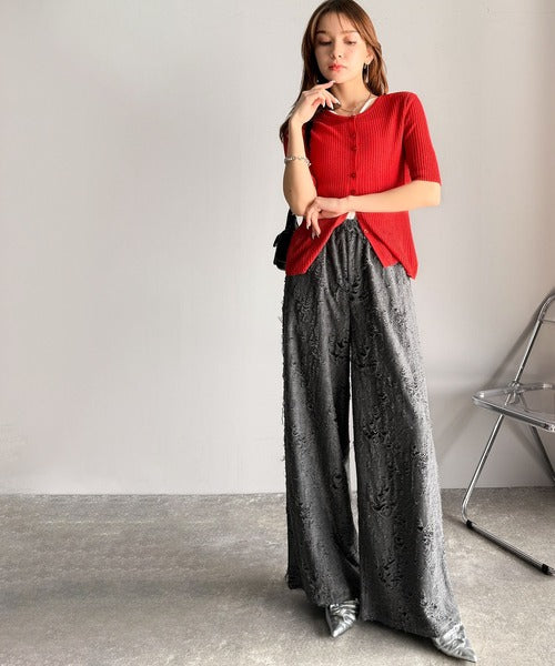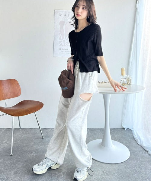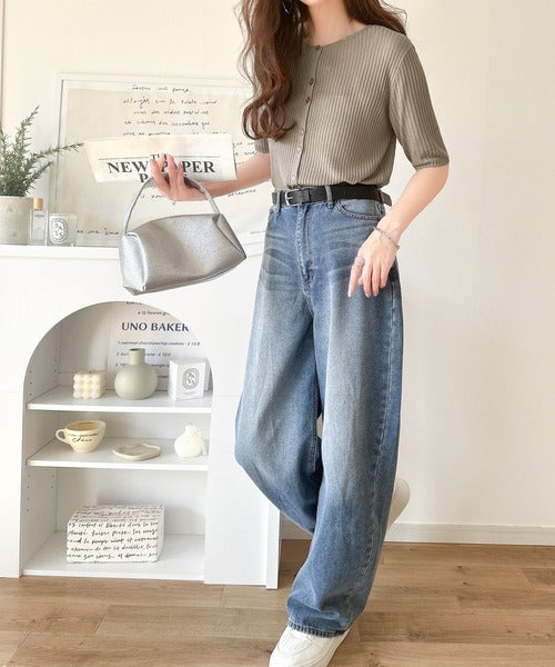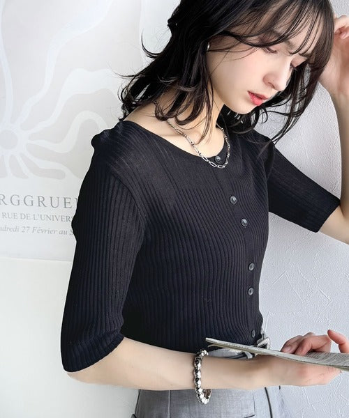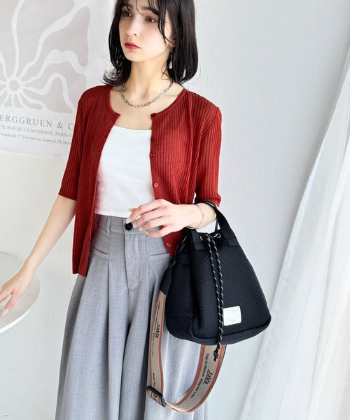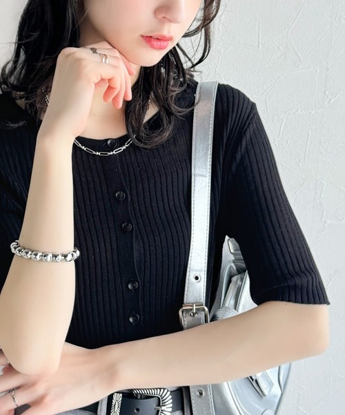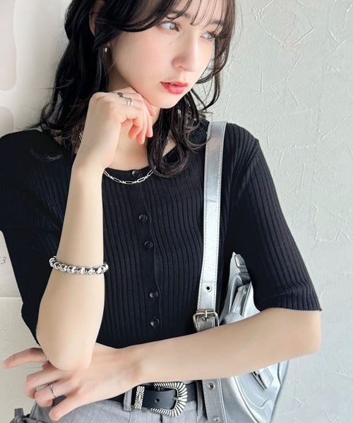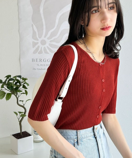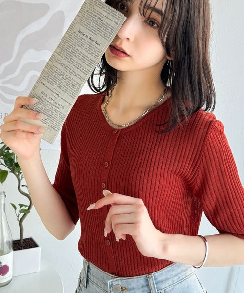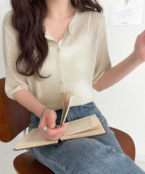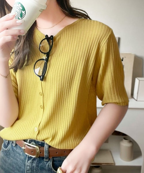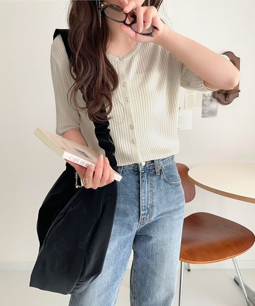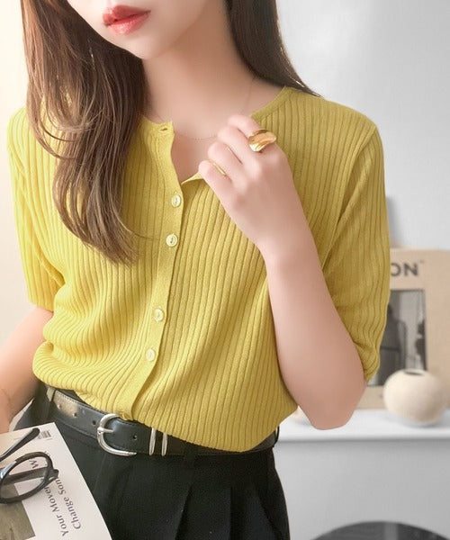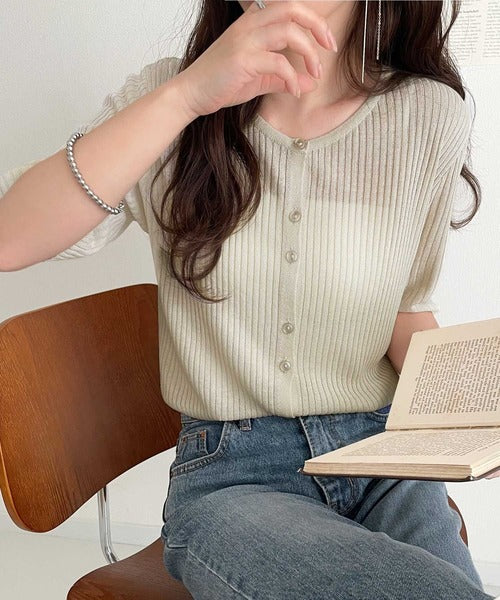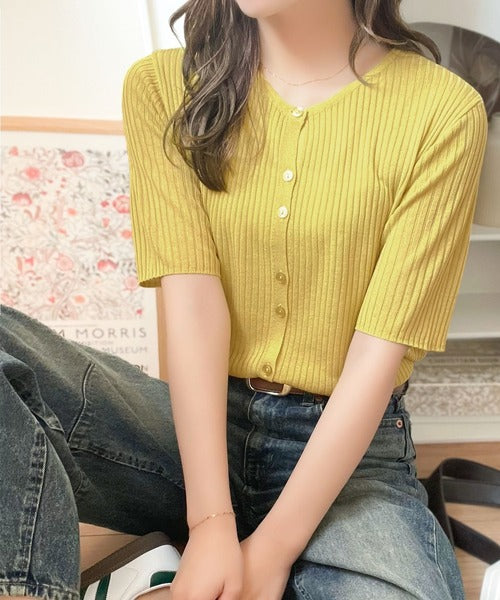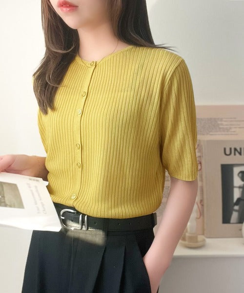 シアーな素材感と、縦ラインを強調するリブ編みが魅力の半袖カーディガン。