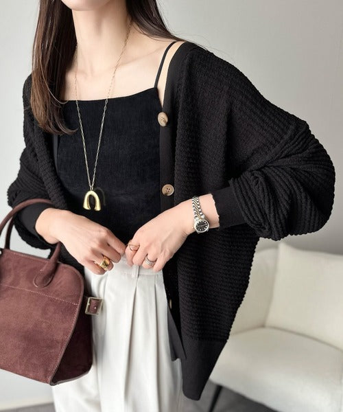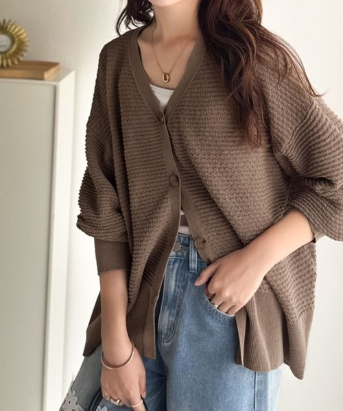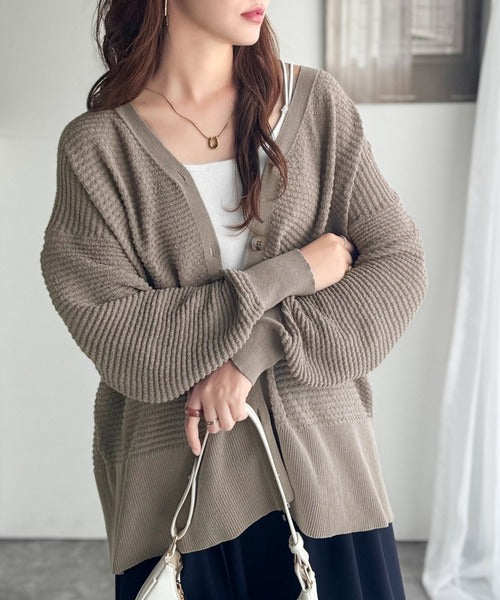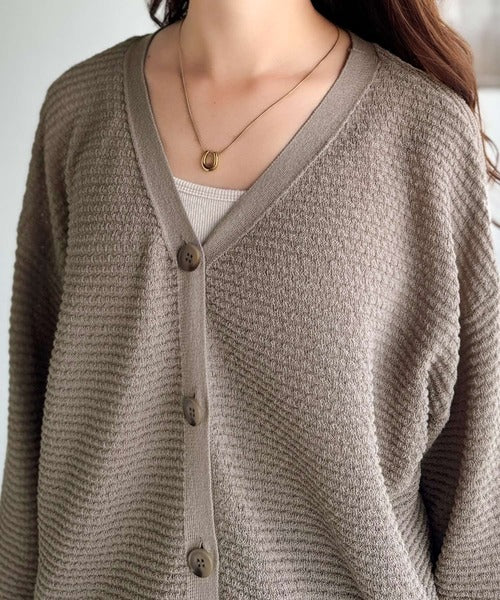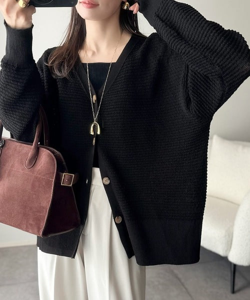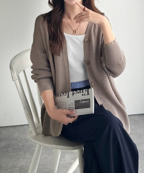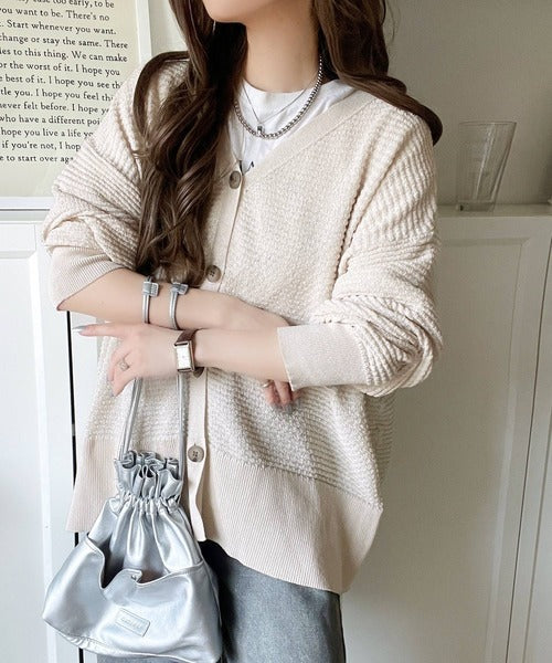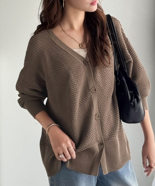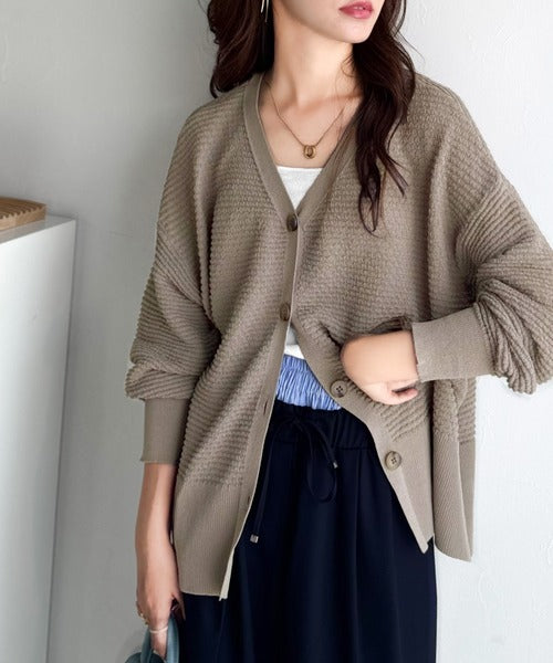 立体感のあるブークレ編みが印象的なニットカーディガン。