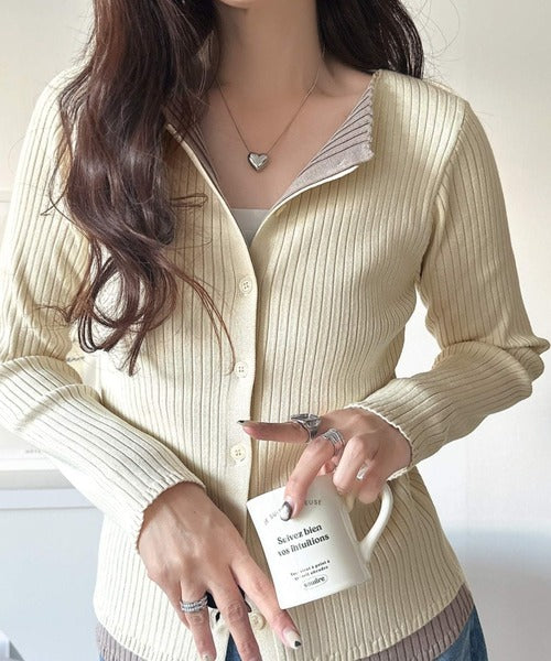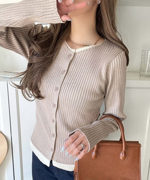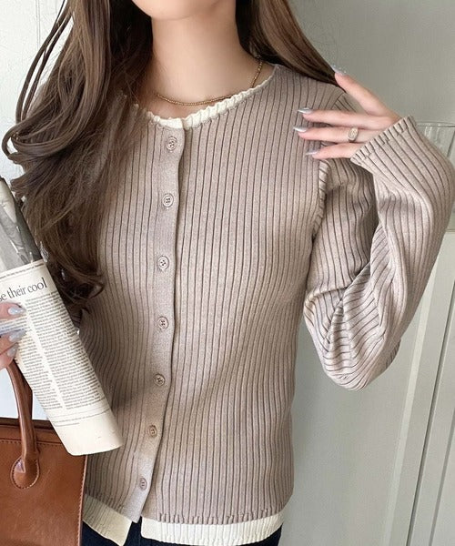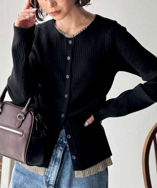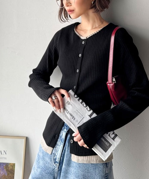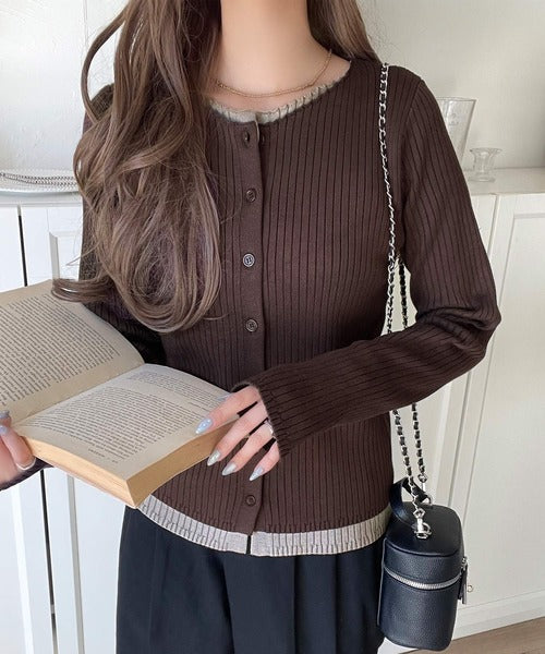 レイヤード風デザインでこなれ感アップ◎重ね着風配色リブカーディガントップス(長袖) ce1360005