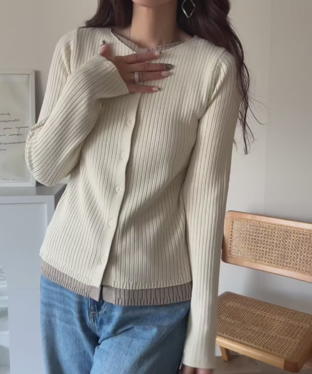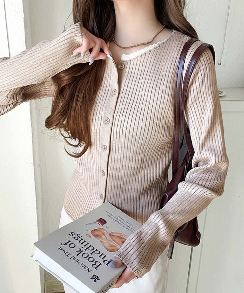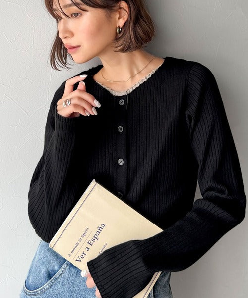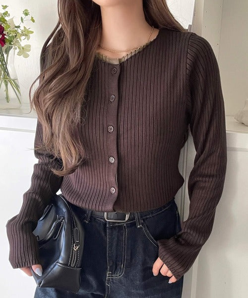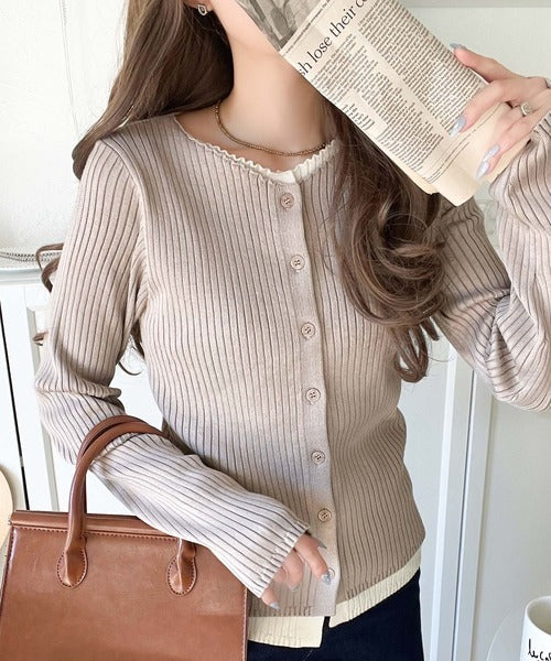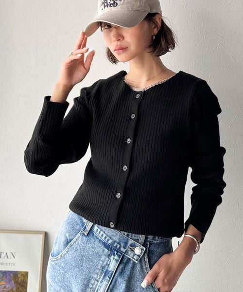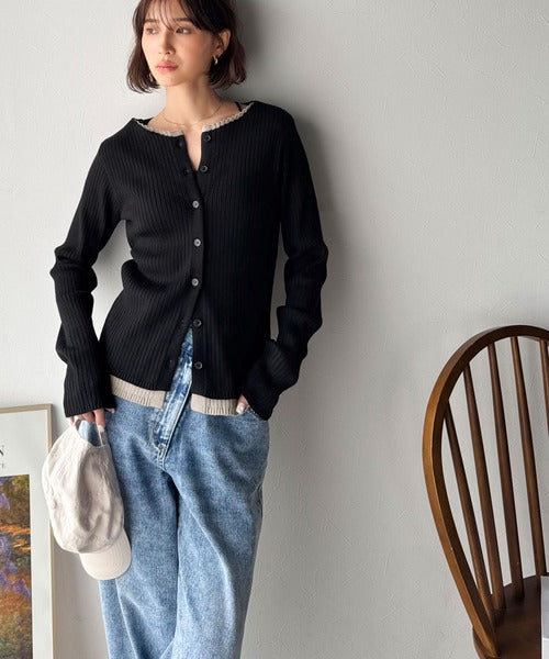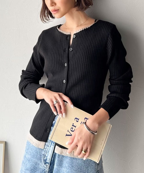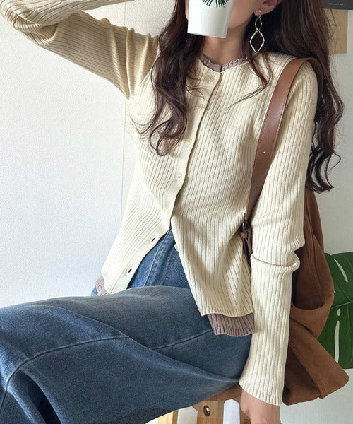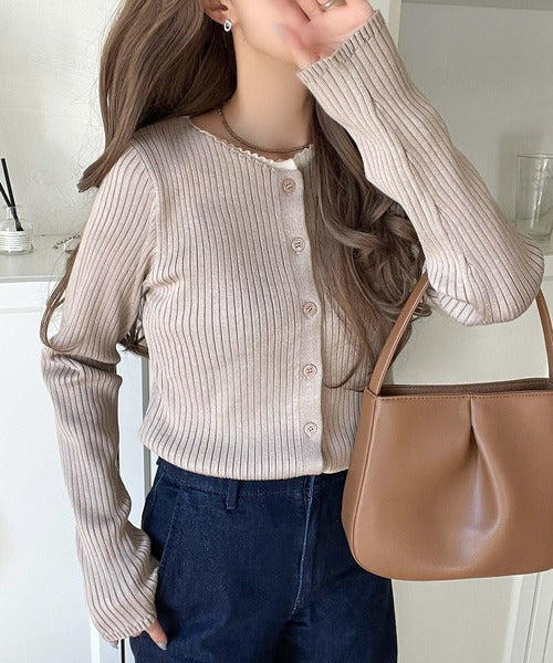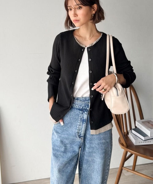 洗練された印象を与えるリブ編みのカーディガントップス。
