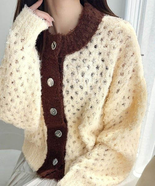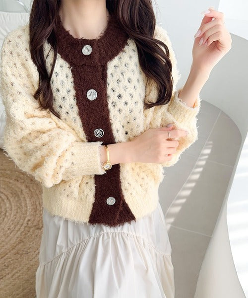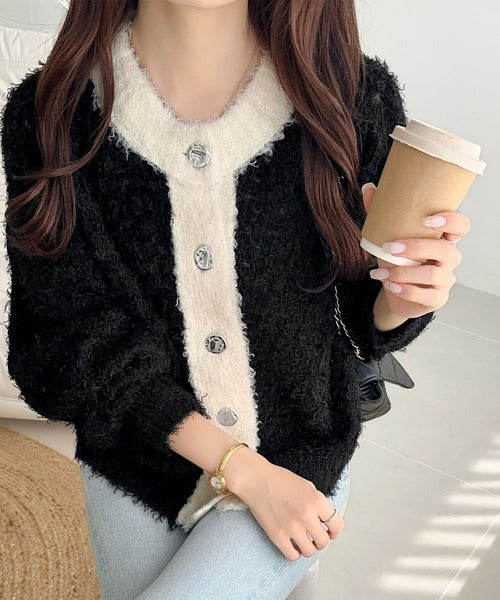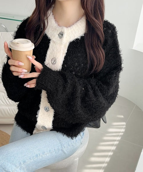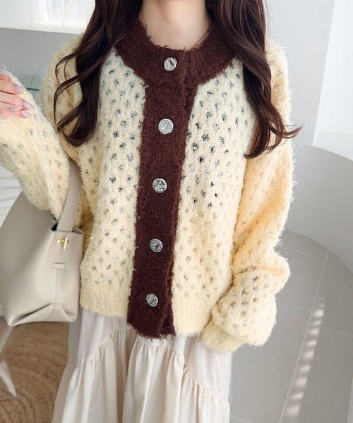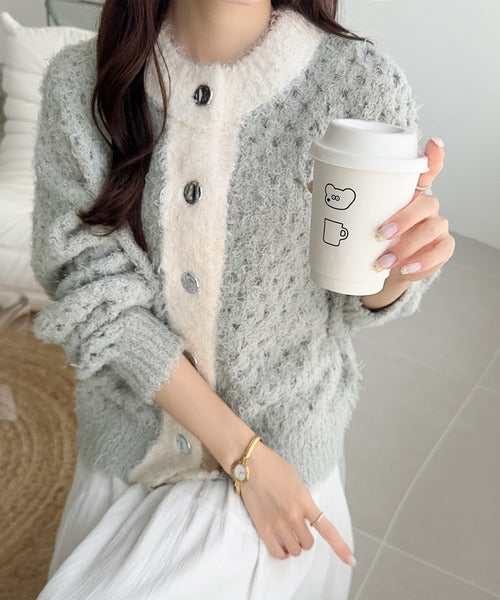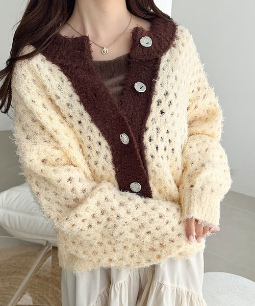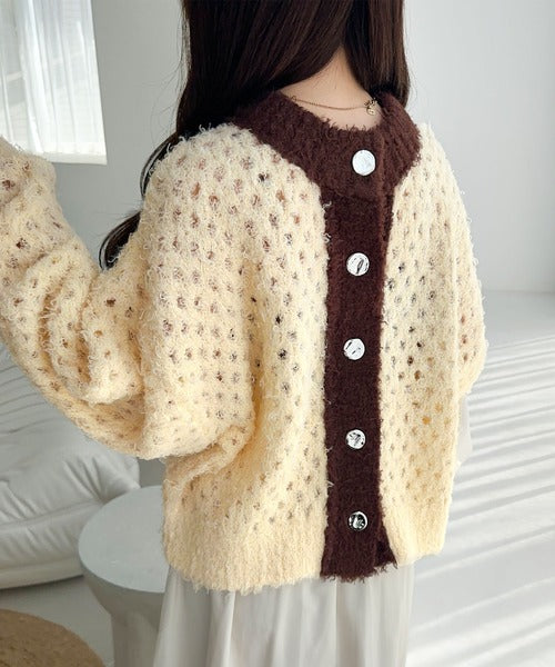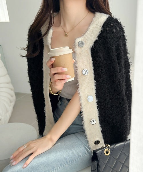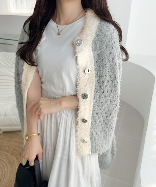 【mily bilet】バイカラー映えがお洒落見えの鍵。メタルボタン使いフェザーヤーン前後2wayニットカーディガン mi1029157