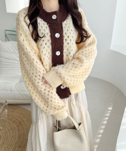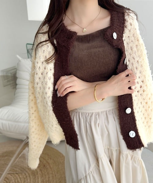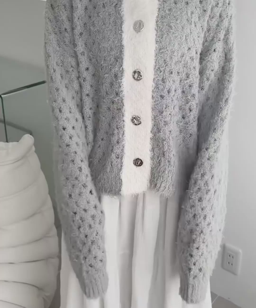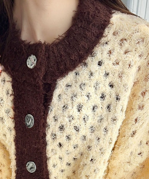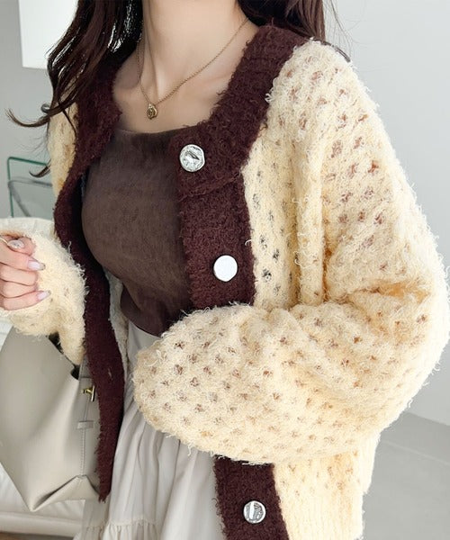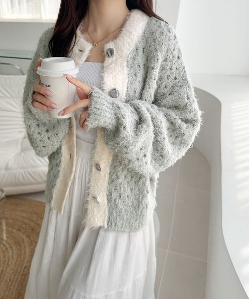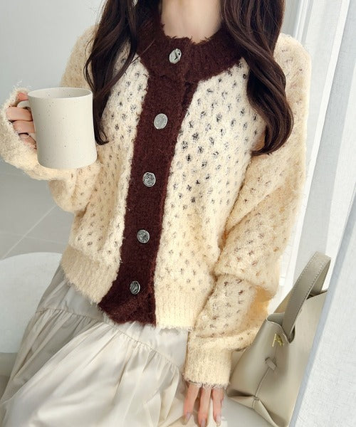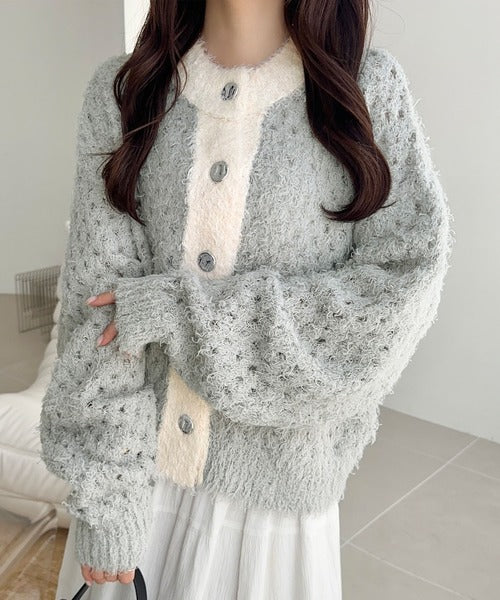 【mily bilet】バイカラー映えがお洒落見えの鍵。メタルボタン使いフェザーヤーン前後2wayニットカーディガン mi1029157