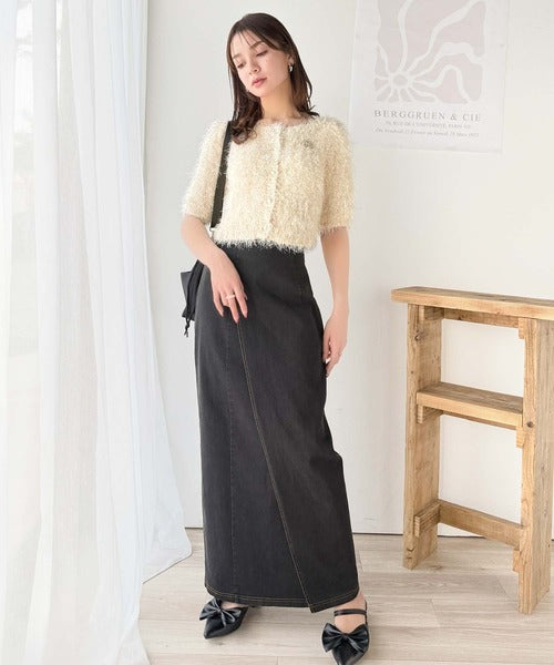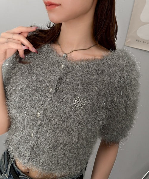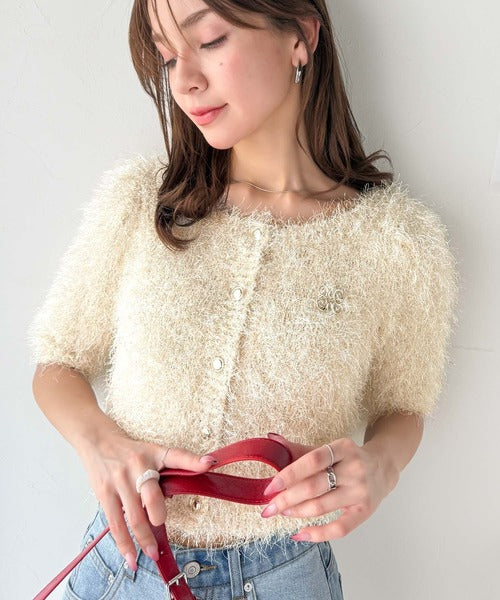 上品なラメ入りシャギー素材とブローチが目を惹くカーディガン。