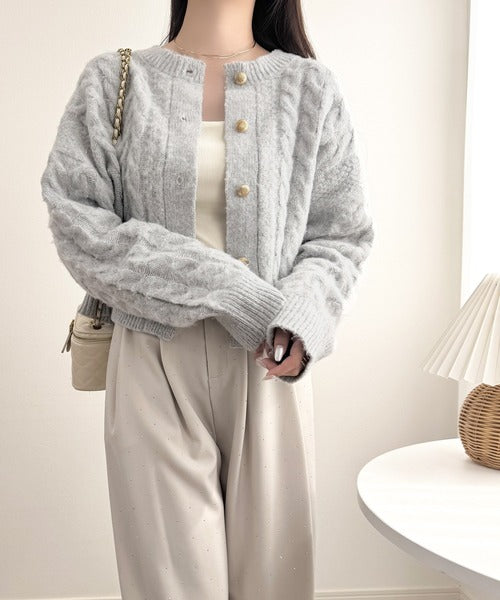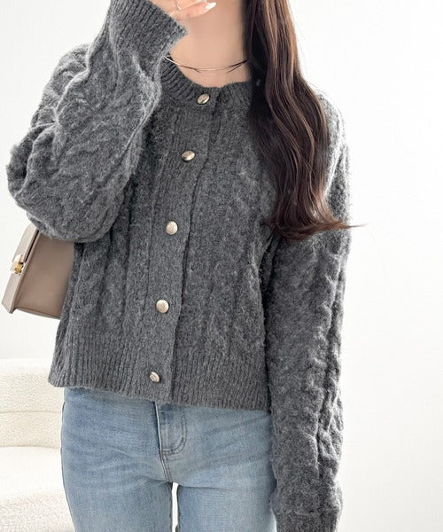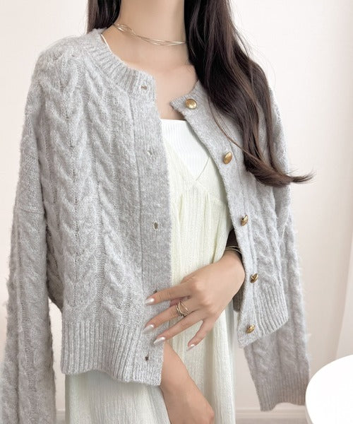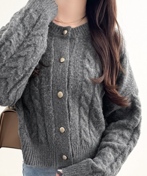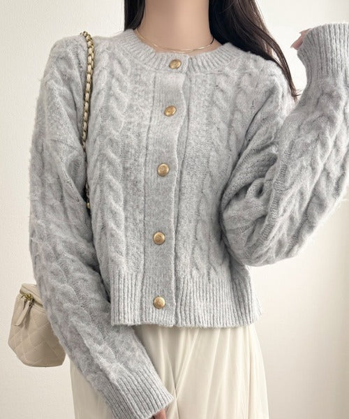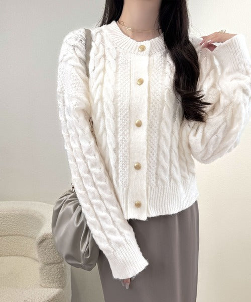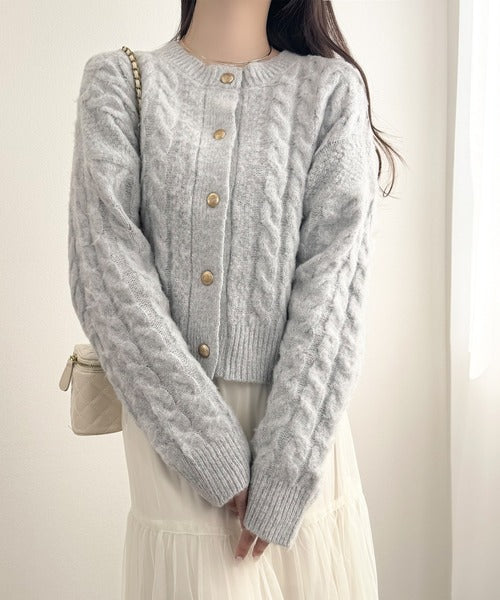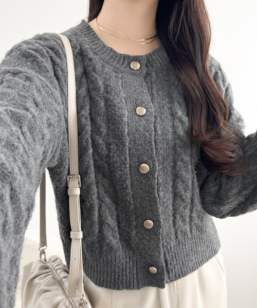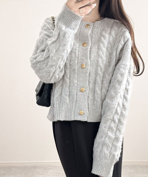 【mily bilet】ふわっと可愛く、きらっと上品。エンブレムボタンケーブルシャギーニットカーディガン(長袖) mi1329044