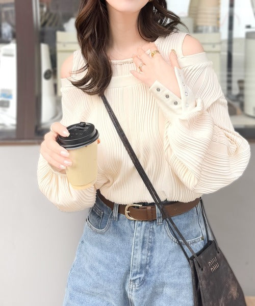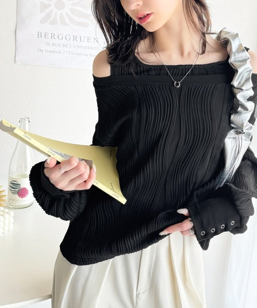 華やかな印象を与えるこのトップスは、さりげないオフショルデザインが魅力的!