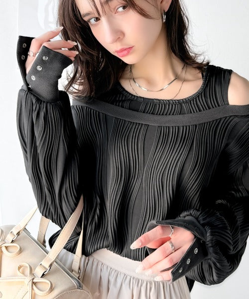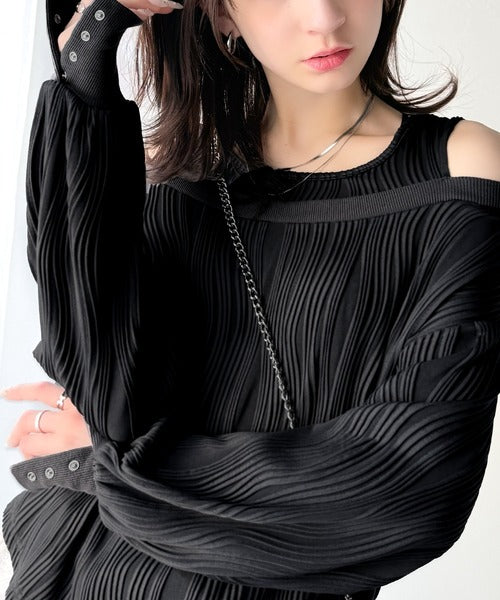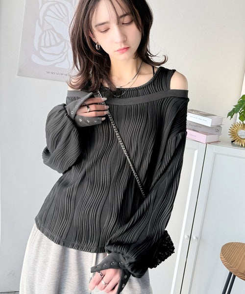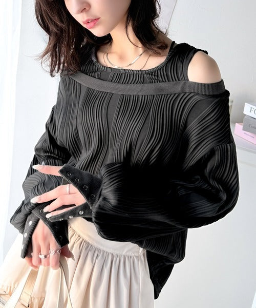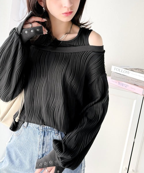 ウェーブ柄生地とレイヤード風デザインデザインのトップス。