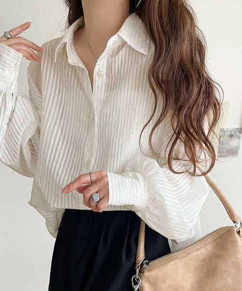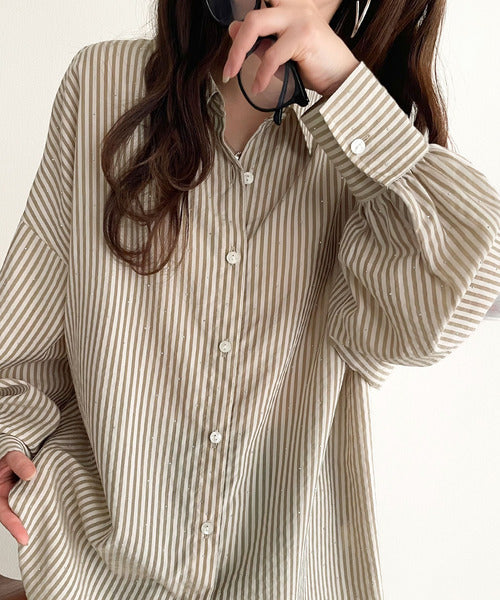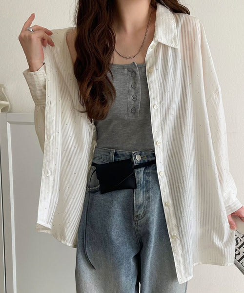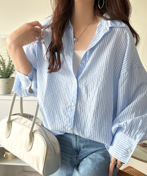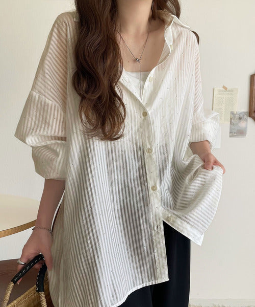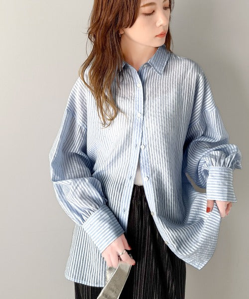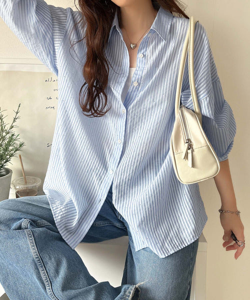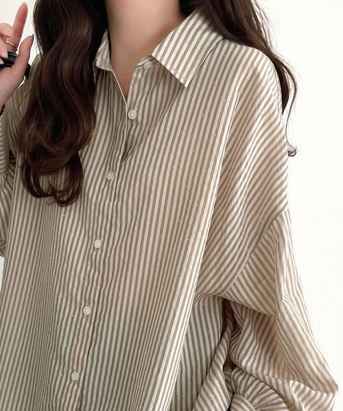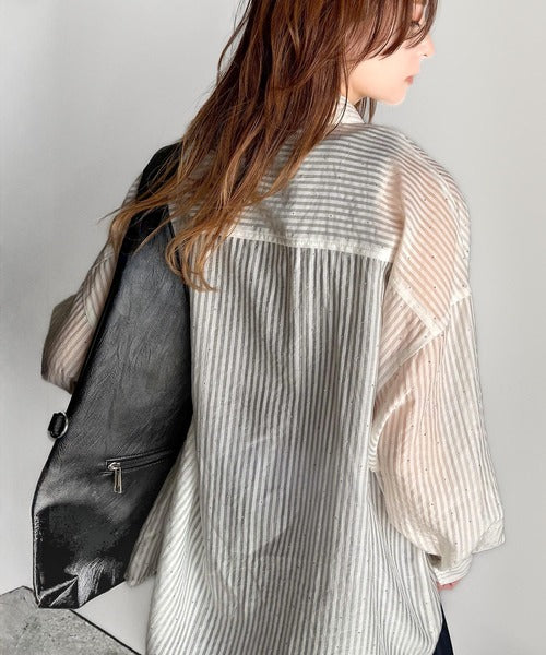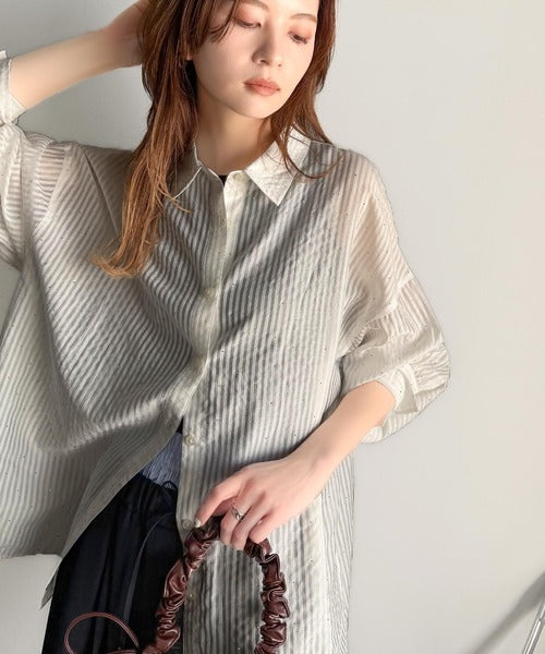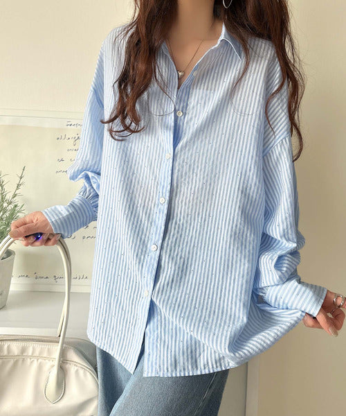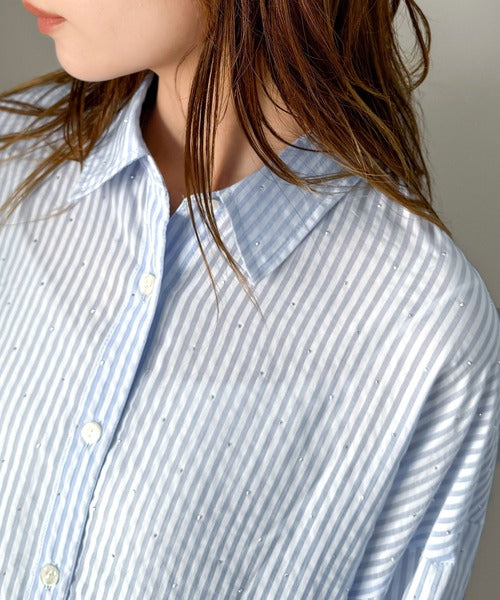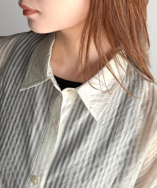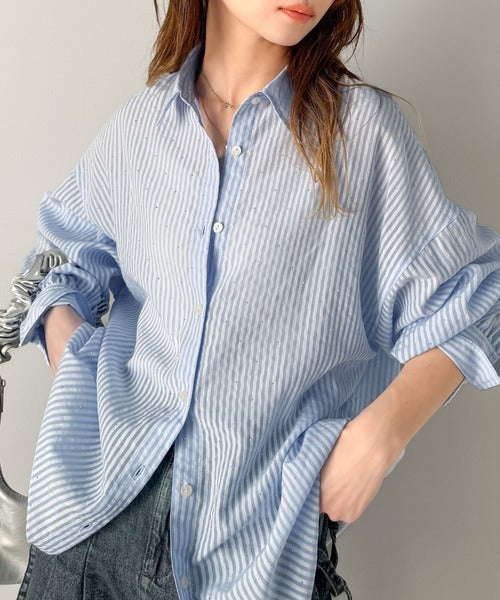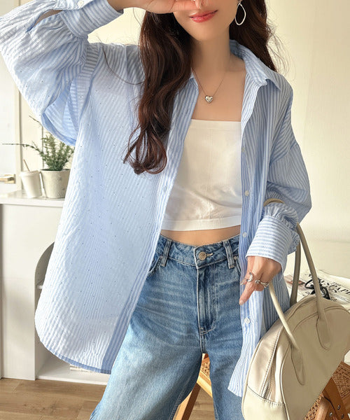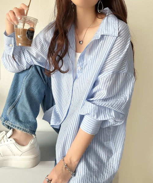 今季らしく着こなせる♪ラインストーンつきオーバーサイズシアーストライプシャツ(長袖) ce1010416