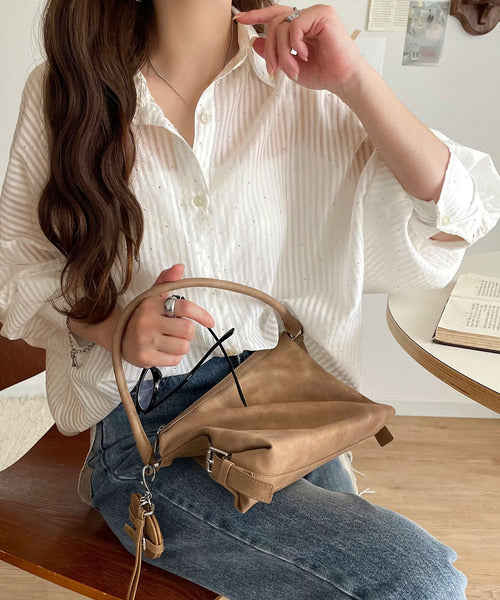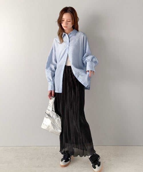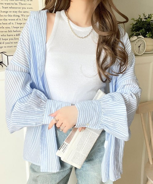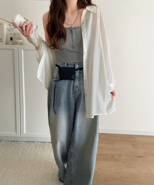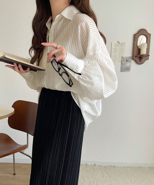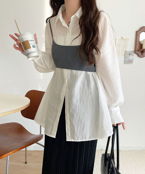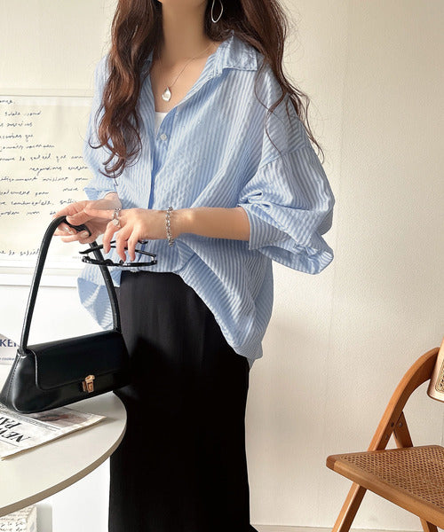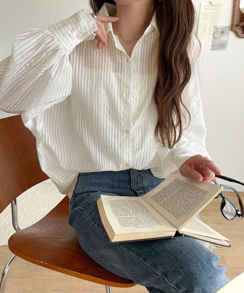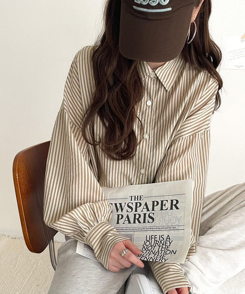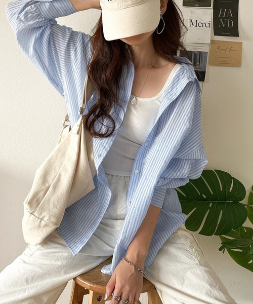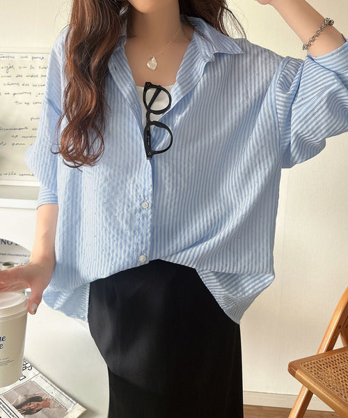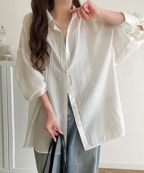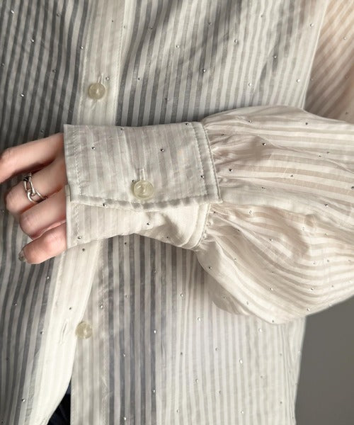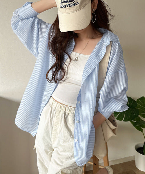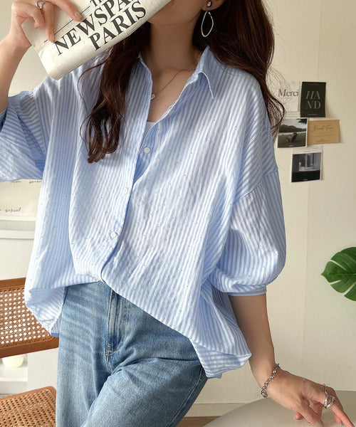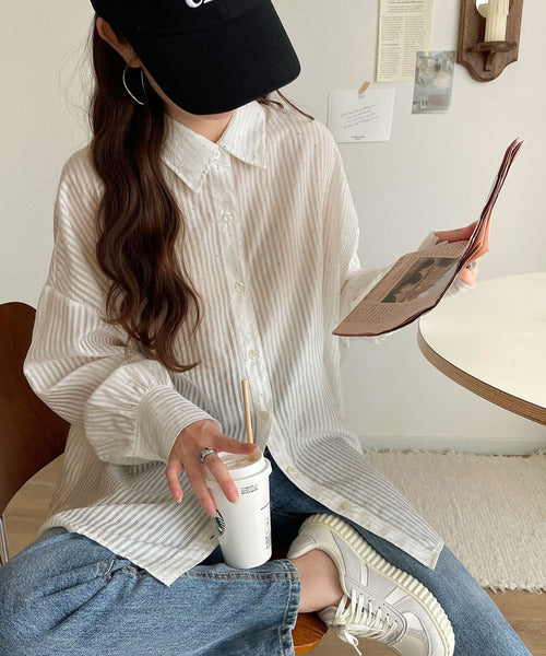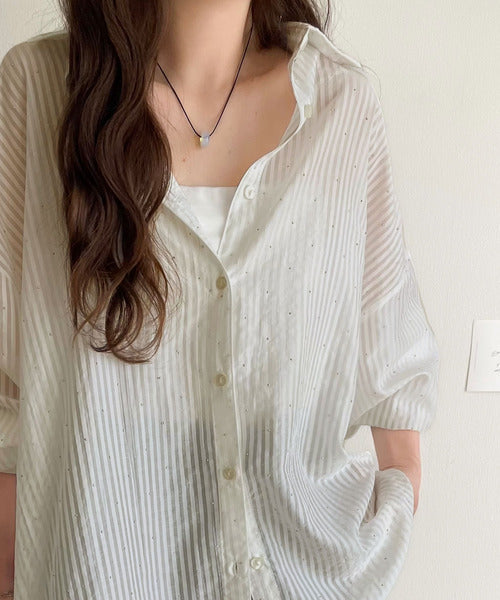 今季らしく着こなせる♪ラインストーンつきオーバーサイズシアーストライプシャツ(長袖) ce1010416